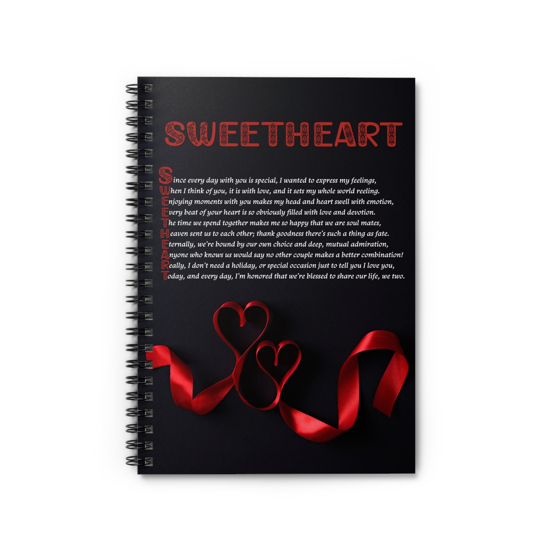 Take a look at the It's Just a Phrase Spiral Notebook Collection from Moments in Rhyme. This notebook includes an acrostic poem that spells out Sweetheart and a cute ribbon heart graphic. It’s a thoughtful birthday, Valentine’s, Christmas, or everyday gift to show someone you care. Use it for shopping lists, recipes, or journaling. The sturdy printed cover keeps it safe wherever you go, and the gorgeous font helps it stand out. It comes with a dark grey back cover and 59 double-sided sheets.