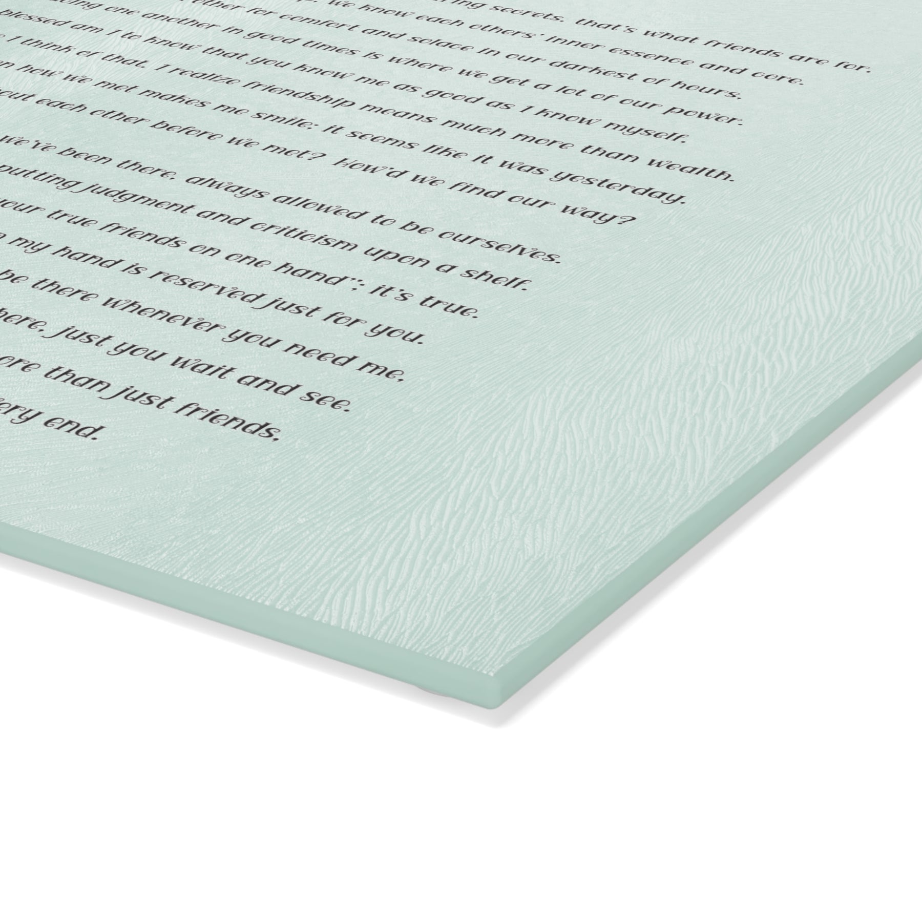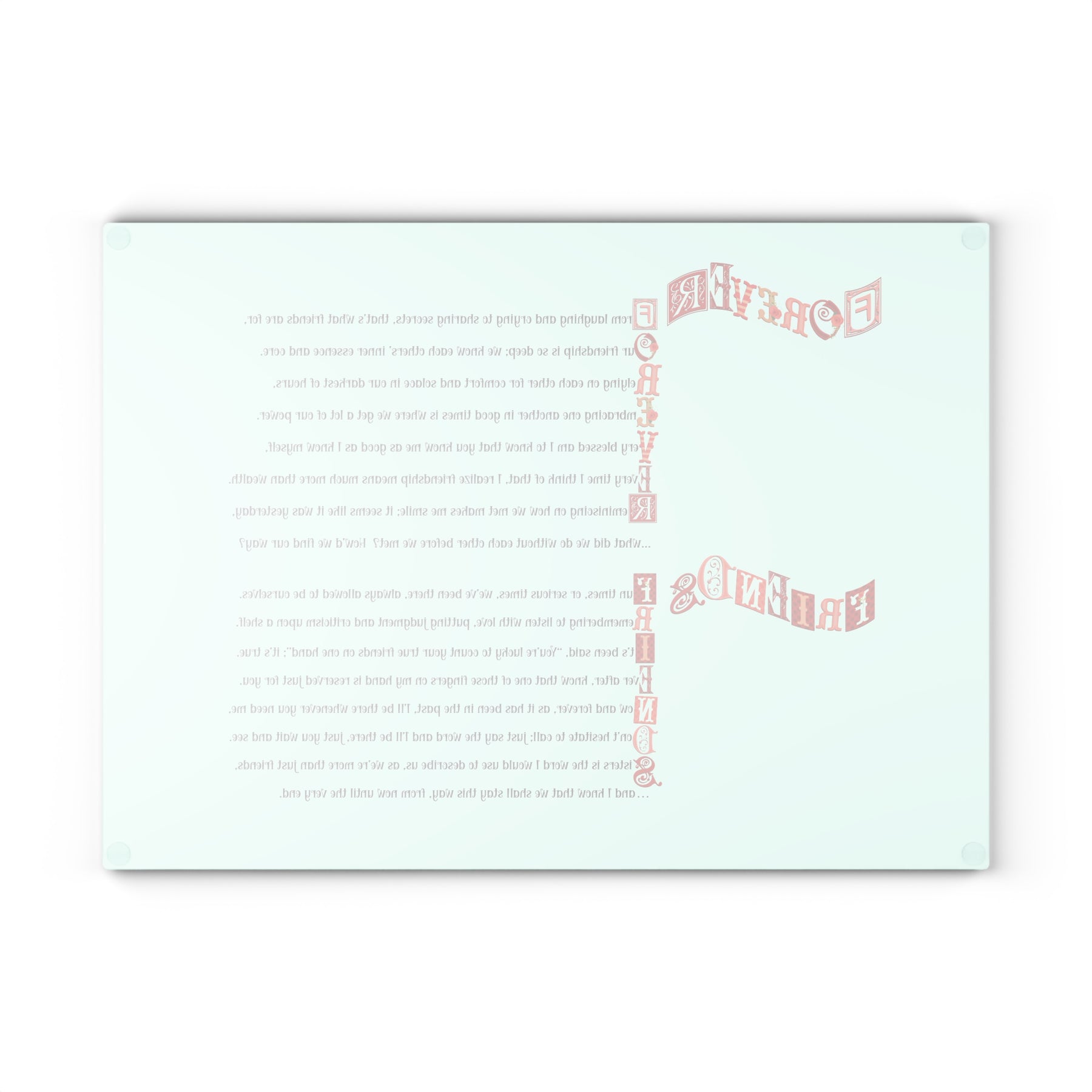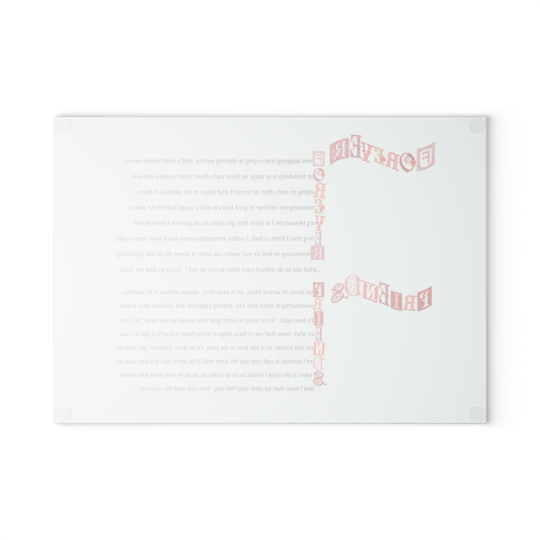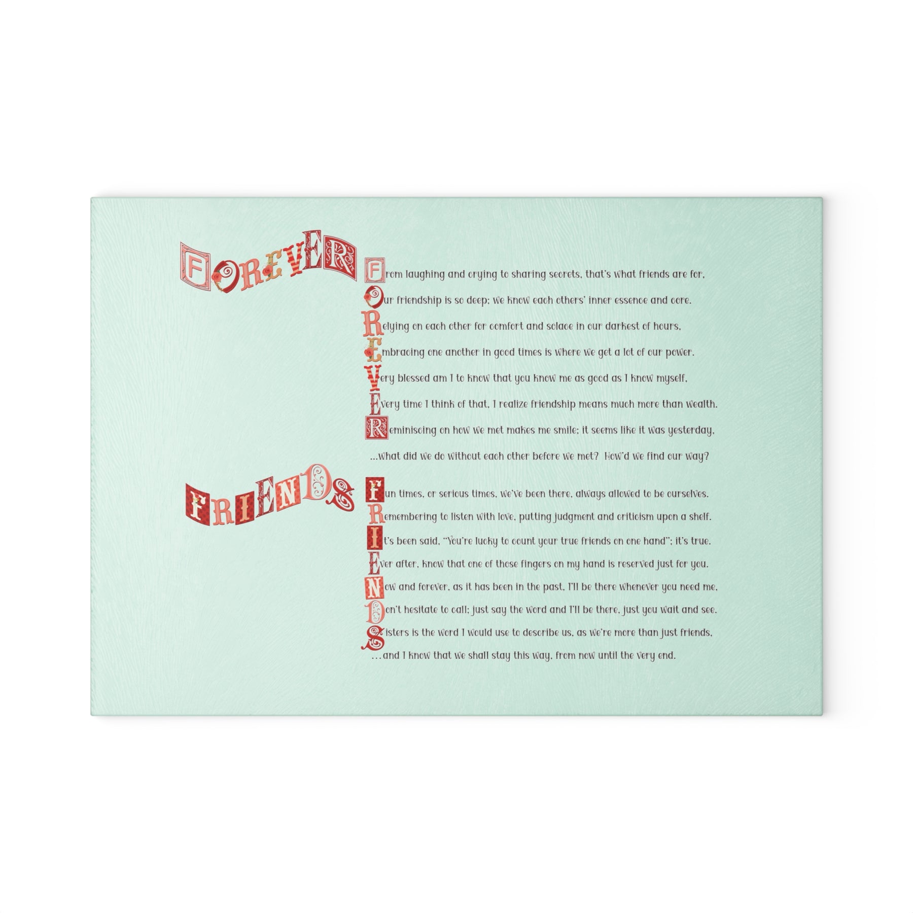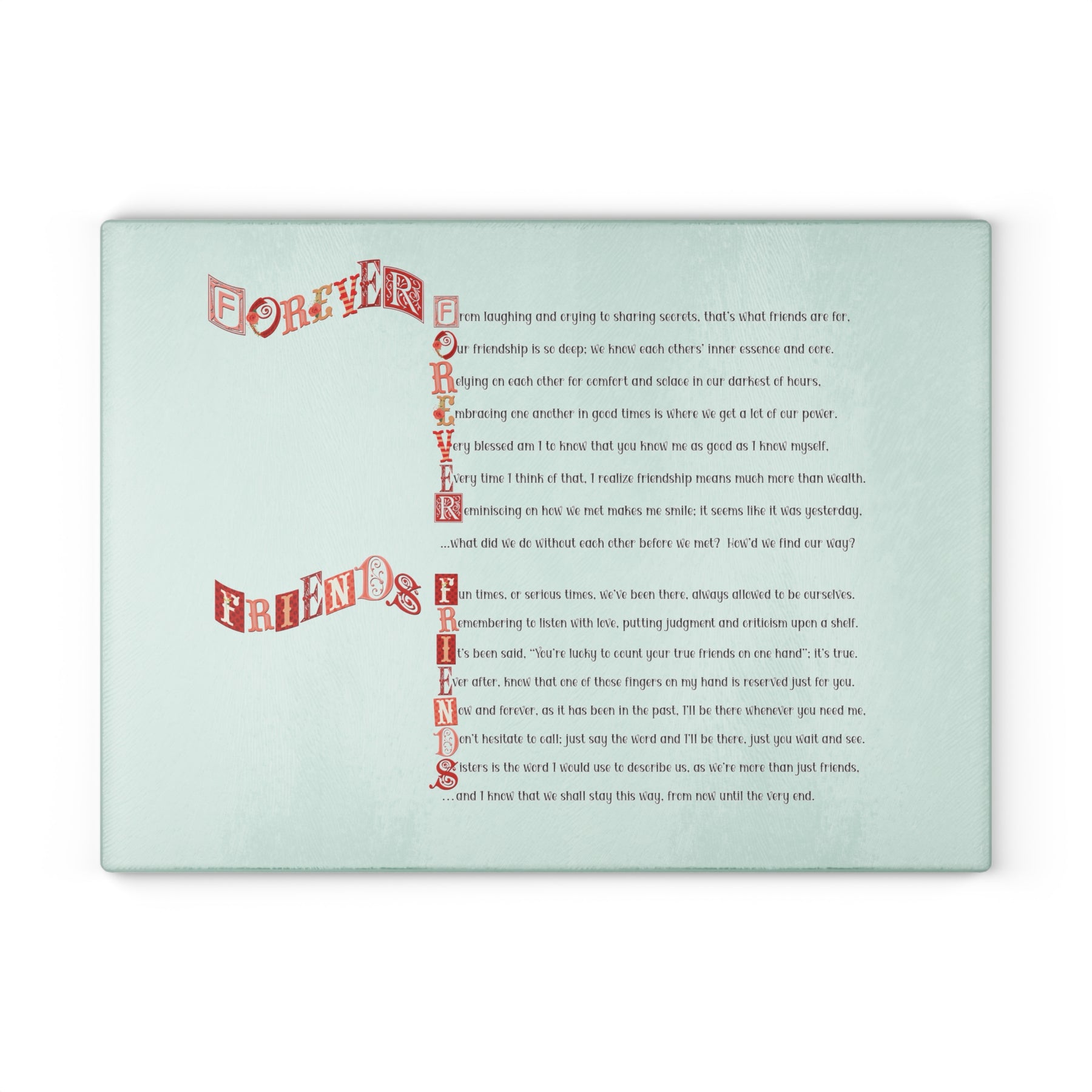 Moments in Rhyme presents our It's Just a Phrase "Forever Friends" Glass Cutting Board. In addition to celebrating friendship, this acrostic poem glass cutting board brings a touch of character into any kitchen. Its tempered glass material is robust and helps prepare many a tasty meal for a long time to come. The textured surface makes it an ideal chopping, slicing, and dicing area. Available in two sizes: 8" x 11" and 11" x 15".
