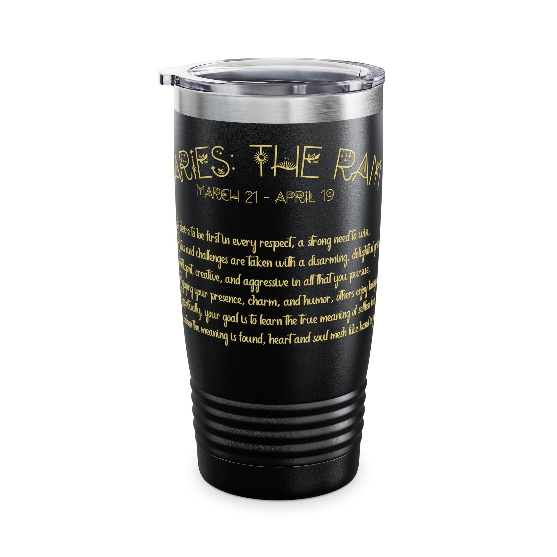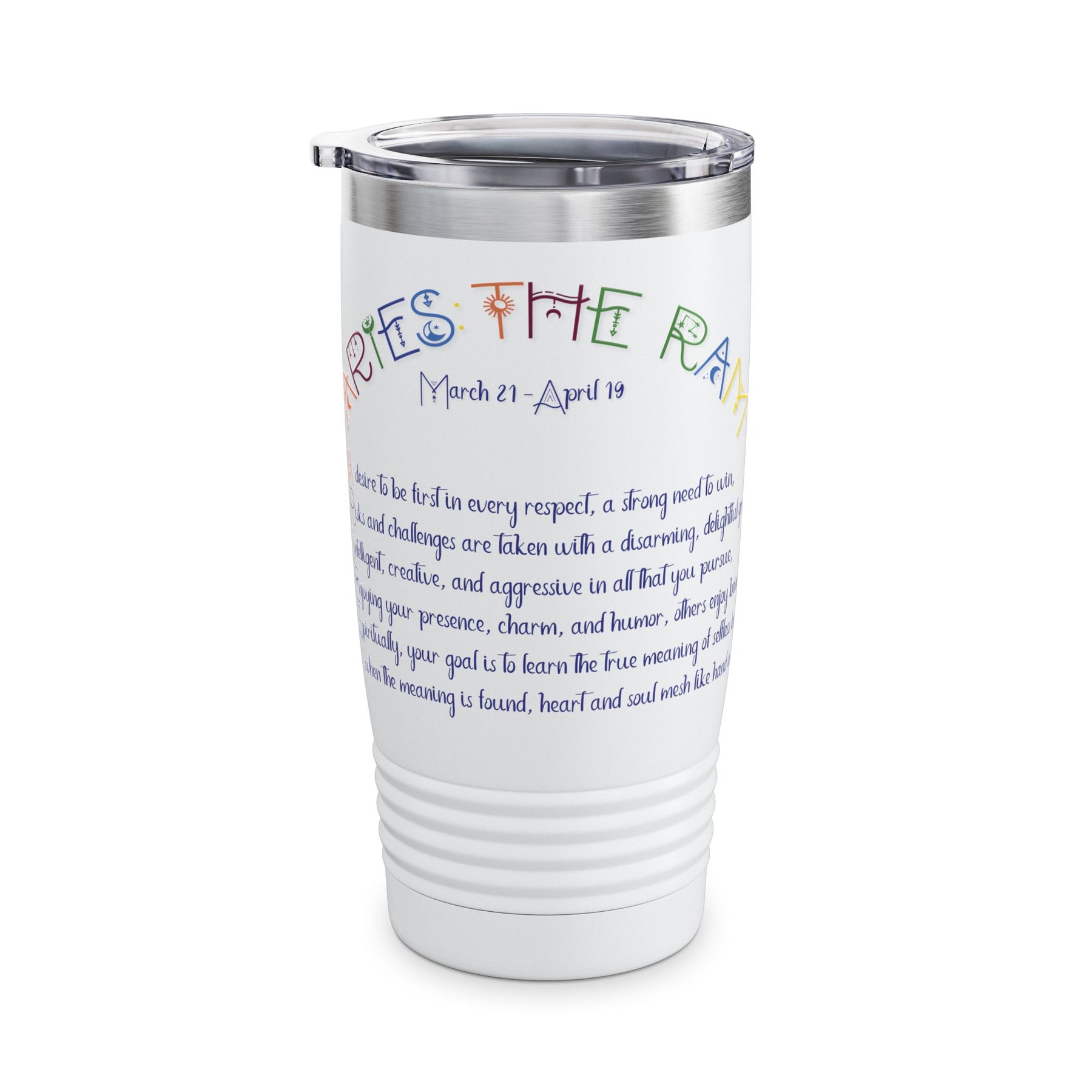 Our Written in the Stars Acrostic Poem Tumbler features an acrostic poem that highlights the traits and goals associated with the Aries zodiac sign, making it a fun and practical accessory. This tumbler helps minimize plastic waste, is spill-resistant, fits in car cup holders, and keeps drinks at the right temperature on road trips. It is ideal for astrology enthusiasts or as a unique gift for birthdays or astrology-themed celebrations. It has a creative design, double-wall insulation for temperature control, and a spill-resistant sliding lid with a rubber gasket. Made from stainless steel. Hand-wash only.