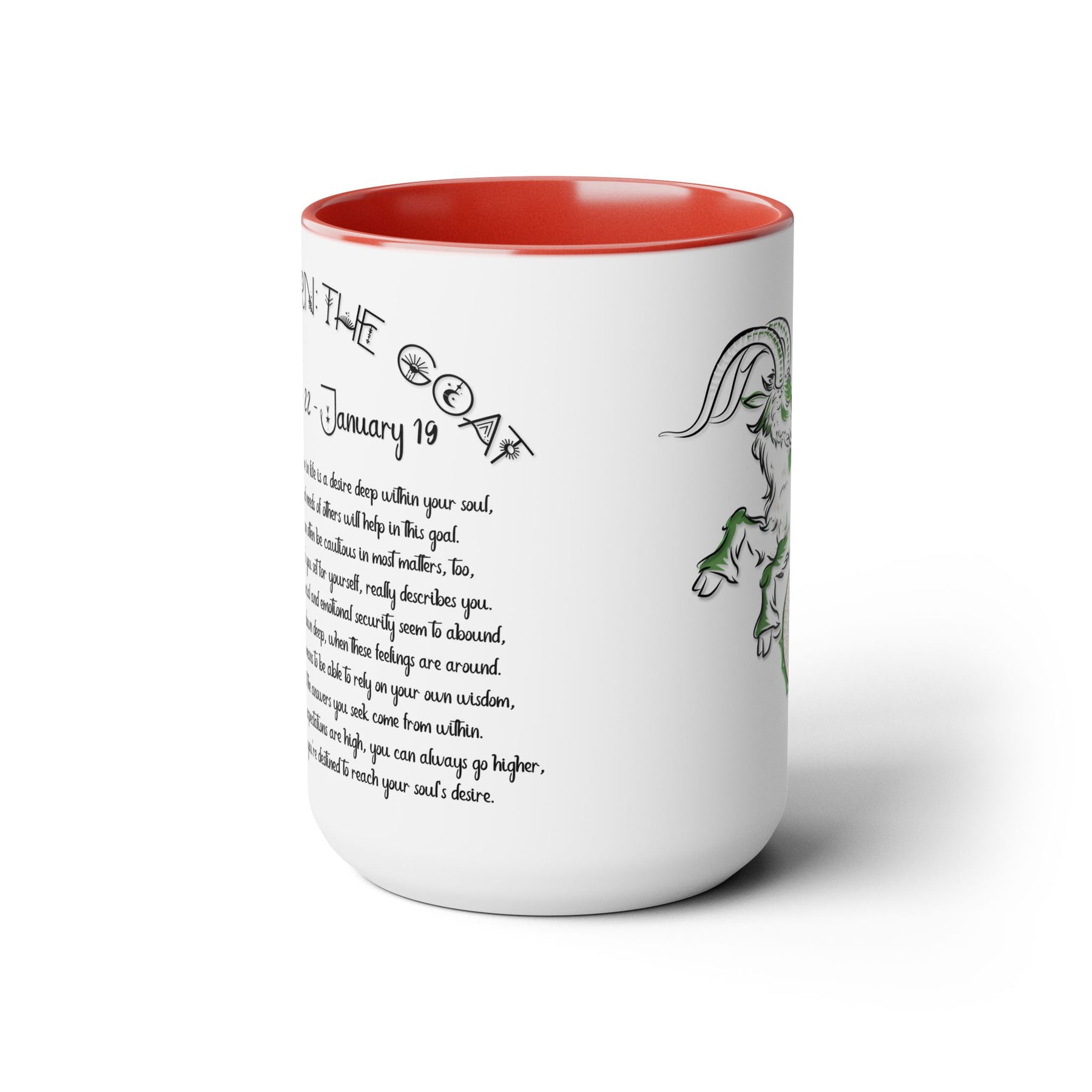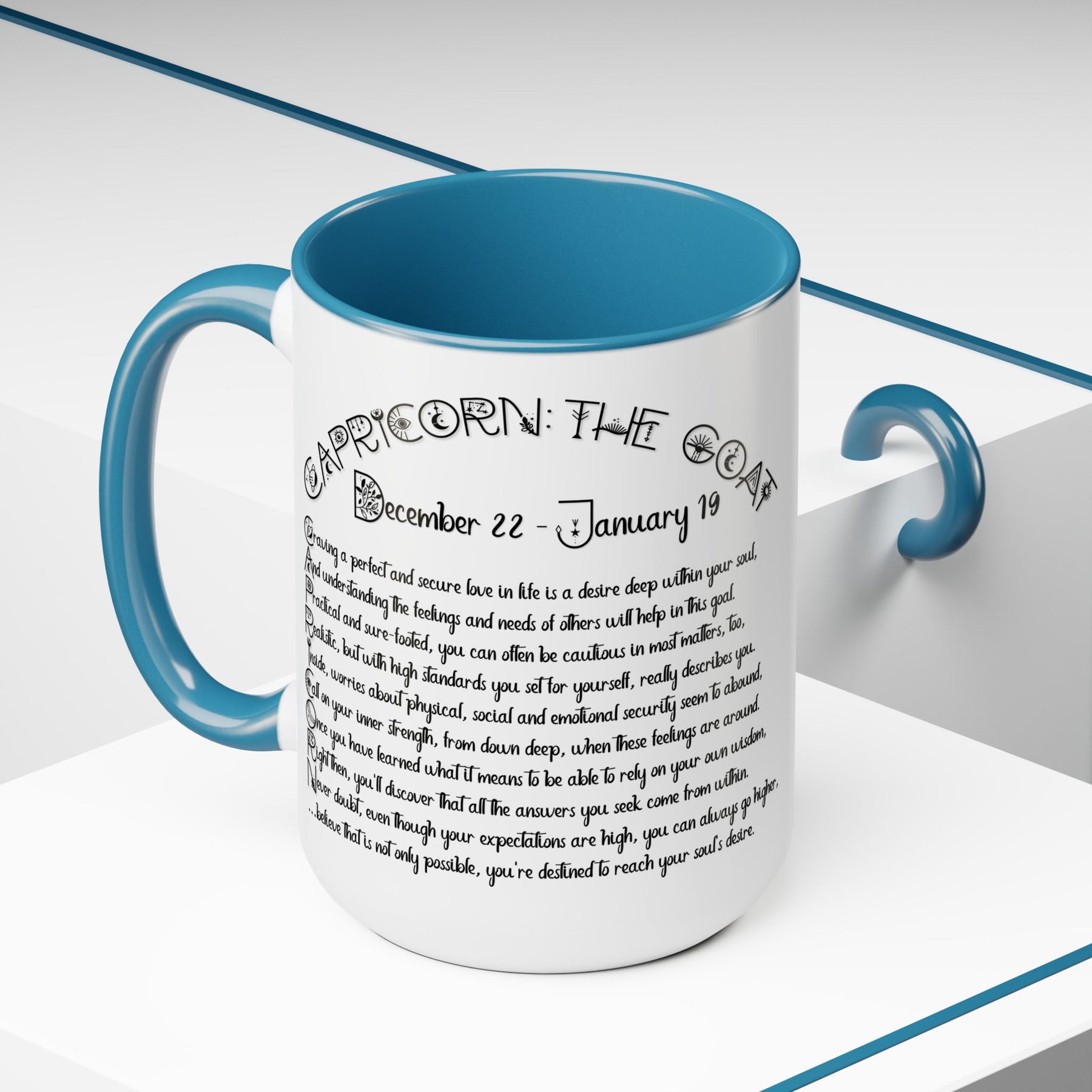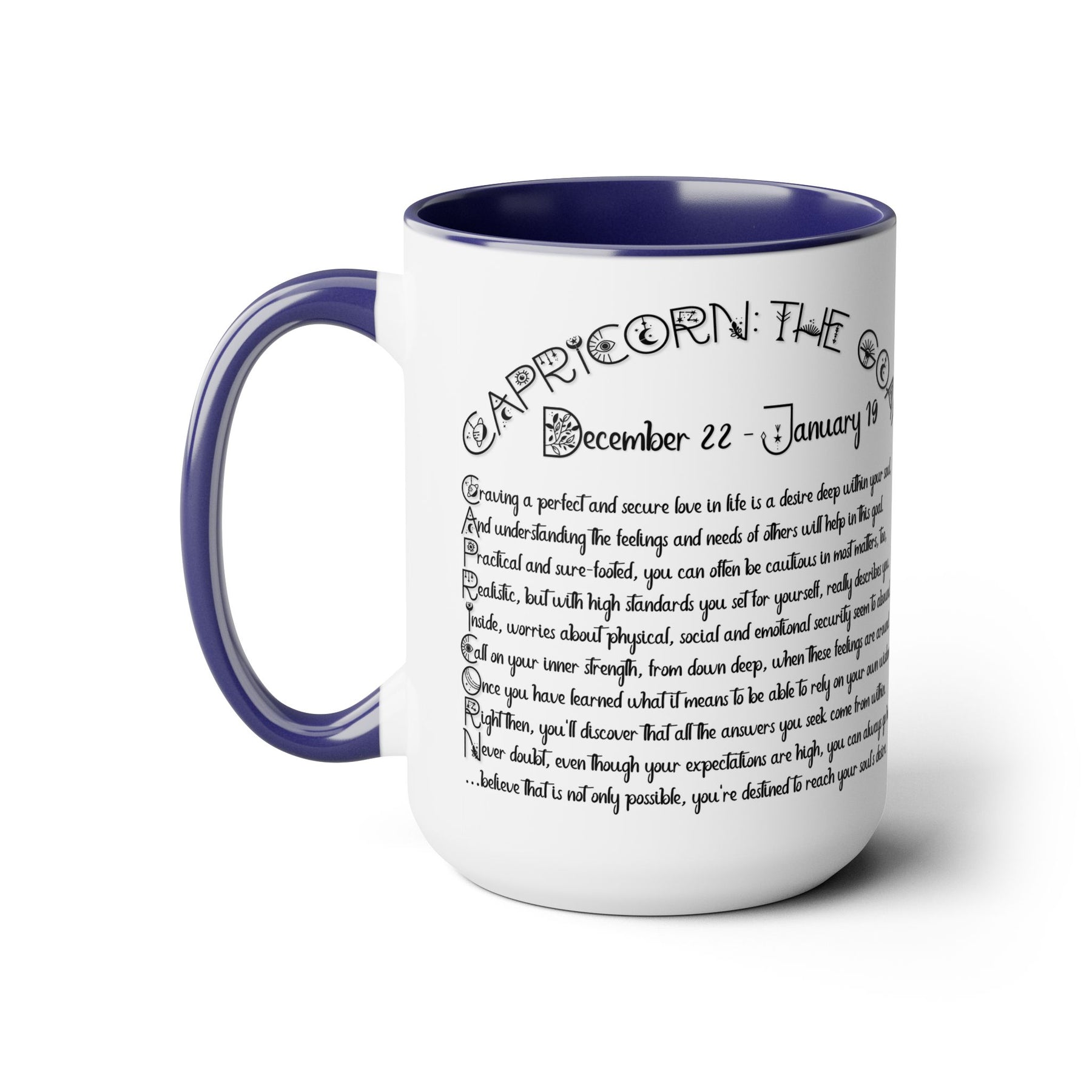 Here to bring big gulps of coffee and style, our Written in the Stars two-tone coffee mugs help people around the world start their day just right. This mug features an acrostic poem that spells out Capricorn with traits and purpose included.