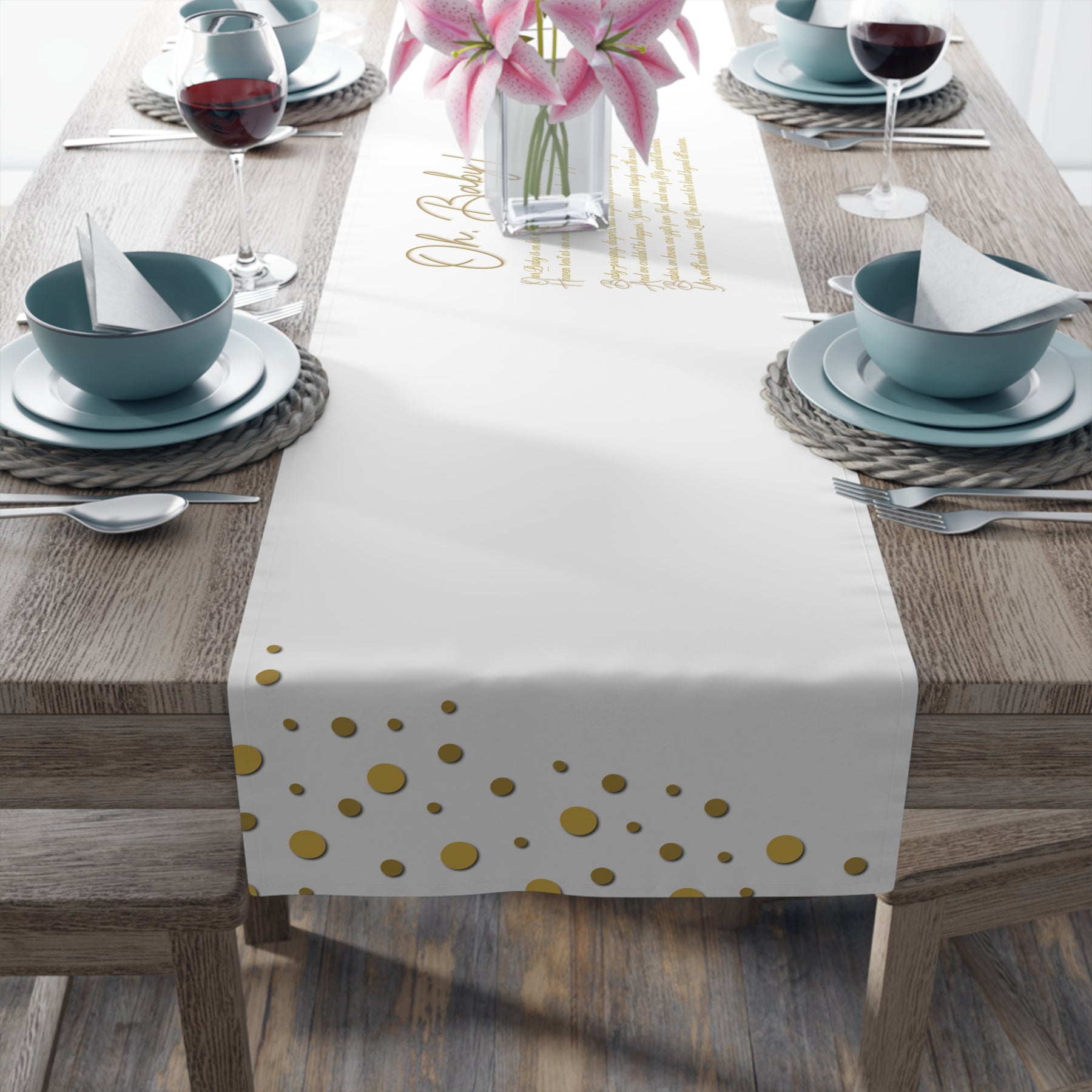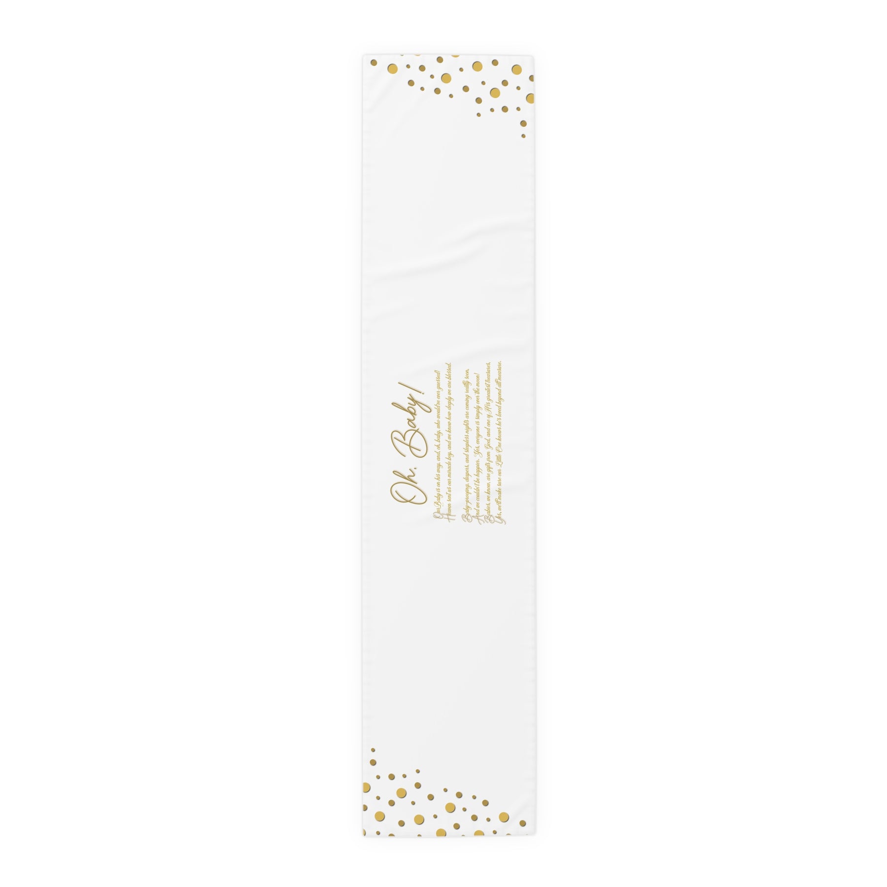 Add warmth and creativity to any baby shower with this beautiful Baby Steps acrostic poem table runner. The design features an acrostic poem that spells out Oh, Baby and heartfelt prose. The adorable design and font make it a unique addition to any party celebrating a newborn's arrival. Perfect for adding a pop to the table setting, this runner creates a fun atmosphere. You can find the perfect fit for the table, with two size options for convenience. Care instructions: machine wash cold on a gentle cycle with mild detergent. Do not bleach. Line dry.