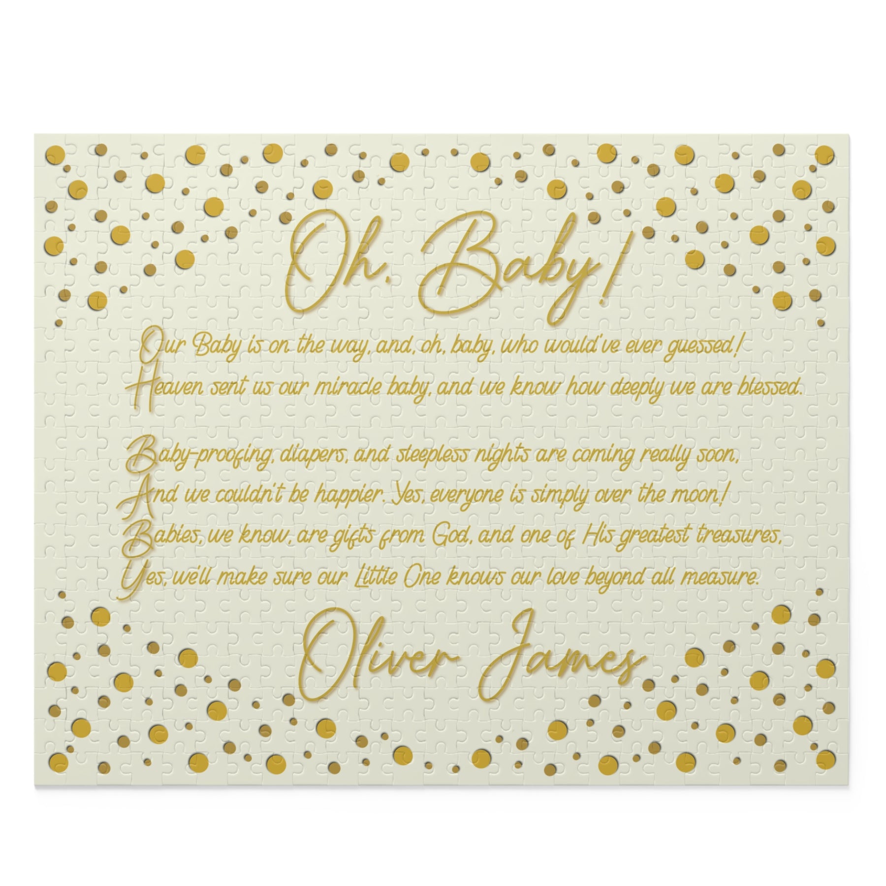 Our Baby Steps puzzle from Moments in Rhyme features the acrostic phrase Oh, Baby! It’s a great way to keep your baby shower guests entertained, and they’ll love it. This puzzle also makes a special keepsake or a gift for a new mom. It comes in two sizes, is made from sturdy puzzle board with a glossy finish, and arrives in a gift-ready box that highlights the design. To personalize, add your mother’s first name at checkout. A $5.00 personalization fee will be added to your cart.