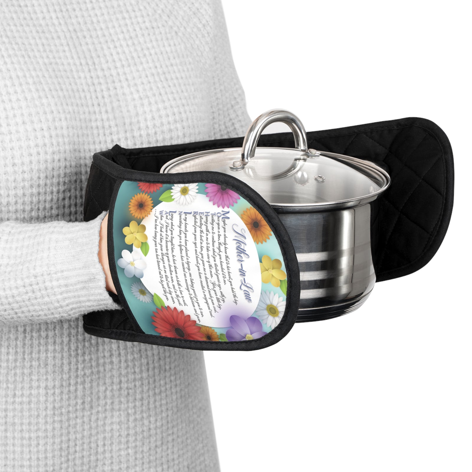 Nothing's too hot for these Moments in Rhyme oven mitts except their own custom style. With a poly print area and cotton construction, these unique oven mitts are slip-resistant, heat-insulated, and designed with meaningful acrostic poems that make them as beautiful as they are functional.