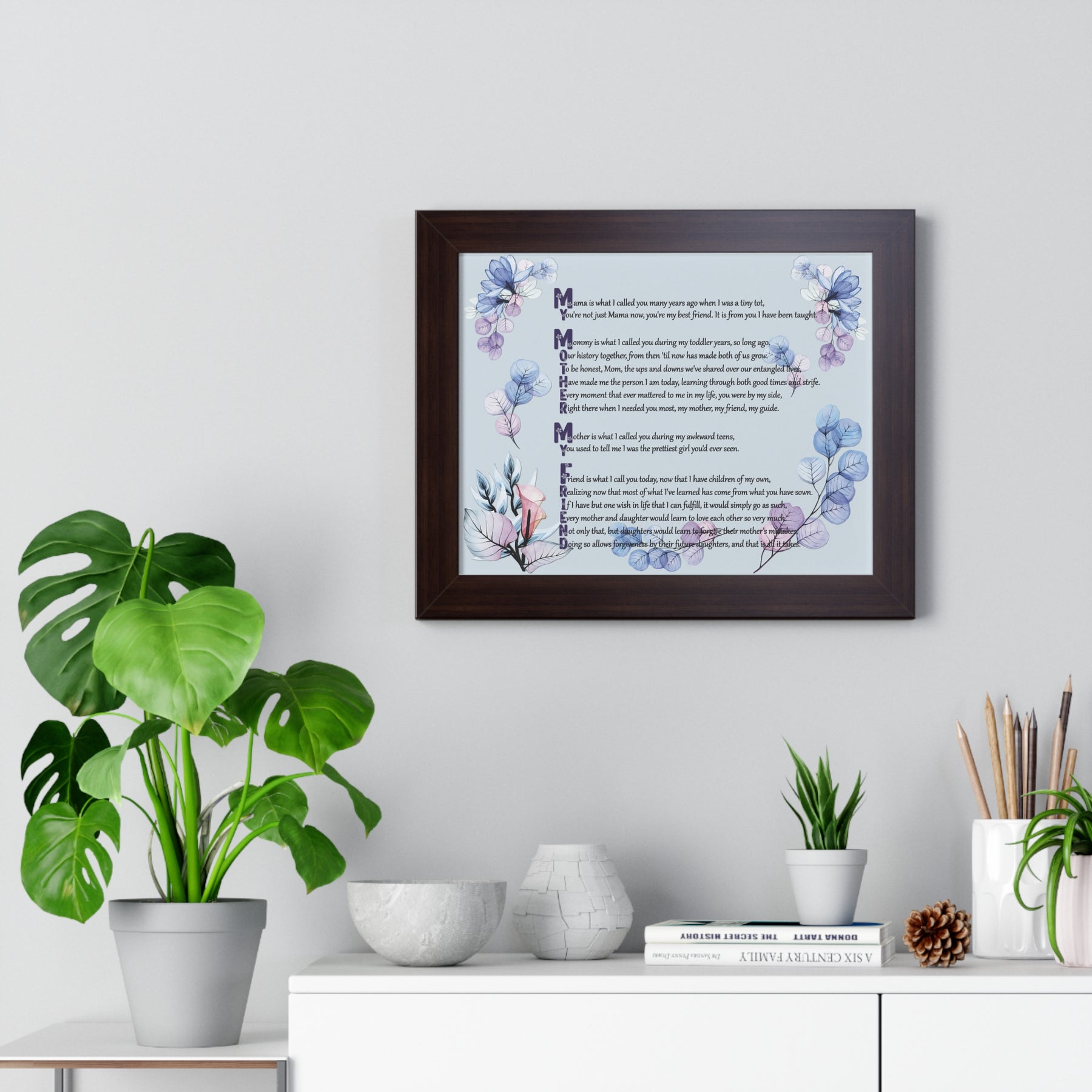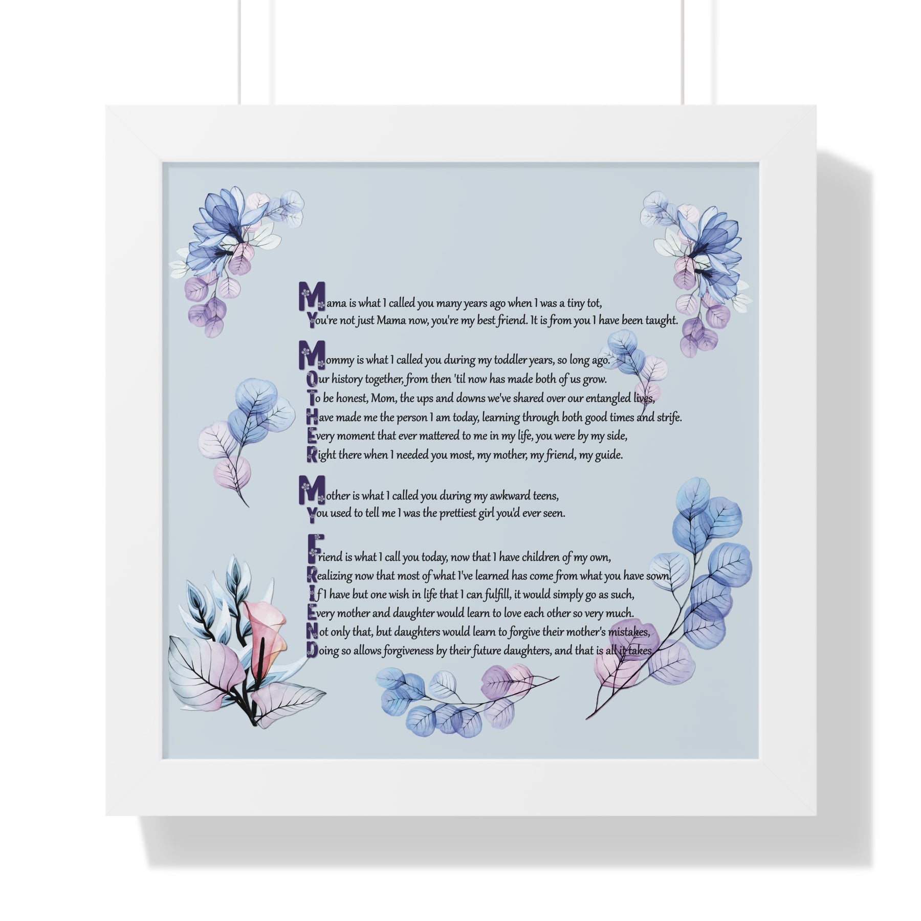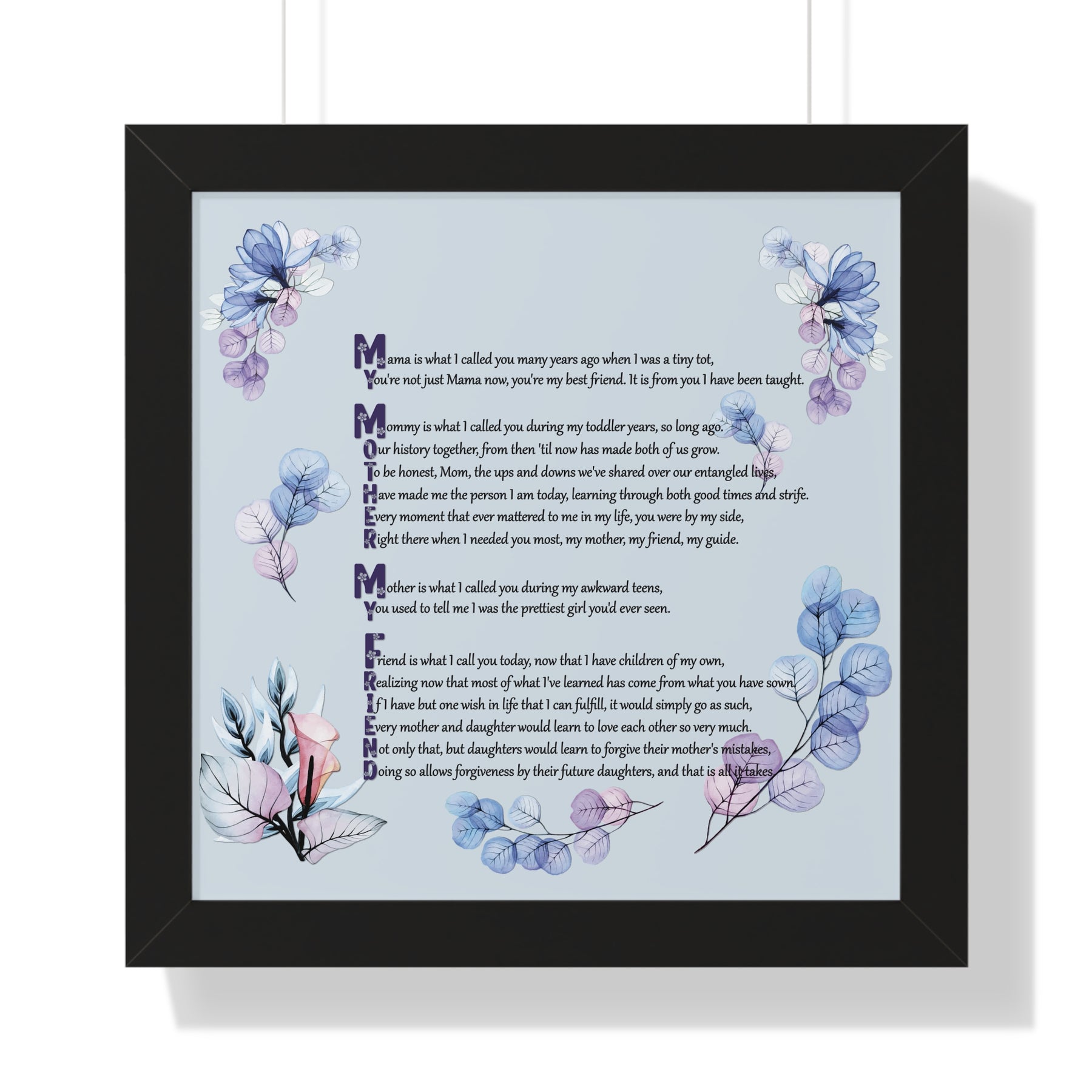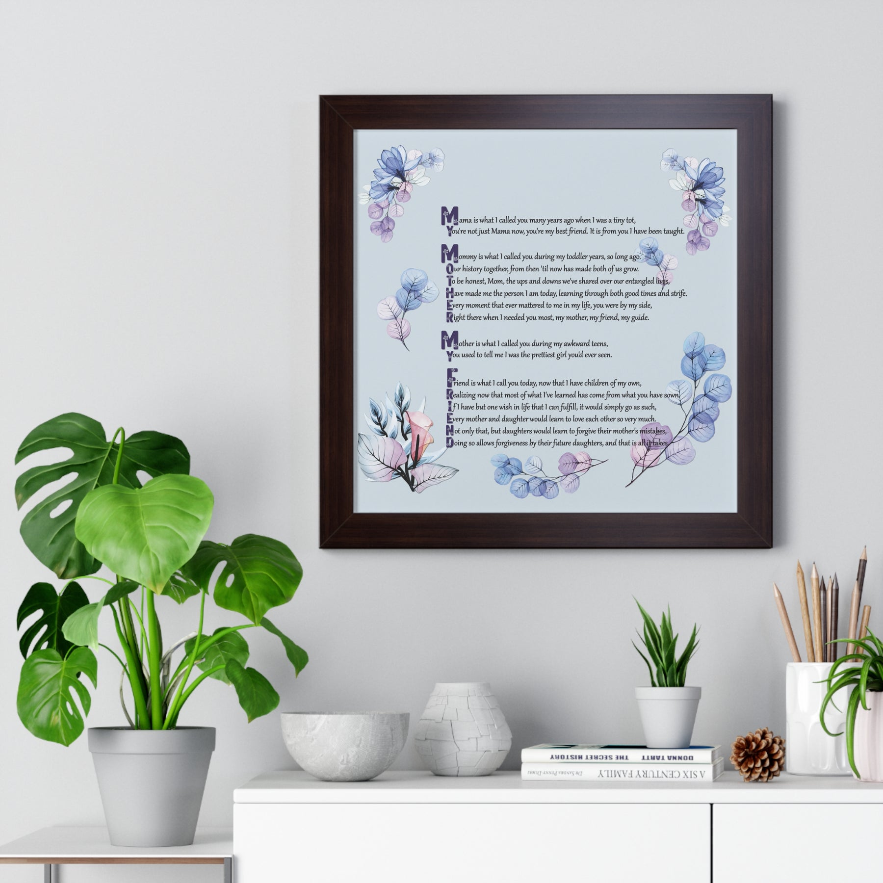 This beautiful Floral Acrostic framed print from our "It's Just a Phrase" product line spells out "My Mother My Friend". The acrostic poem reflects on how a mother and daughter go through life together. It is a perfect gift for Mother's Day, birthdays, or as a token of appreciation for your mother-in-law. The bright and intense colors of the floral design create a warm and inviting atmosphere, making it a lovely addition to any home decor. The museum-grade paper and protective acrylic cover ensure that the print will last for a long time. The pre-installed hanging hardware makes it easy to display and enjoy.