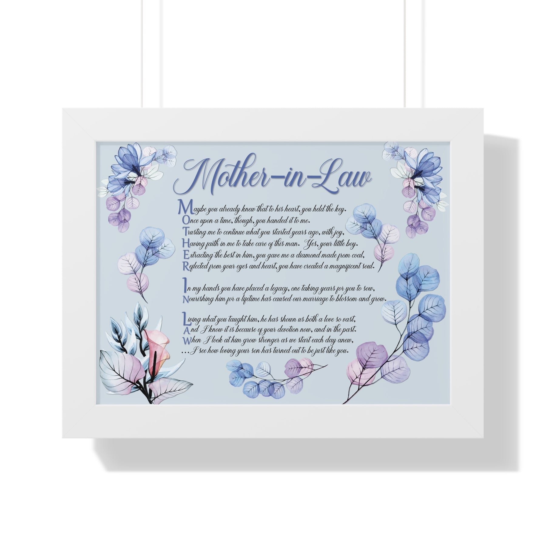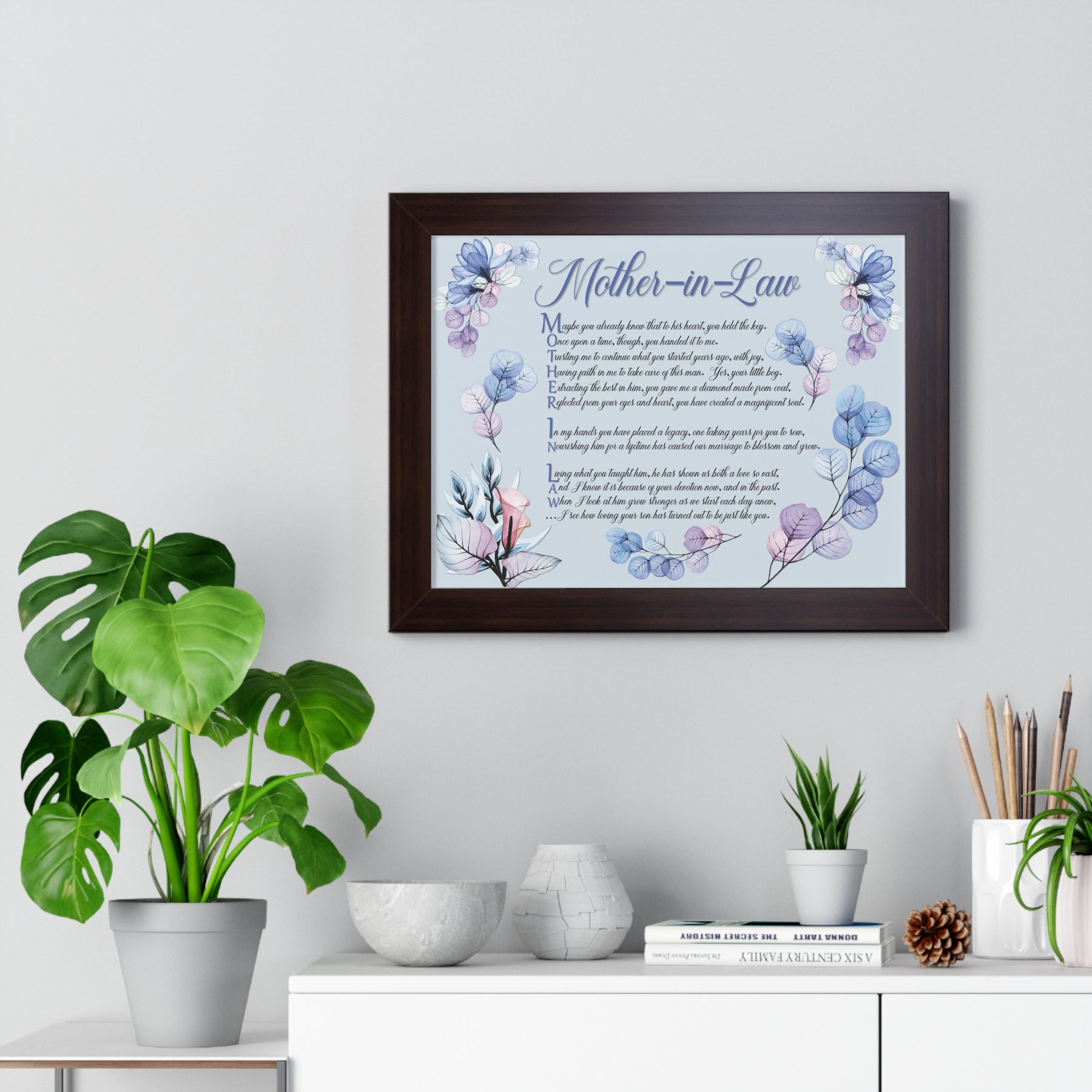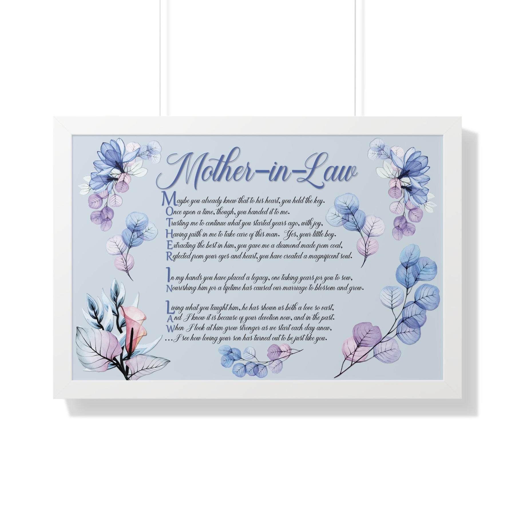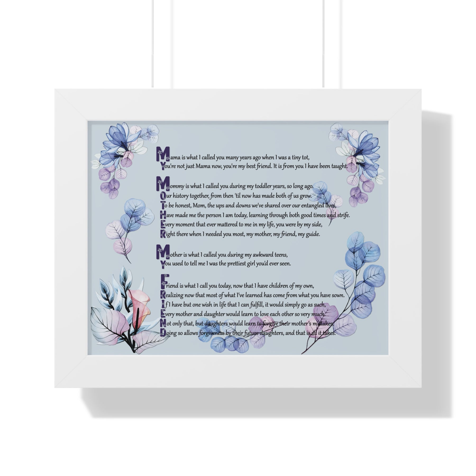 This beautiful Floral Acrostic framed print from our "It's Just a Phrase" product line spells out "My Mother My Friend". The acrostic poem reflects on how a mother and daughter go through life together. It is a perfect gift for Mother's Day, birthdays, or as a token of appreciation for your mother-in-law. The bright and intense colors of the floral design create a warm and inviting atmosphere, making it a lovely addition to any home decor. The museum-grade paper and protective acrylic cover ensure that the print will last for a long time. The pre-installed hanging hardware makes it easy to display and enjoy.