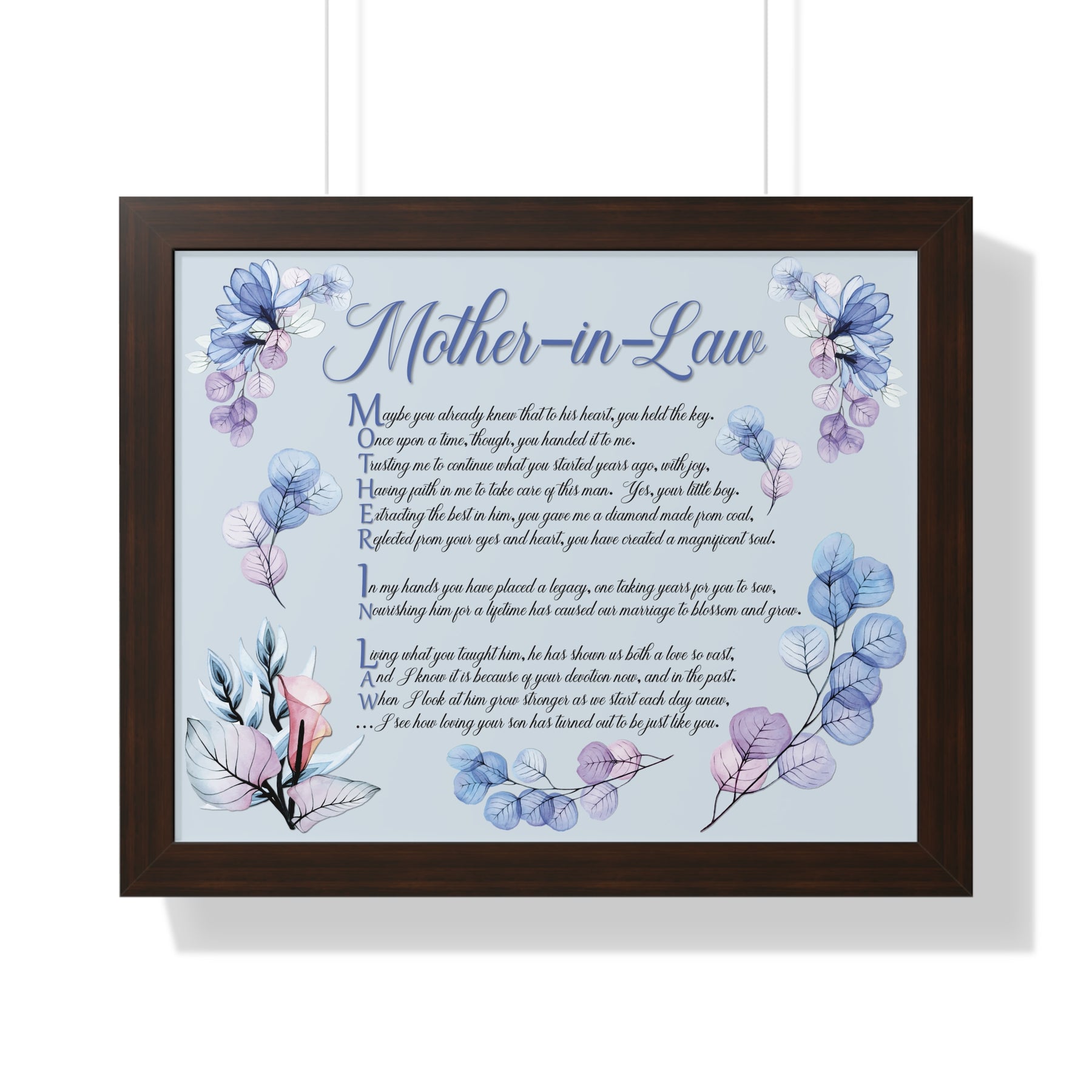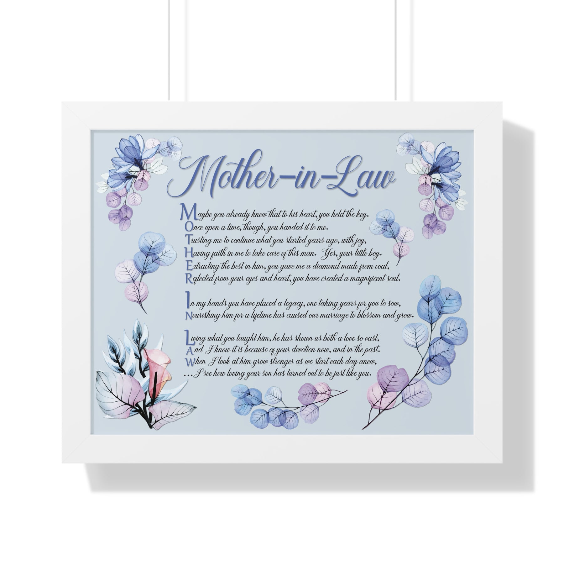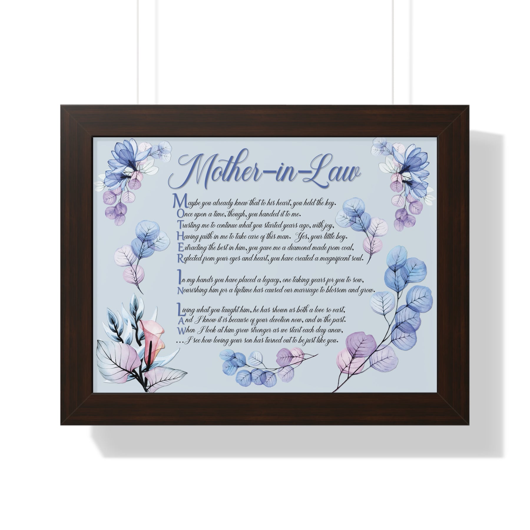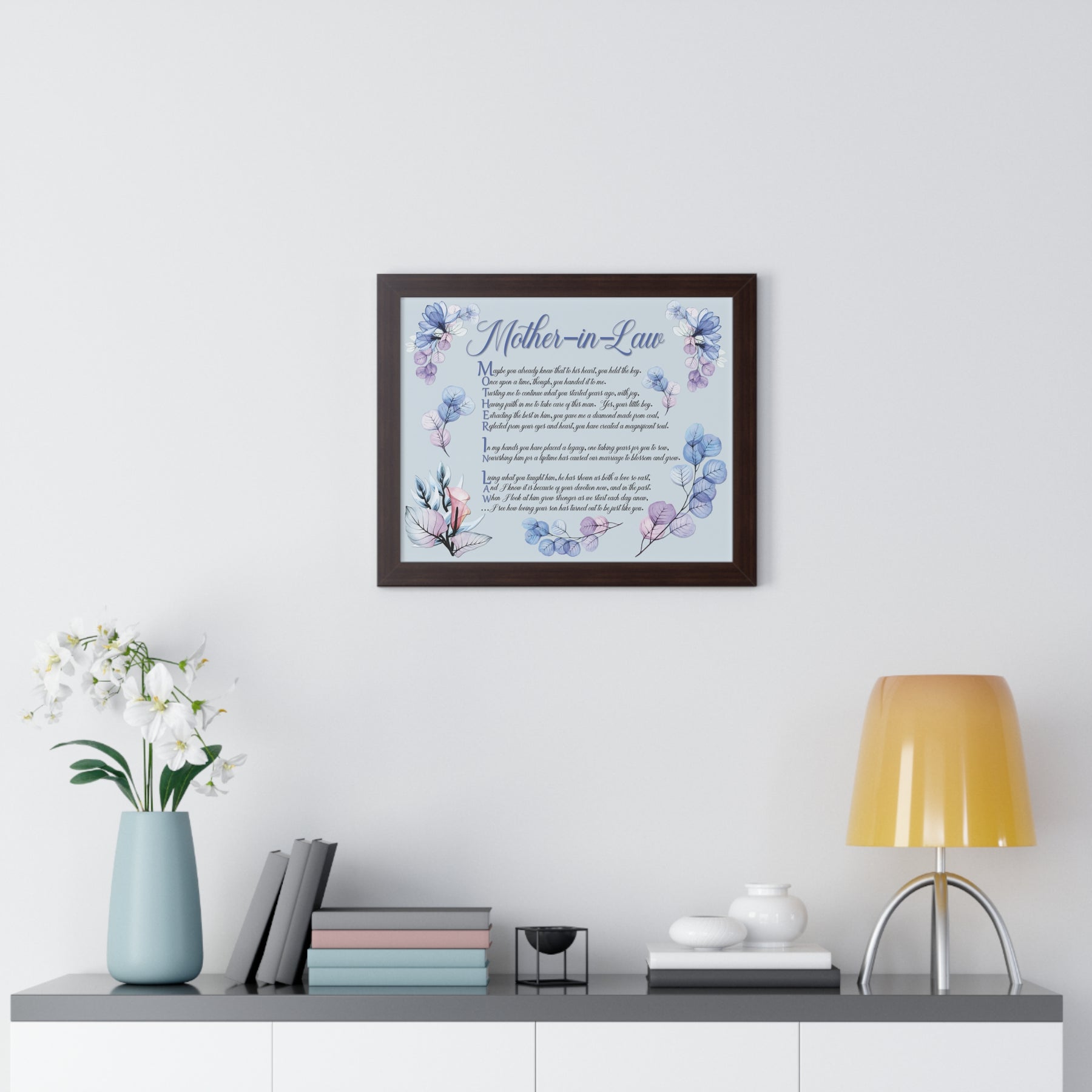 This beautiful Floral Acrostic framed print from our "It's Just a Phrase" product line spells out "My Mother My Friend". The acrostic poem reflects on how a mother and daughter go through life together. It is a perfect gift for Mother's Day, birthdays, or as a token of appreciation for your mother-in-law. The bright and intense colors of the floral design create a warm and inviting atmosphere, making it a lovely addition to any home decor. The museum-grade paper and protective acrylic cover ensure that the print will last for a long time. The pre-installed hanging hardware makes it easy to display and enjoy.