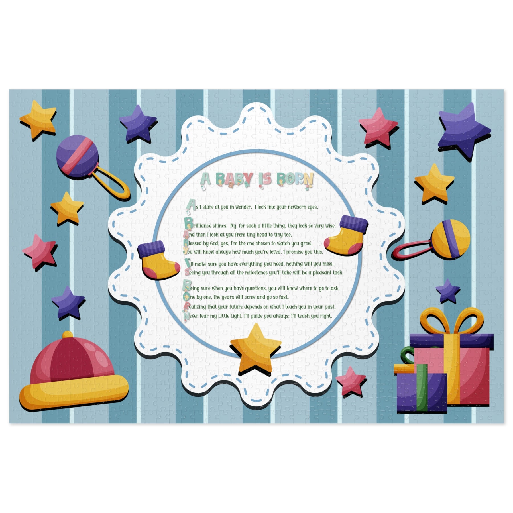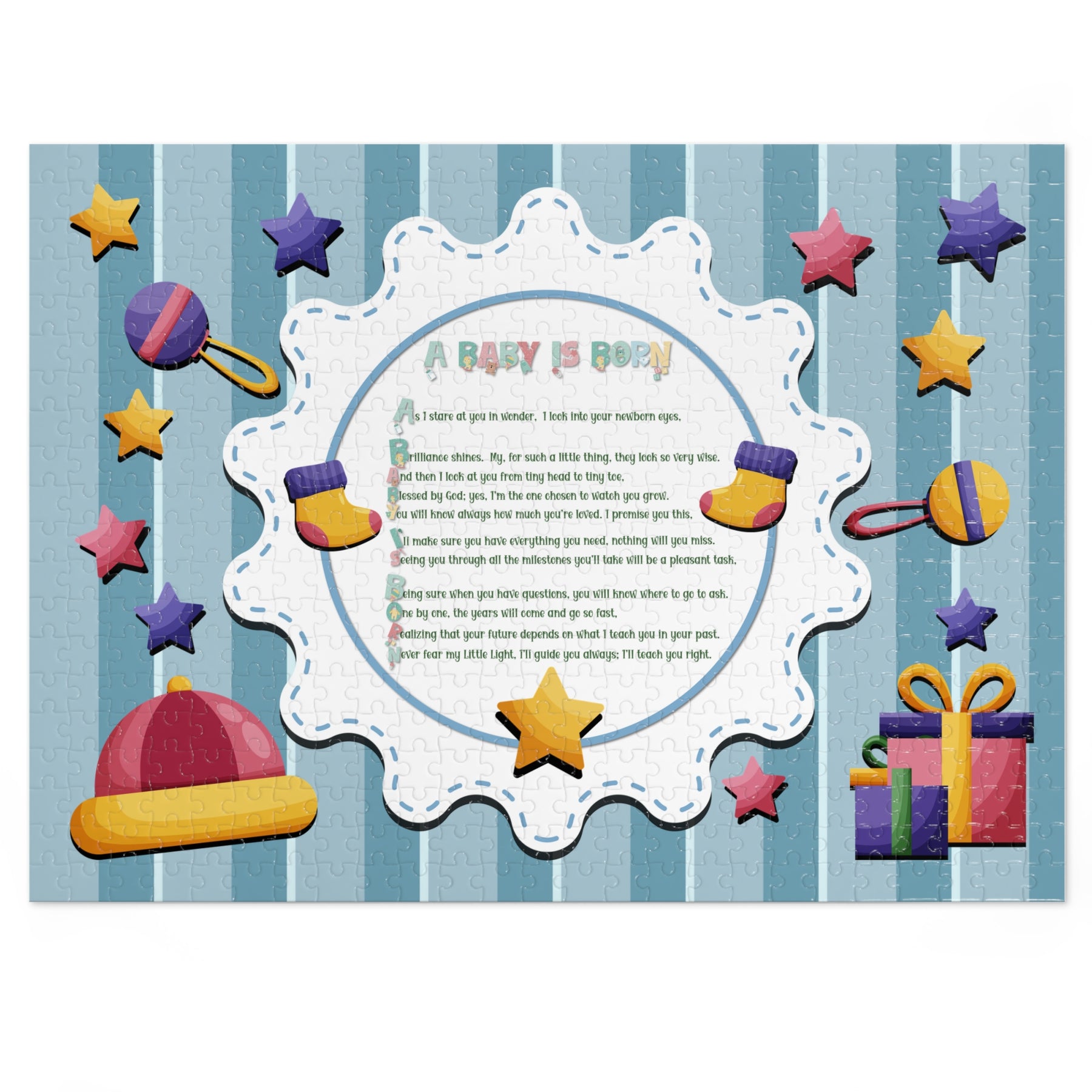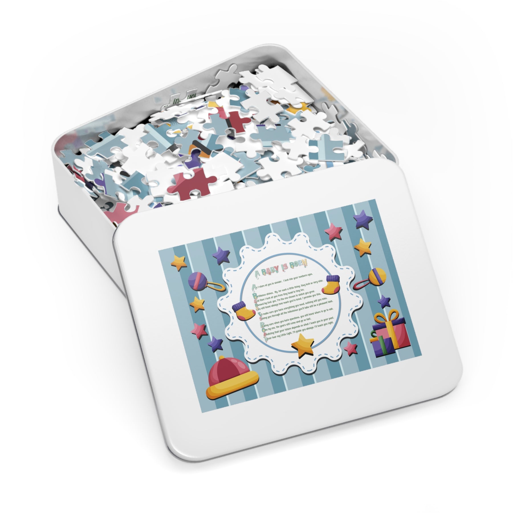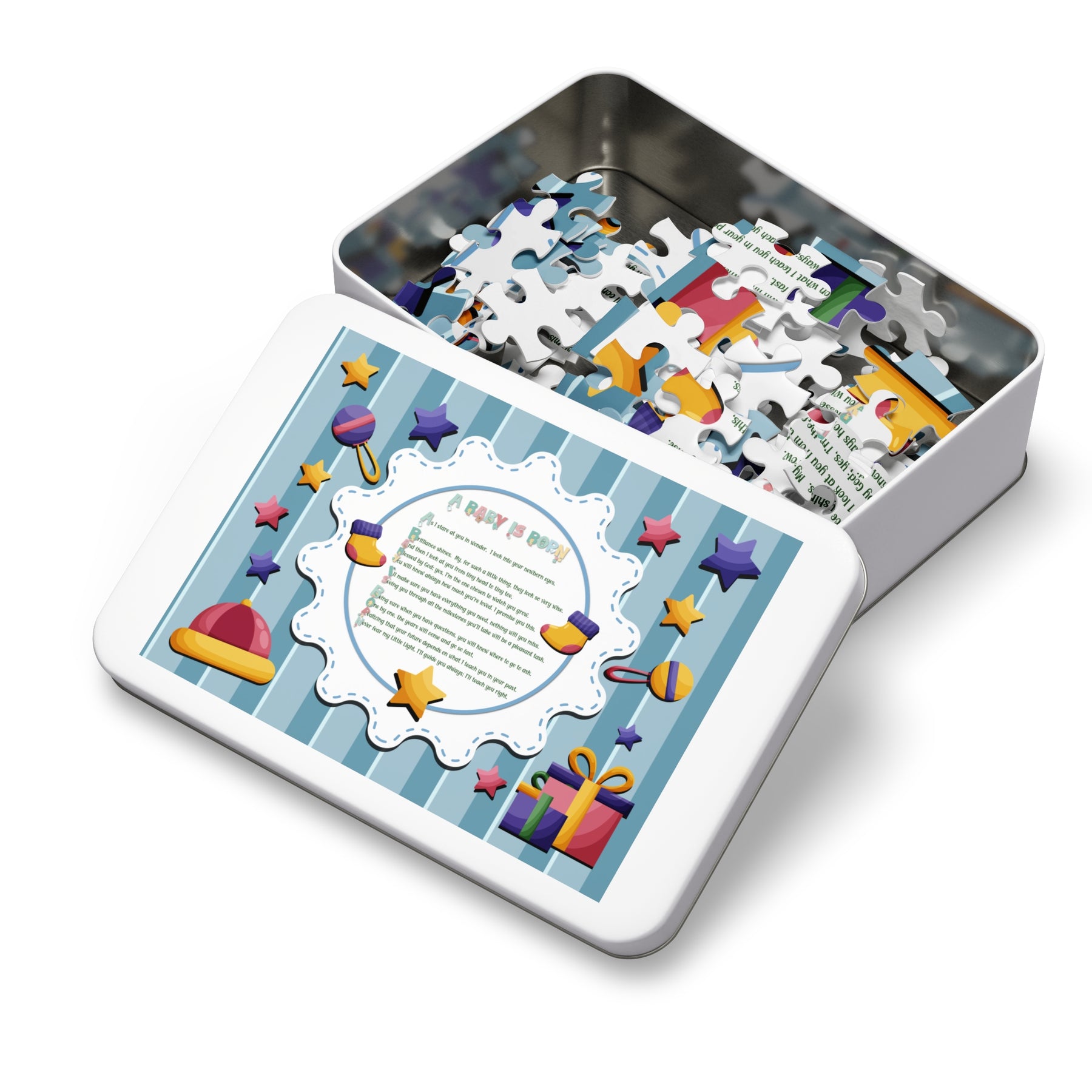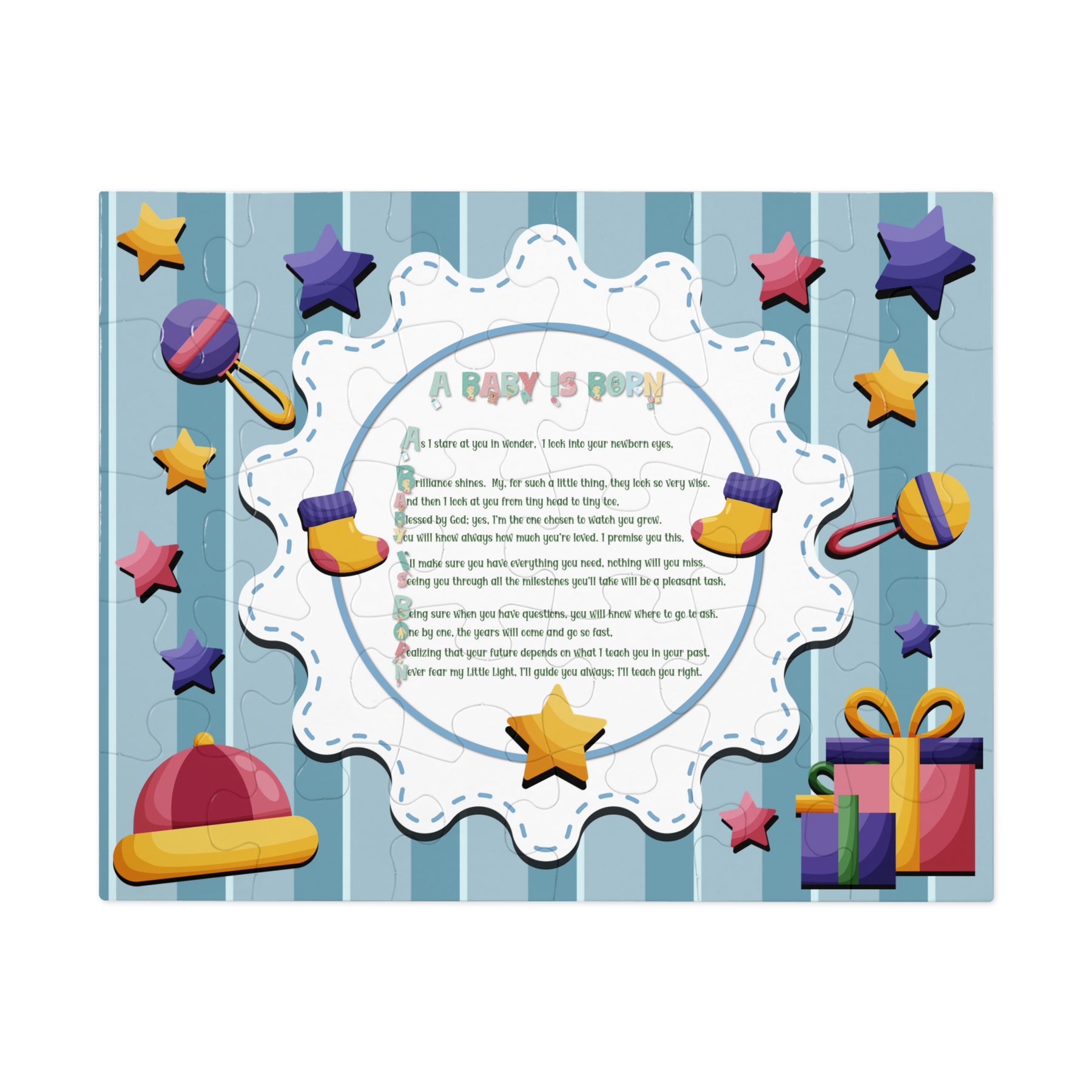 Take a look at this Baby Steps puzzle. It features an adorable design and an acrostic poem that spells out A Baby is Born. It’s a fun activity for your baby shower that guests can enjoy throughout the party. They’re sure to love it, and it also makes a lovely keepsake or a gift for another new mom. The puzzle is made from sturdy board with a glossy finish and comes in a gift-ready box that highlights the design. Choose from various sizes.