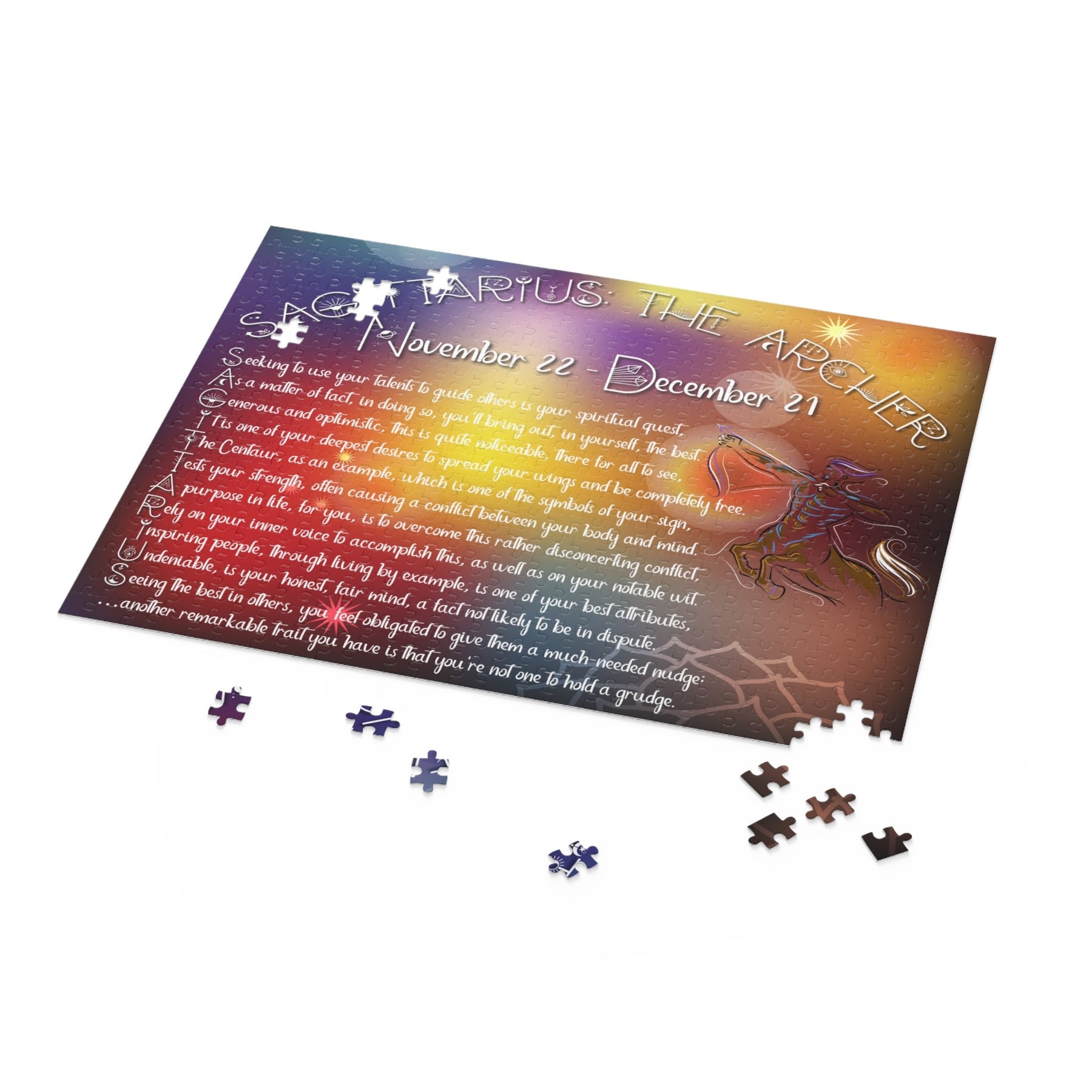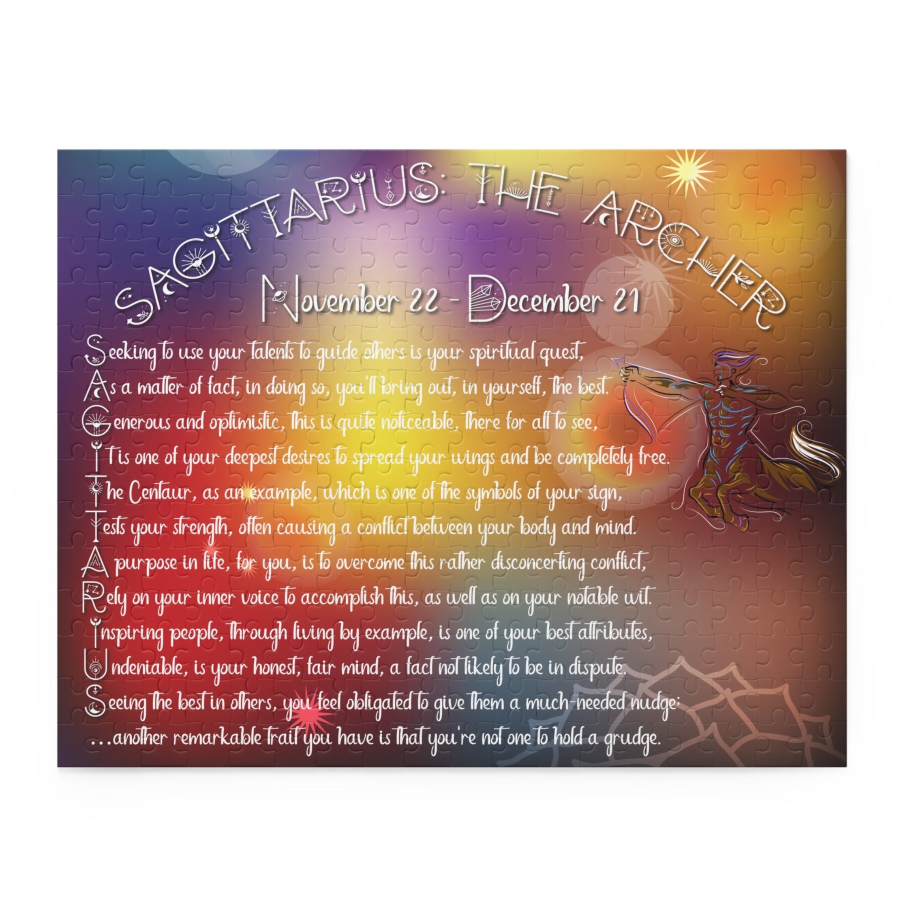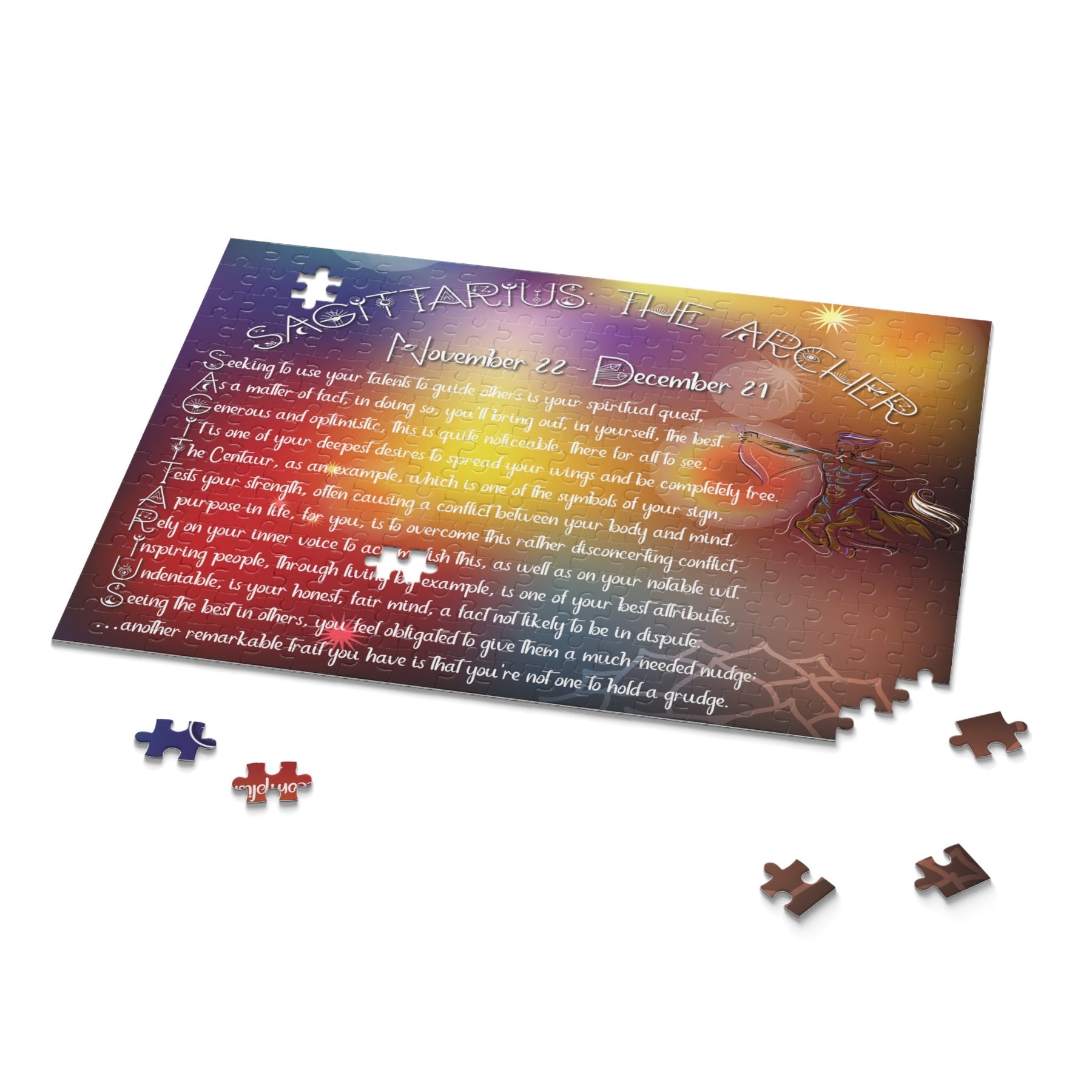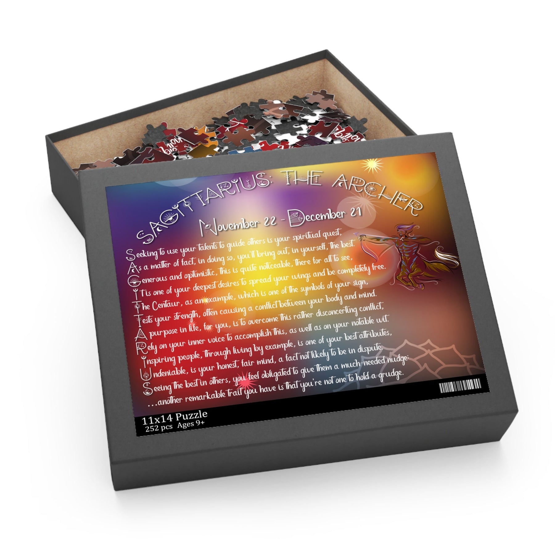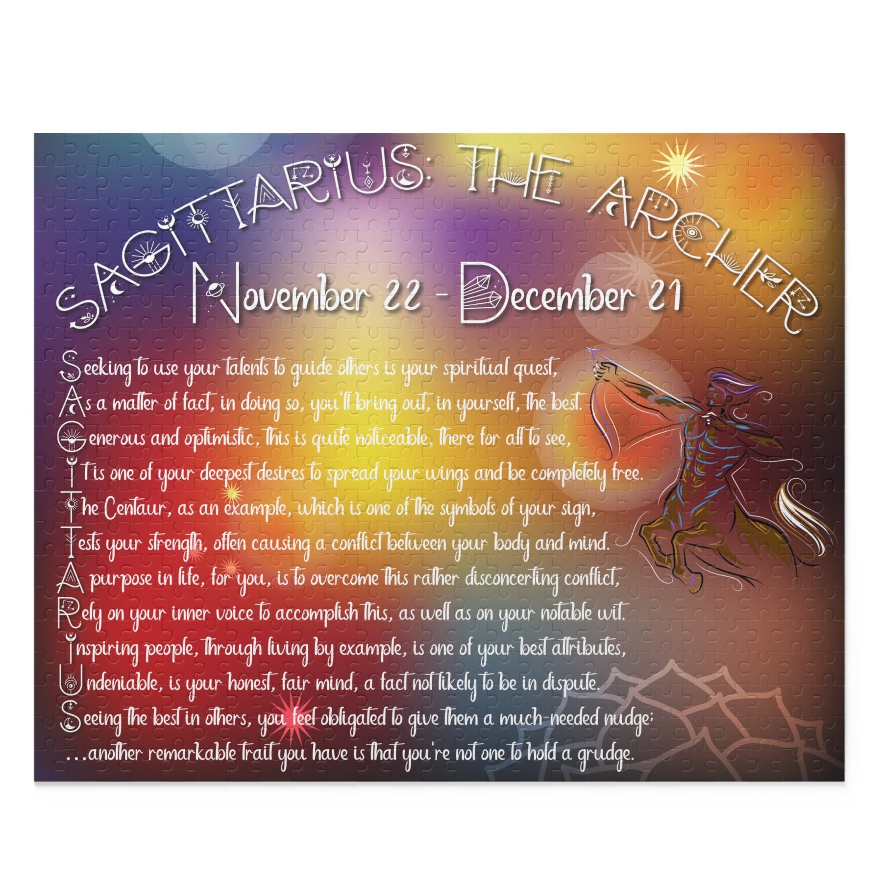 Introducing our "Written in the Stars" Acrostic "Sagittarius" Poem Jigsaw Puzzle, meticulously crafted for astrology enthusiasts and puzzle lovers alike. Discover the unique traits and spiritual goal of your Sagittarius star sign. Crafted with precision and care, this exciting, astrology-inspired puzzle is a bold, beautiful way to uncover your cosmic destiny. Take the challenge and explore yourself with this amazing puzzle. Piece together this enchanting puzzle, using each letter acts as a clue, unveiling a captivating story from the stars. With its vibrant imagery and intricate design, it's perfect for those seeking a mindful and immersive experience. Unleash your inner cosmic explorer and embrace the magic of your sign with this exquisite puzzle. Hurry, grab your piece of this celestial saga today!