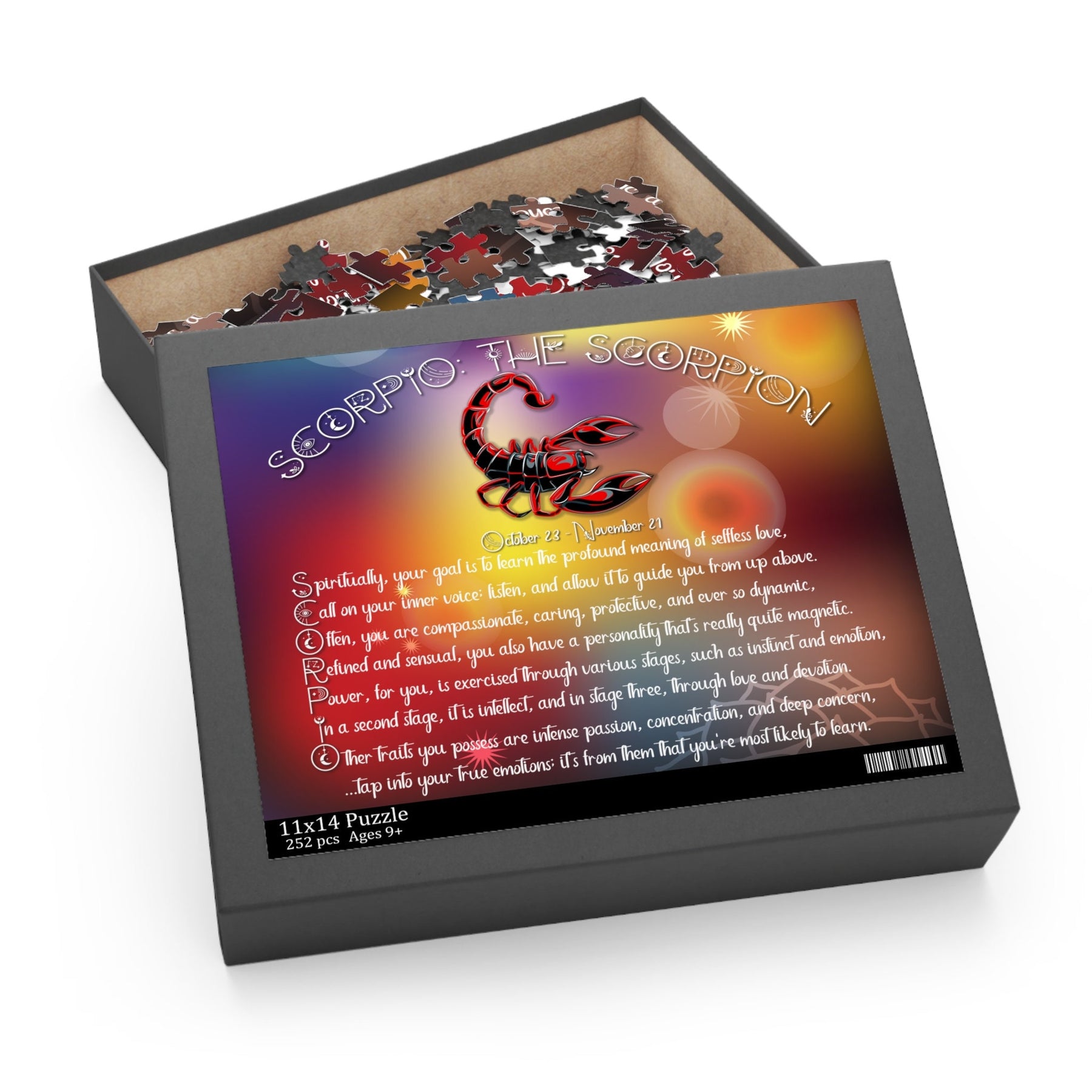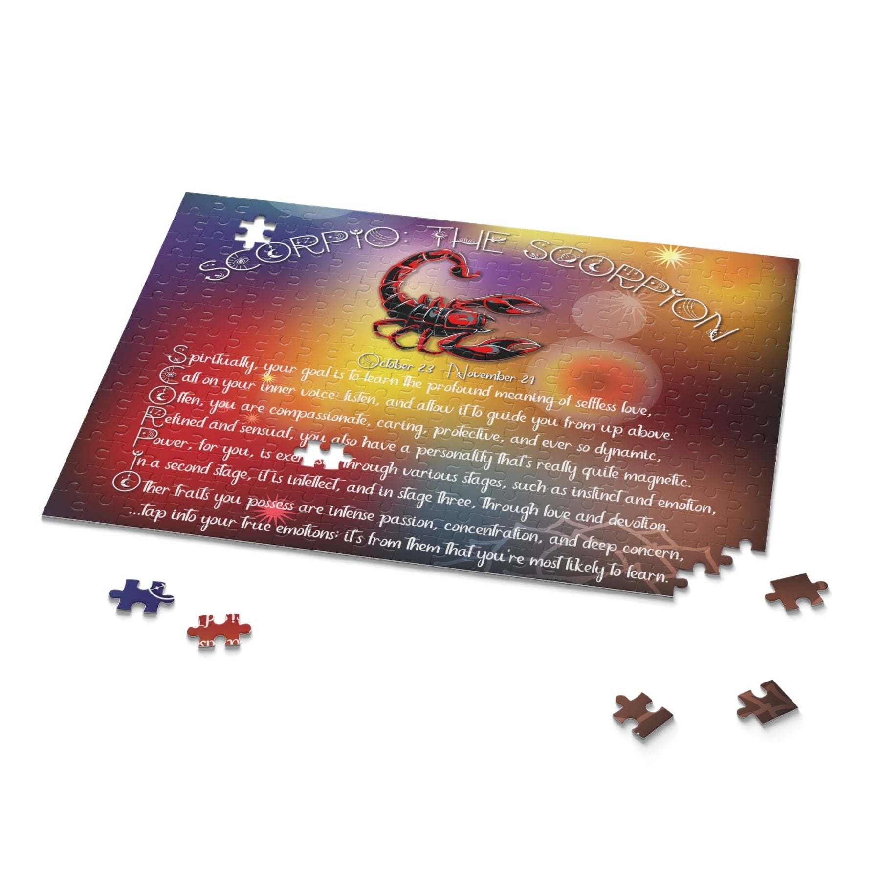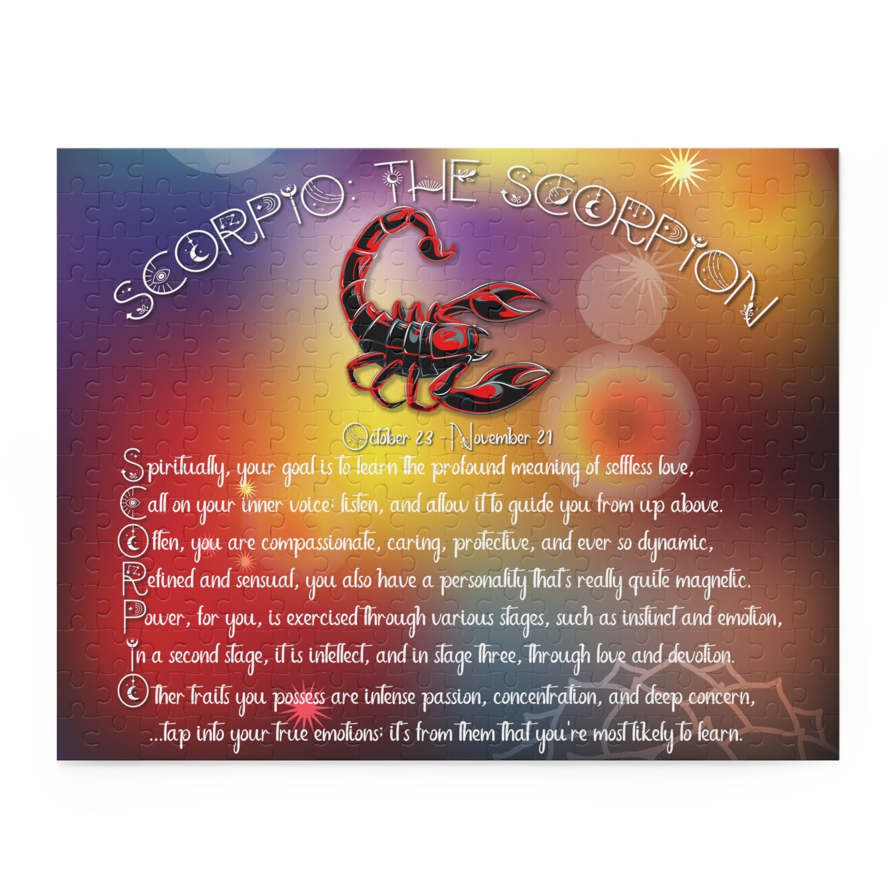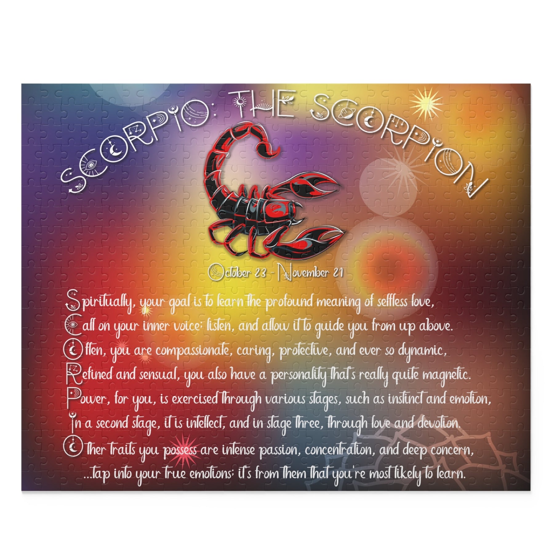 Introducing our "Written in the Stars" Acrostic "Scorpio" Poem Jigsaw Puzzle, meticulously crafted for astrology enthusiasts and puzzle lovers alike. Discover the unique traits and spiritual goal of your Scorpio star sign. Crafted with precision and care, this exciting, astrology-inspired puzzle is a bold, beautiful way to uncover your cosmic destiny. Take the challenge and explore yourself with this amazing puzzle. Piece together this enchanting puzzle, using each letter acts as a clue, unveiling a captivating story from the stars. With its vibrant imagery and intricate design, it's perfect for those seeking a mindful and immersive experience. Unleash your inner cosmic explorer and embrace the magic of your sign with this exquisite puzzle. Hurry, grab your piece of this celestial saga today!