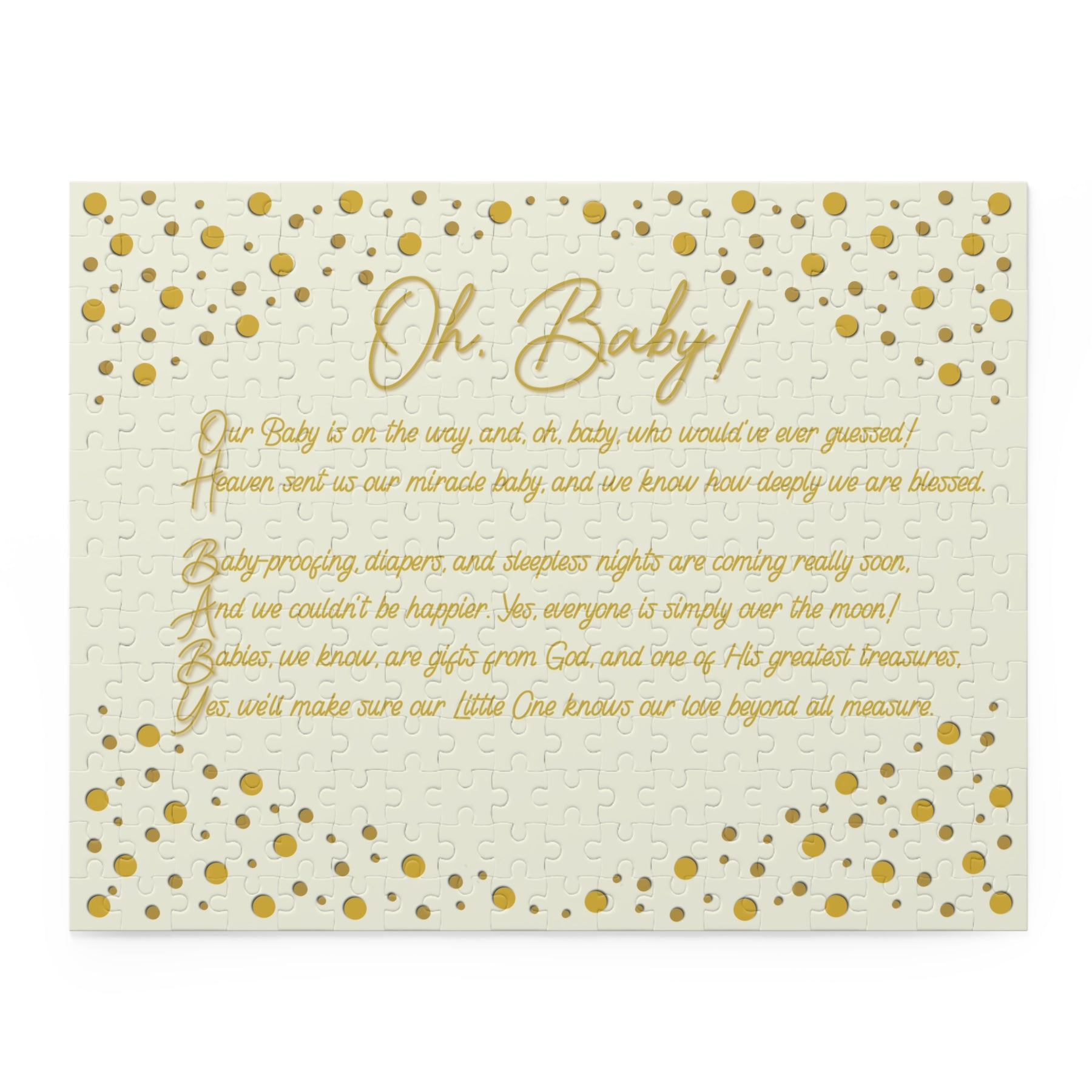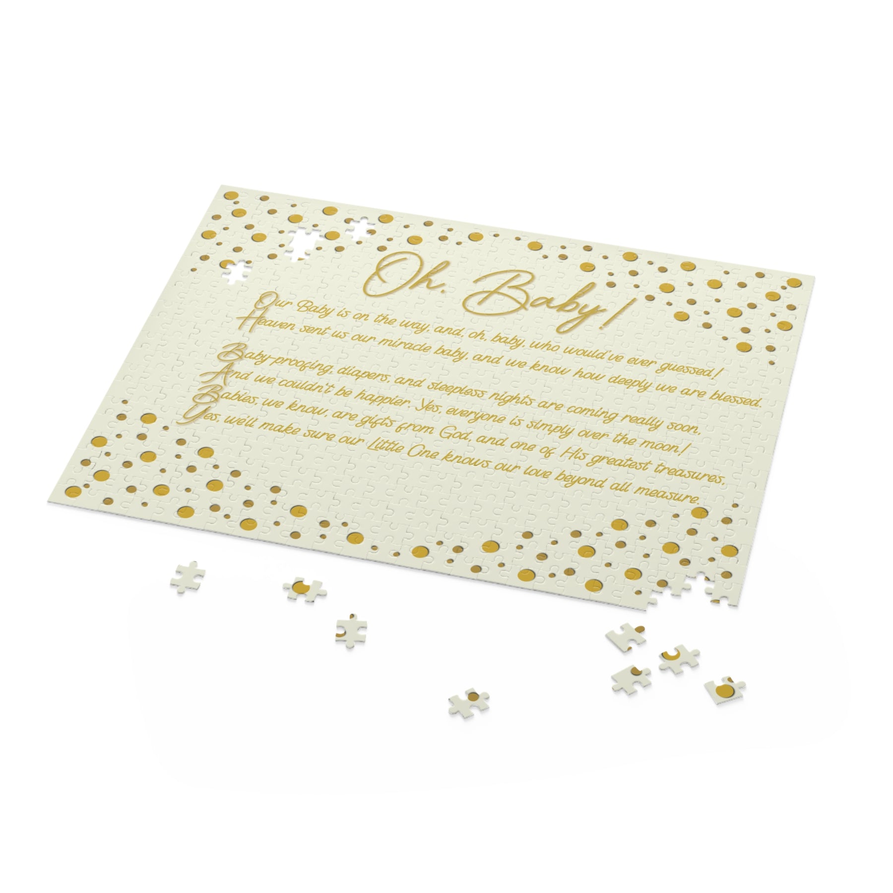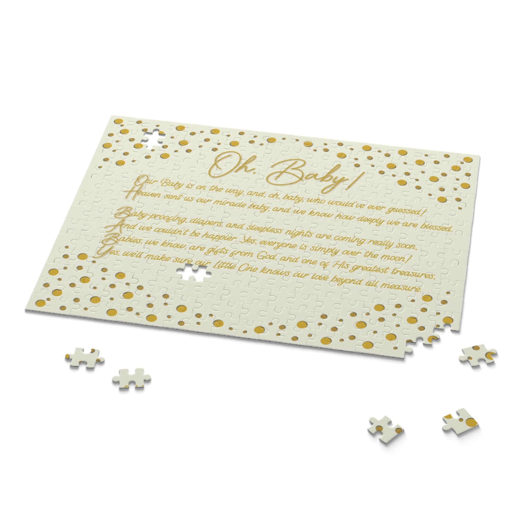 Our Baby Steps puzzle from Moments in Rhyme features the acrostic phrase Oh, Baby! It’s a great way to keep your baby shower guests entertained, and they’ll love it. This puzzle also makes a special keepsake or a gift for a new mom. It comes in two sizes, is made from sturdy puzzle board with a glossy finish, and arrives in a gift-ready box that highlights the design.