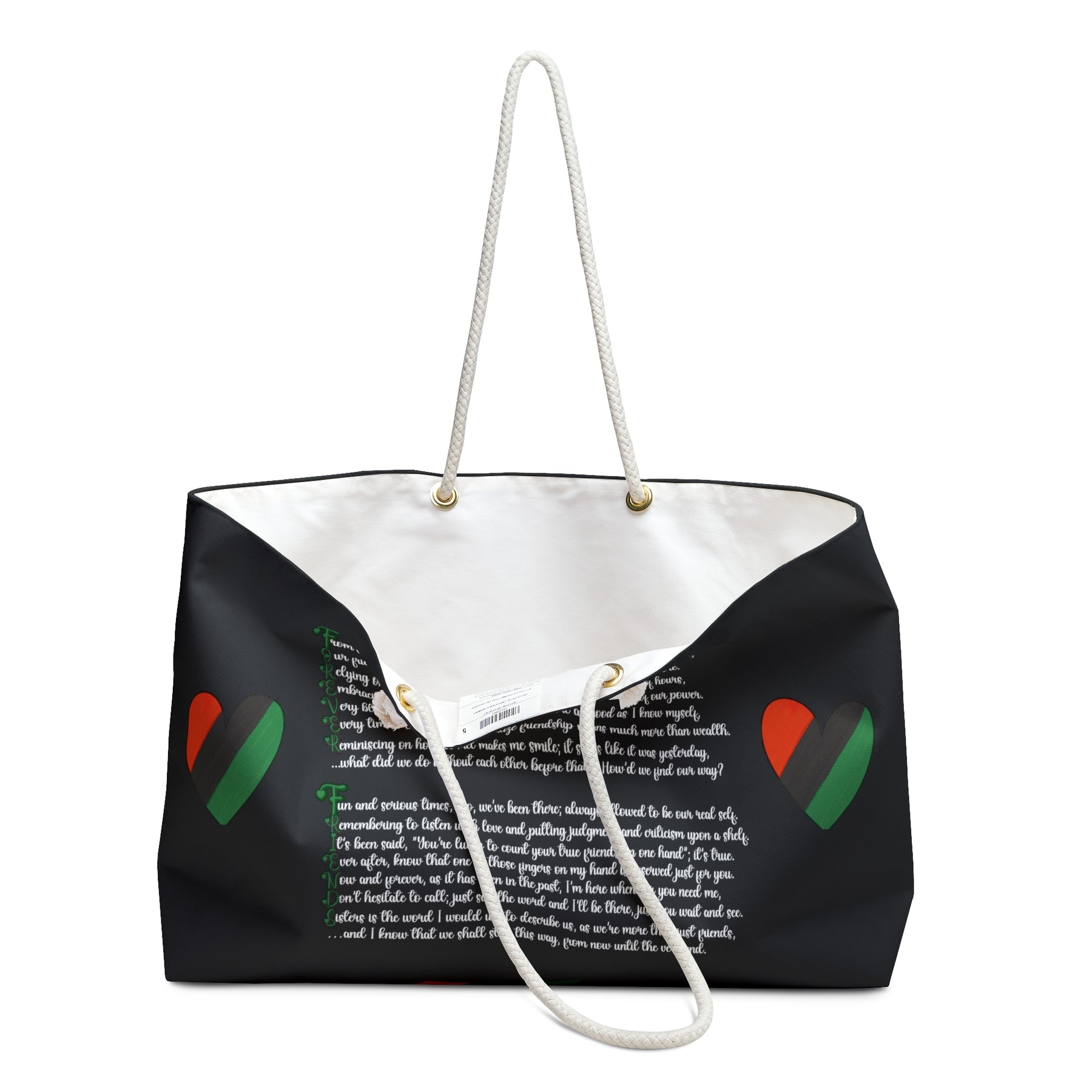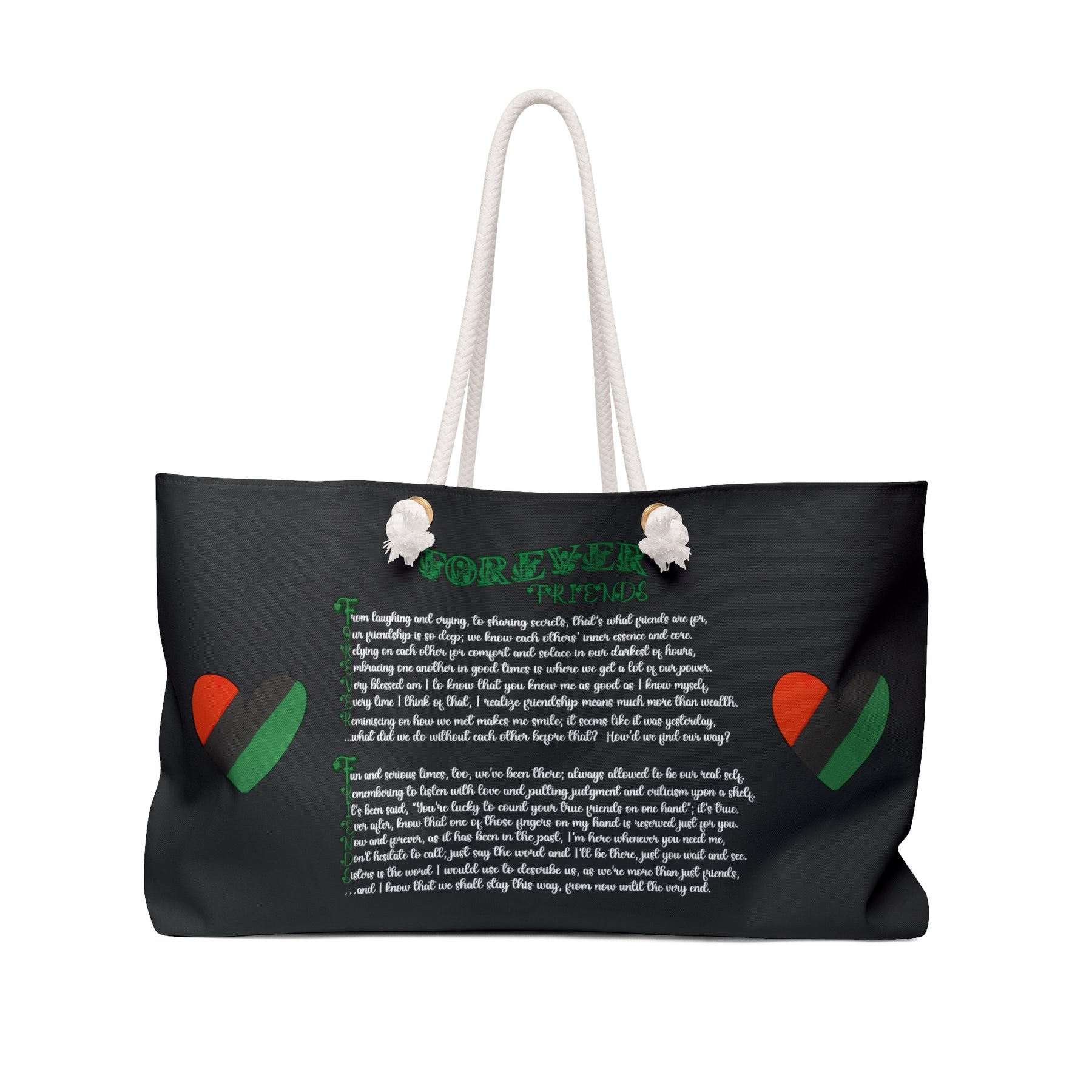 Introducing our Moments in Rhyme Weekender Tote Collection! This personalized tote bag features the acrostic poem "Forever Friends" and a beautiful profile of an African American woman. Whether you're planning a girls' weekend at the beach or a bridal party weekend in town, this tote will be your go-to companion. Its roomy interior, sturdy materials, and reliable rope handles make it perfect for carrying all your personal items. And for your closest friends in the bridal party, it makes a heartfelt and thoughtful gift. Want to add a personal touch? We offer the option to personalize each bag with your friends' names for a small extra fee. Let us help you create unforgettable memories with our personalized tote bag.