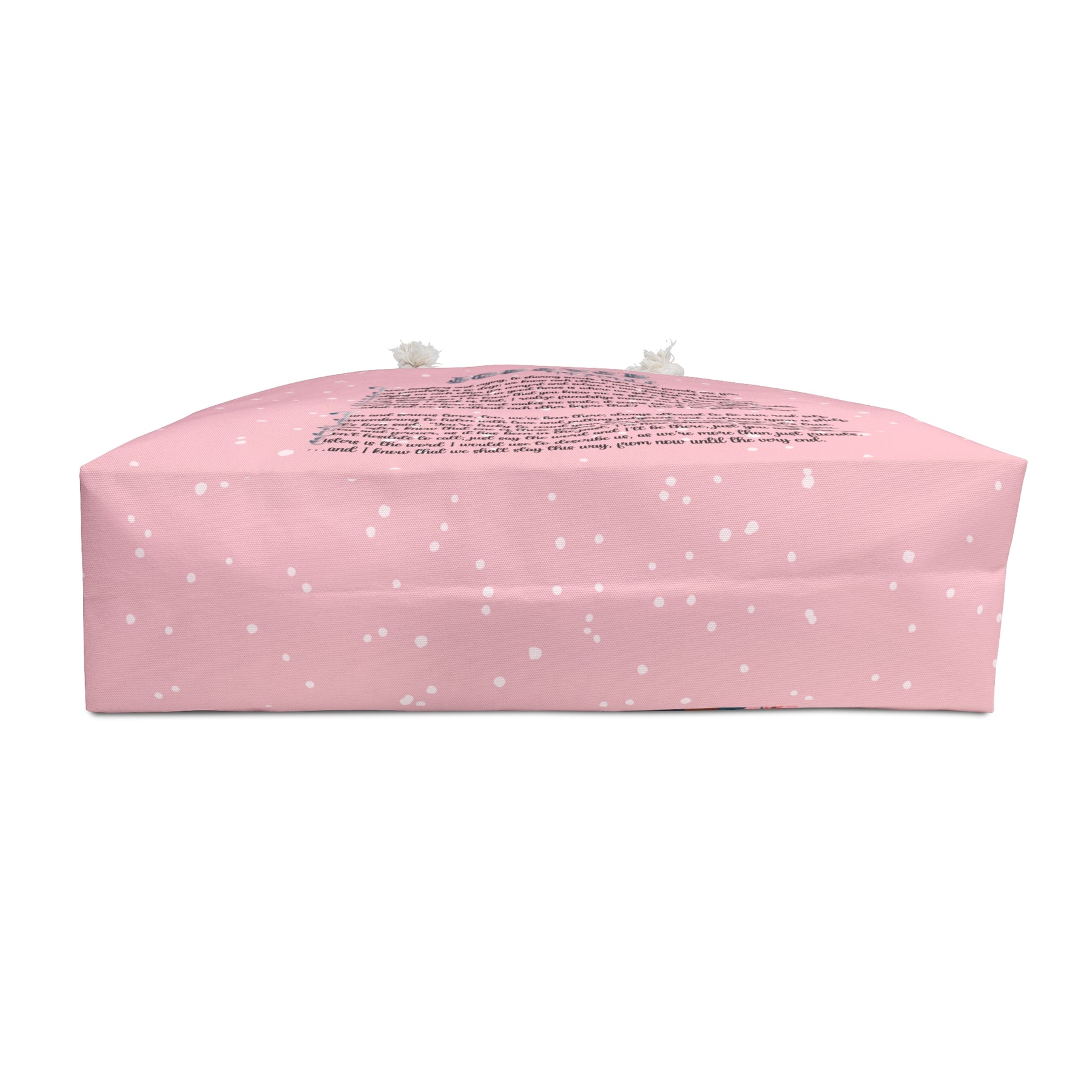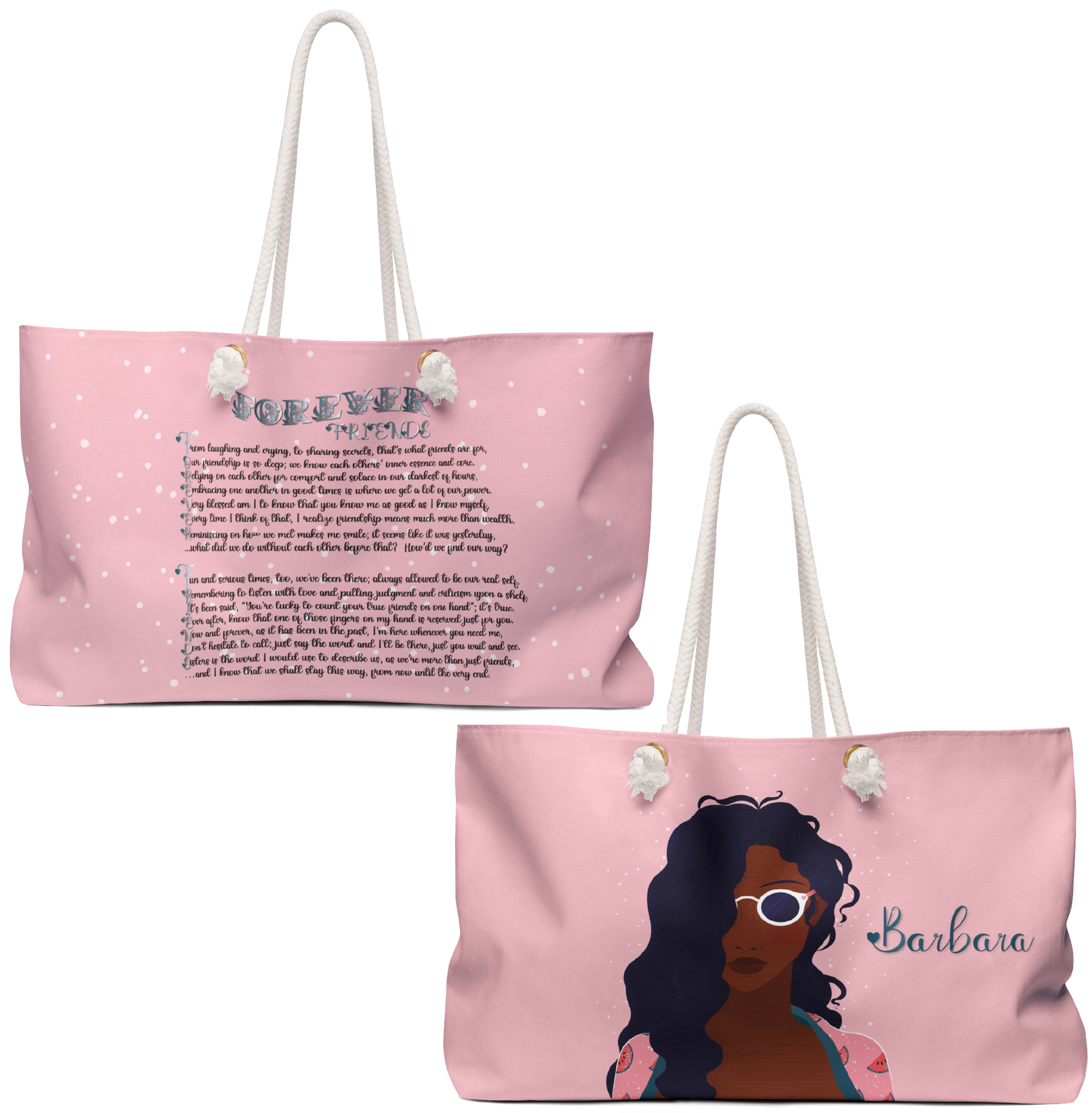 Experience timeless elegance with our "It's Just a Phrase" oversized Weekender Tote from Moments in Rhyme. Featuring a beautiful acrostic poem that spells out "Forever Friends", this luxurious bag is the ideal companion for a girls' weekend at the beach or a bridal party getaway. With its sturdy, wide-mouth design and thick rope handles, this tote can hold all your personal items in style. It's the perfect gift for your nearest and dearest bridesmaids. For a small additional fee, it can even be personalized with their names for an extra special touch.