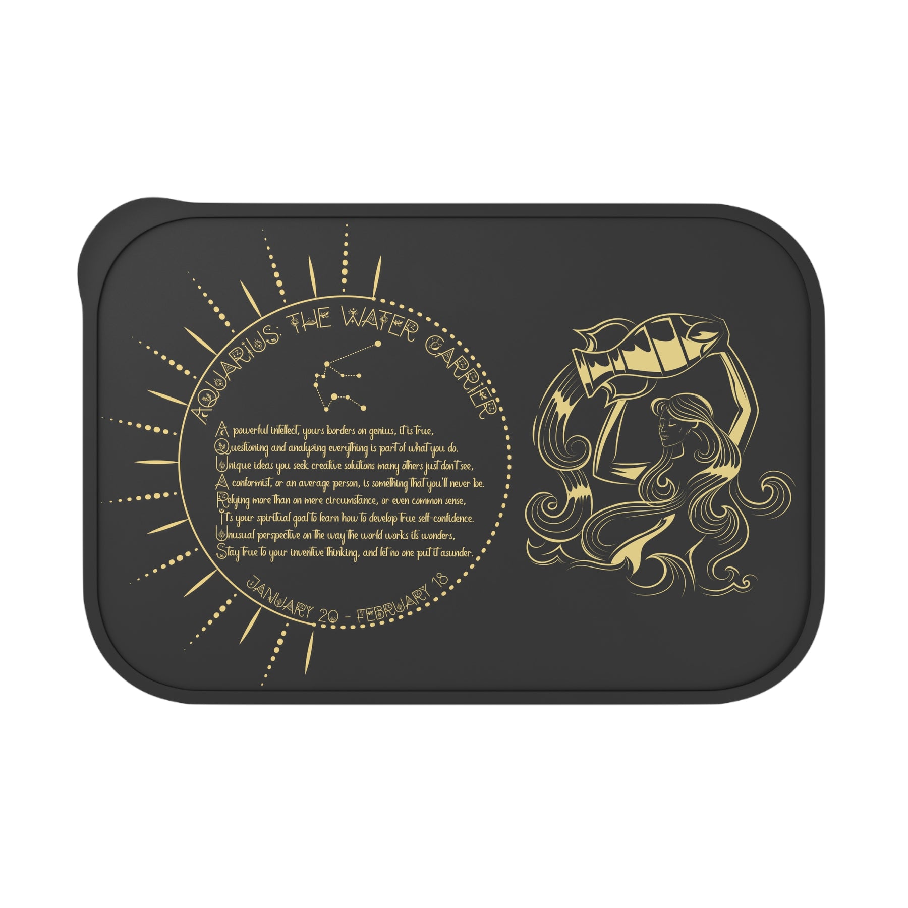 Discover Written in the Stars Aquarius acrostic poem Bento Box, designed for those who care about style and the environment. This unique lunch box makes meals more enjoyable and brightens up any lunch break. Its stipple print texture and artistic lid catch the eye, whether you’re at work, school, or out for a picnic.