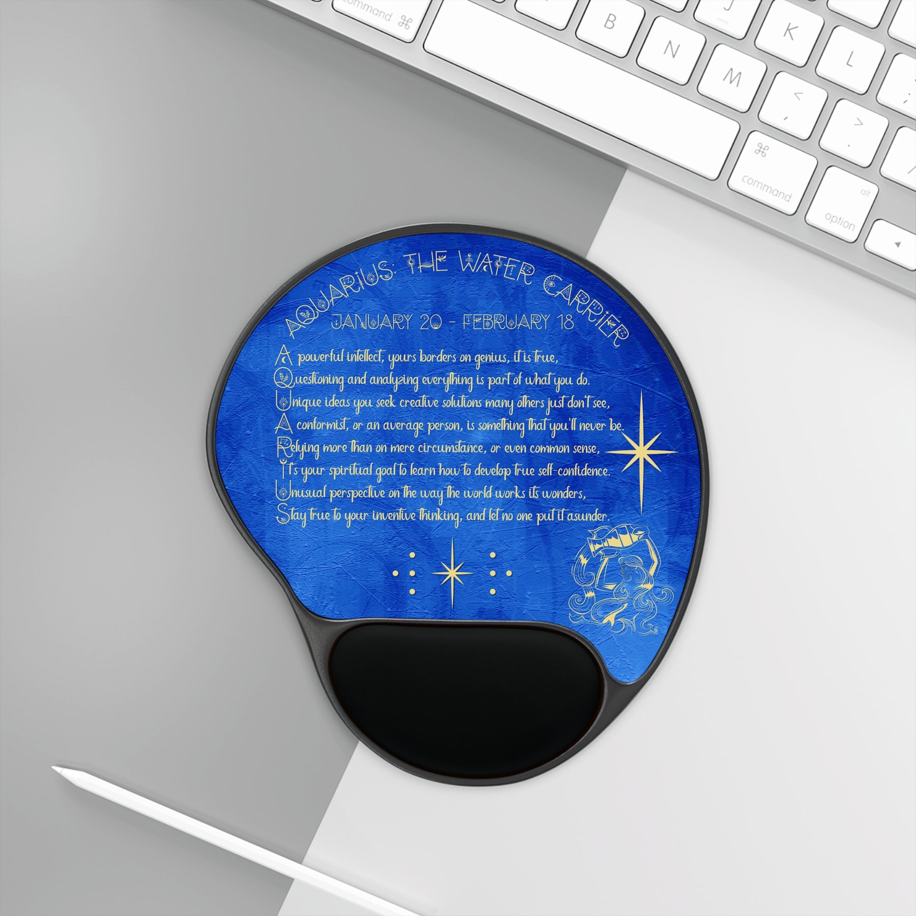 This ergonomic Written in the Stars Mouse Pad with Wrist Rest is designed to protect your wrist from carpal tunnel while adding a touch of astrology to your desk setup. This one spells out "Aquarius" and has the traits and meaning of the sign incorporated into the poem. The Memory Foam™ wrist support ensures comfort during long hours of computer use. Perfect for astrology enthusiasts and anyone looking for a stylish and functional desk accessory. Ideal for birthdays, holidays, or as a thoughtful gift for someone who spends a lot of time on the computer.