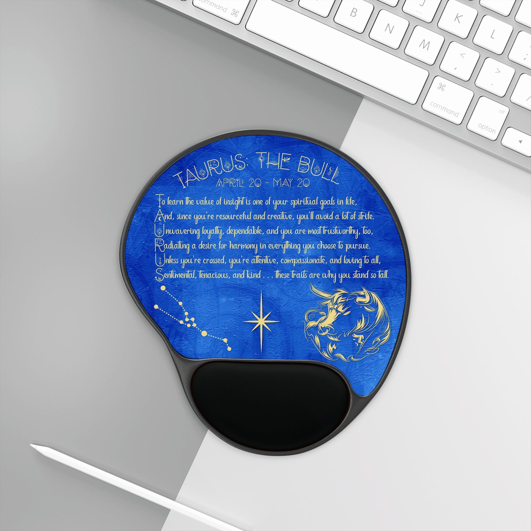 This ergonomic Written in the Stars Mouse Pad with Wrist Rest is designed to protect your wrist from carpal tunnel while adding a touch of astrology to your desk setup. This one spells out "Taurus" and has the traits and meaning of the sign incorporated into the poem. The Memory Foam™ wrist support ensures comfort during long hours of computer use. Perfect for astrology enthusiasts and anyone looking for a stylish and functional desk accessory. Ideal for birthdays, holidays, or as a thoughtful gift for someone who spends a lot of time on the computer.