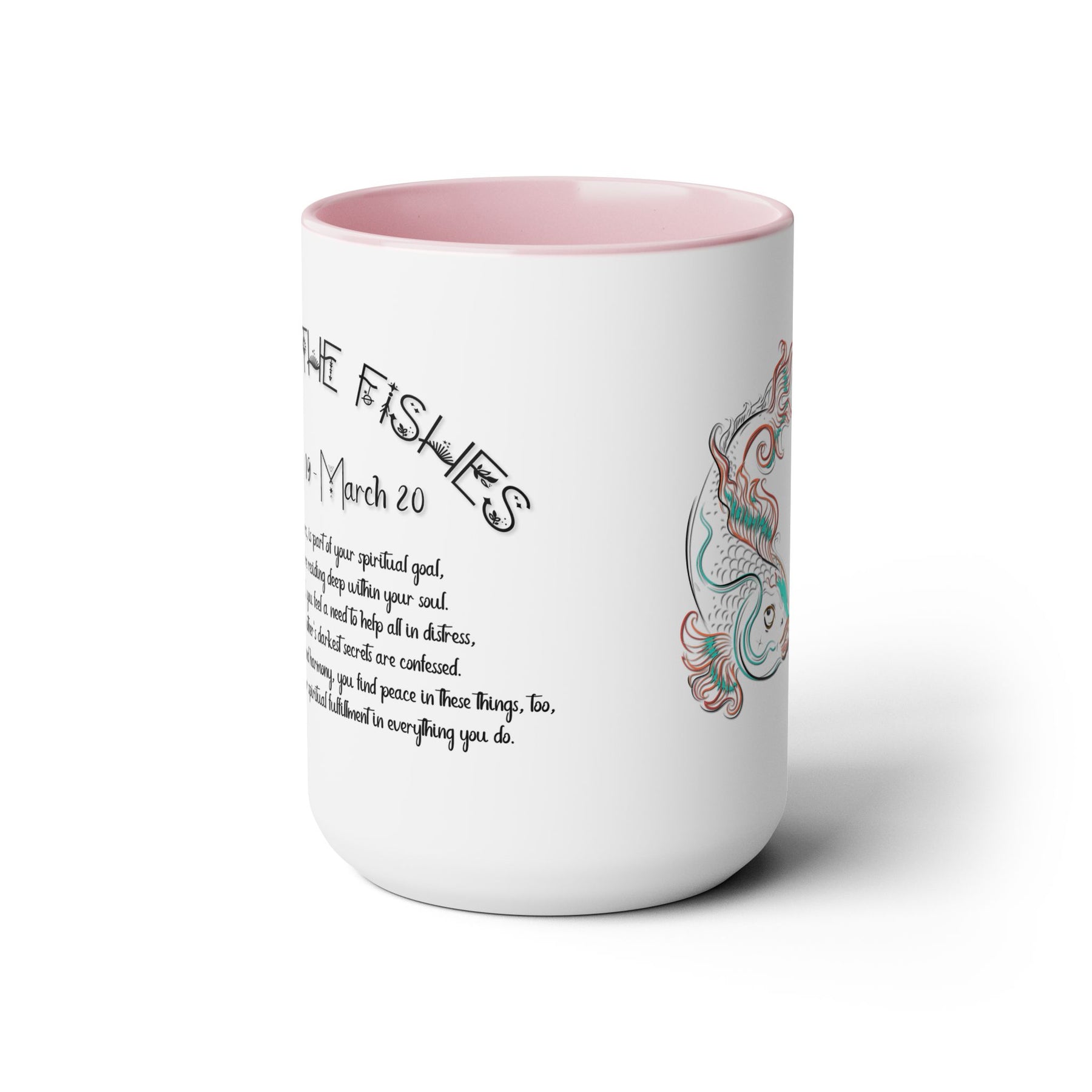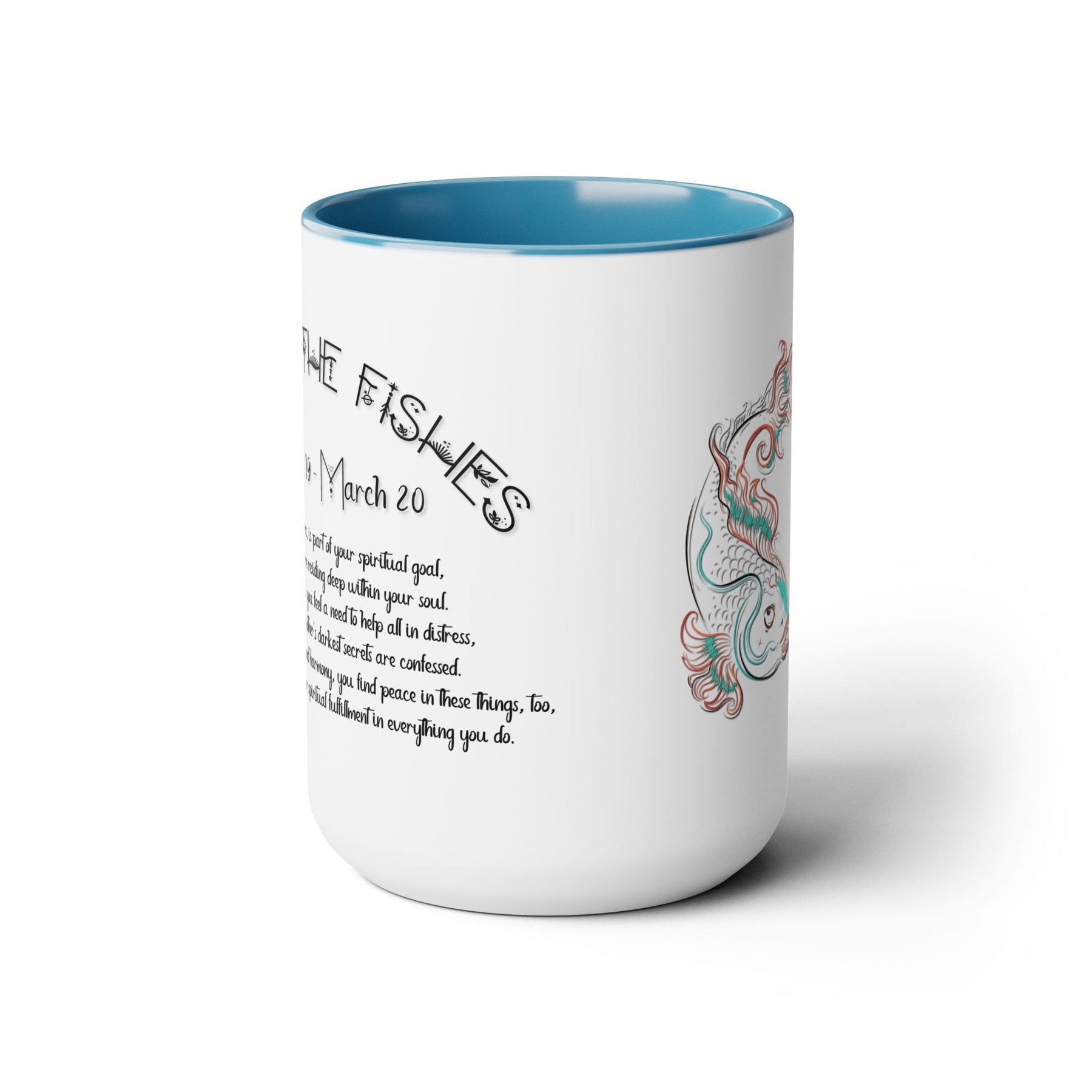 Here to bring big gulps of coffee and style, our Written in the Stars two-tone coffee mugs help people around the world start their day just right. This mug features an acrostic poem that spells out Pisces with traits and purpose included.