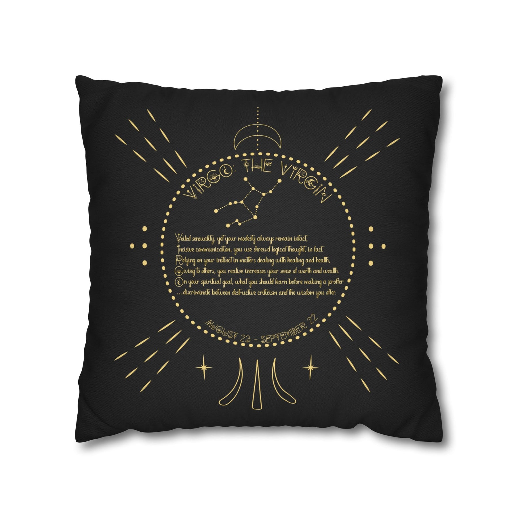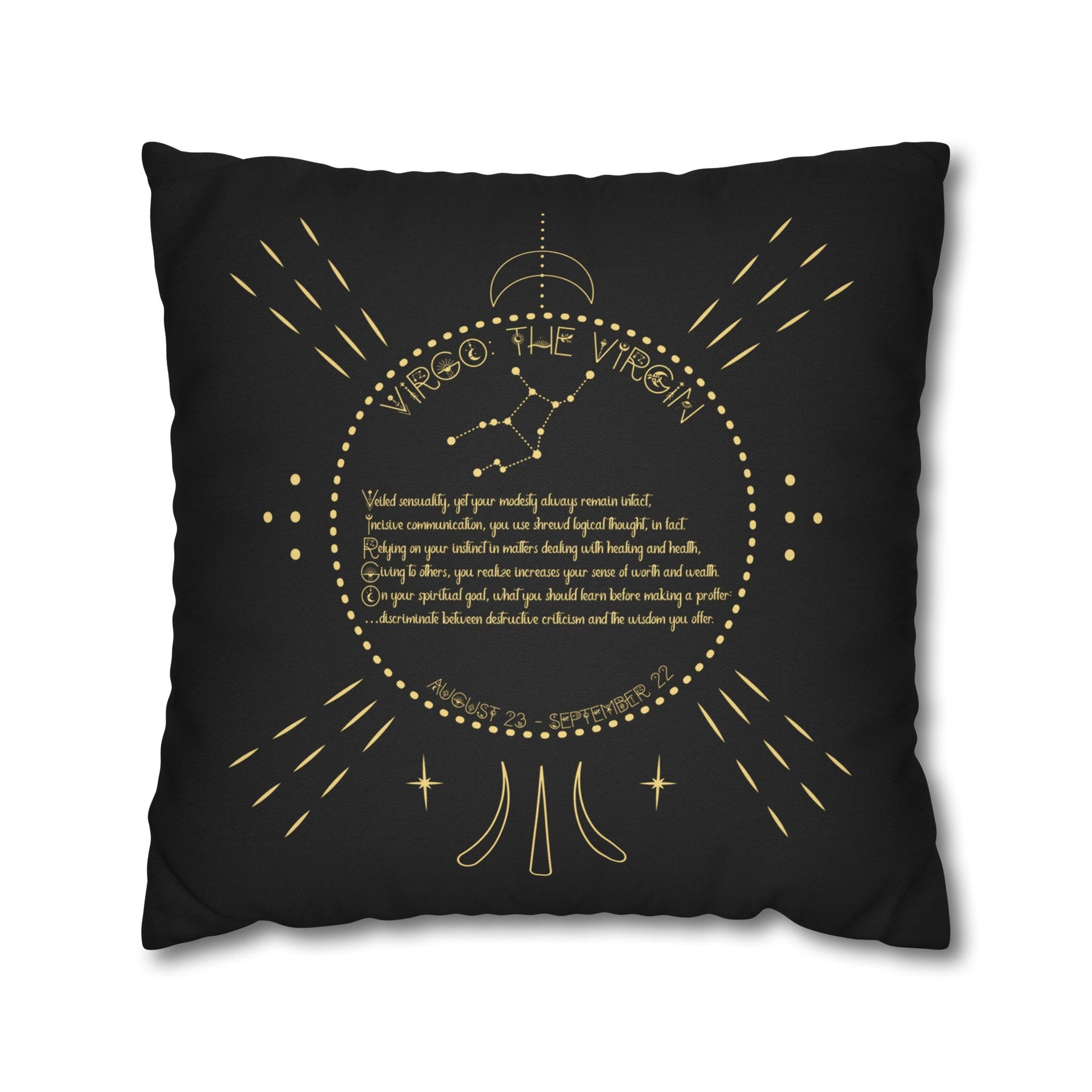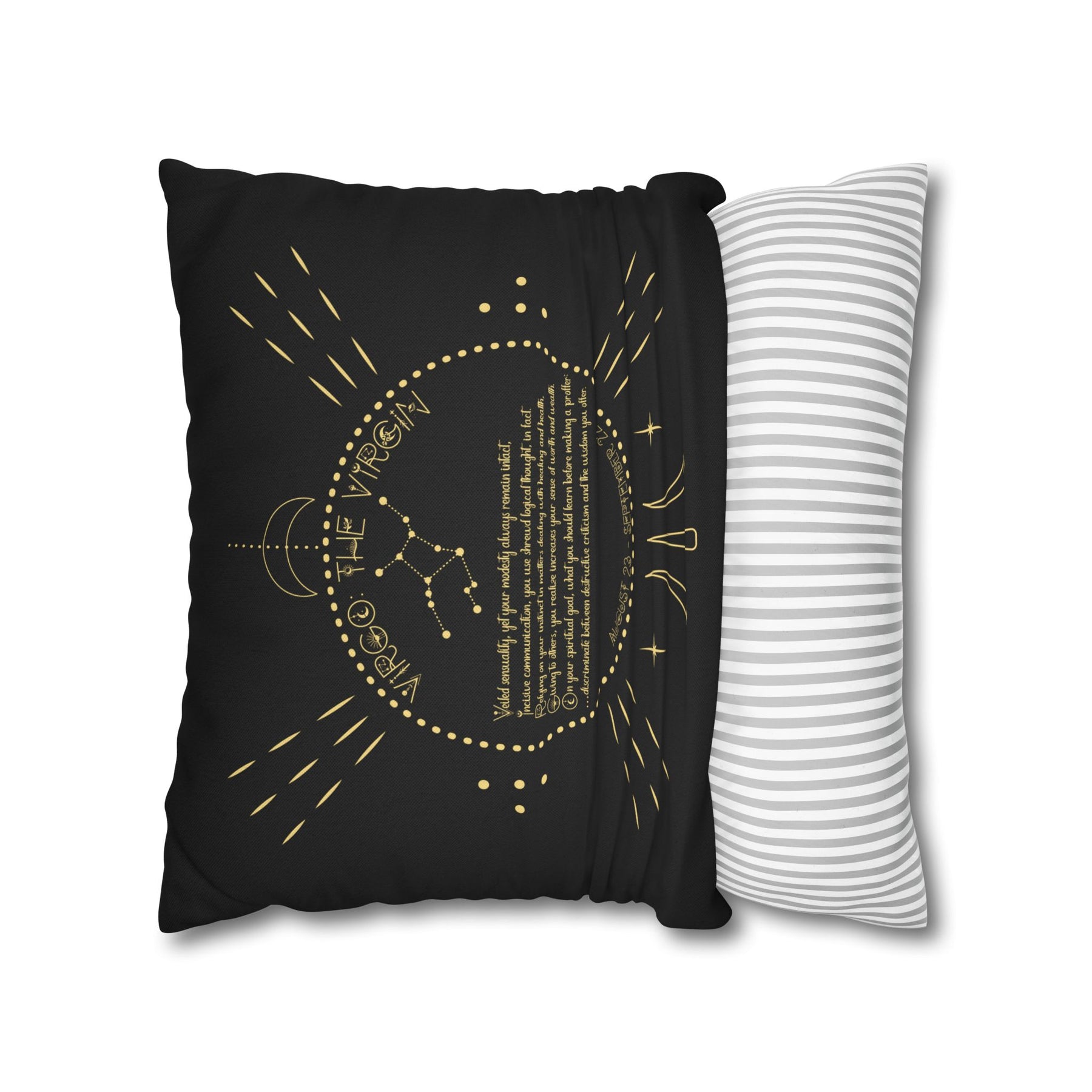Discover the Written in the Stars pillow collection. One side features an acrostic poem that spells out Virgo, highlighting its traits and spiritual goal. The other side shows a creative take on the Virgo astrological symbol. This pillow stands out and adds a special touch to any room. Show off your astrological sign with pride. It is an excellent choice for astrology fans or anyone seeking a personal touch in their home. These pillows also make thoughtful gifts for birthdays, holidays, or special moments. 100% spun polyester. Hidden beige plastic zipper with metal head. Pillow insert not included. Care instructions: Remove the pillow cover. Pre-treat stains with a soft cloth or bristle brush soaked in warm, soapy water. Machine wash, normal cycle. Do not bleach or tumble dry. Iron, steam, or dry on low heat only. Do not dry-clean—fluff to reshape.