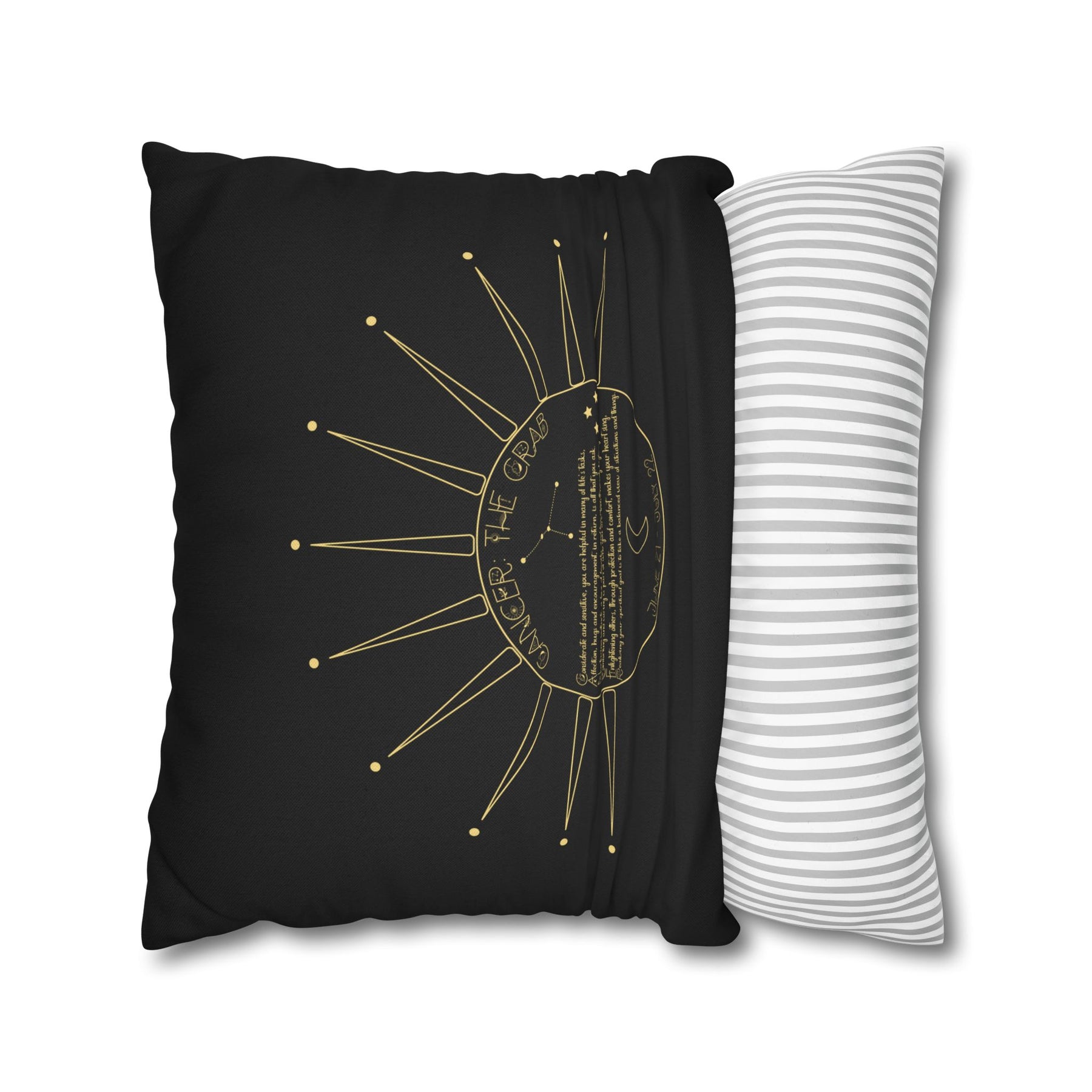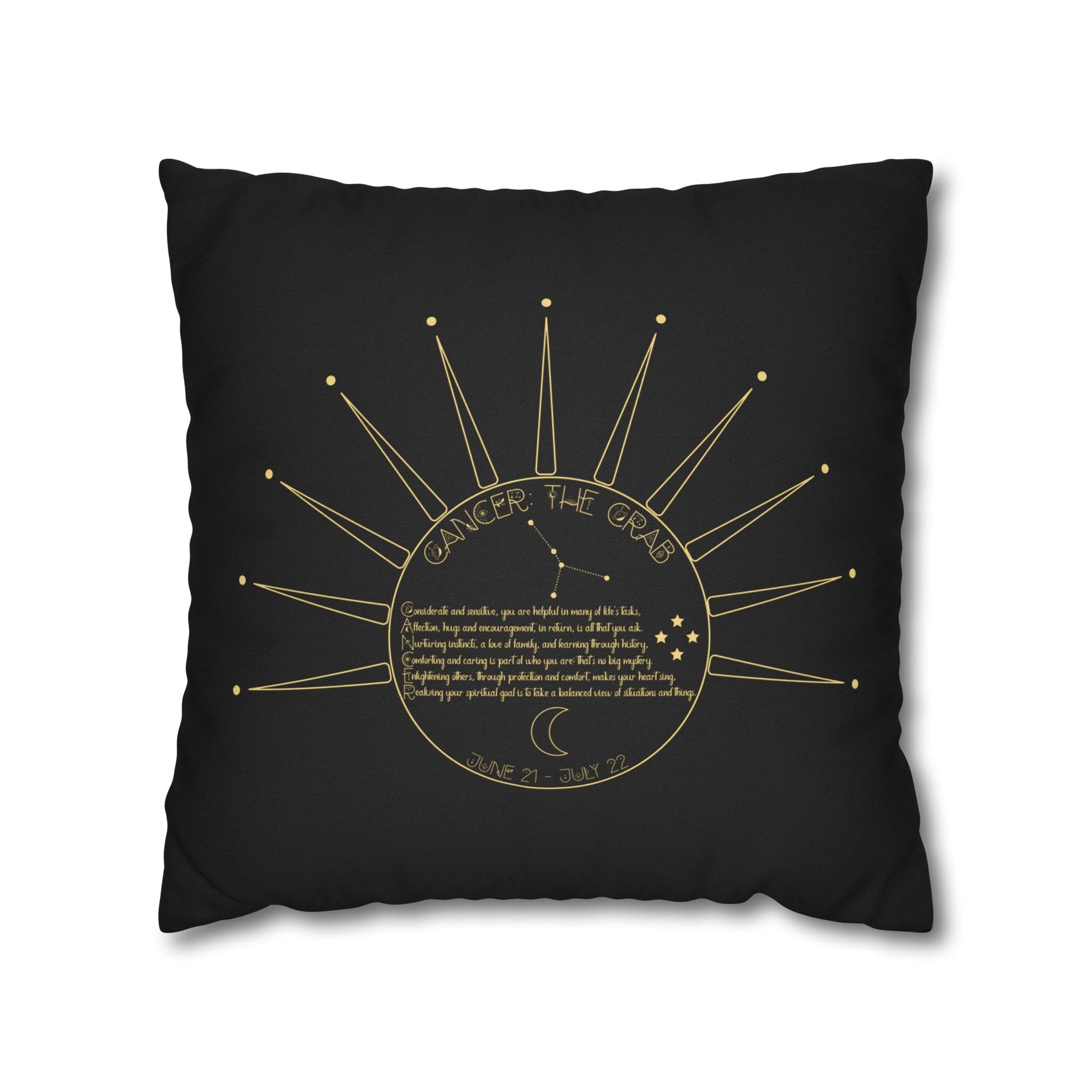 Discover the Written in the Stars pillow collection. One side features an acrostic poem that spells out Cancer, highlighting its traits and spiritual goal. The other side shows a creative take on the Cancer astrological symbol. This pillow stands out and adds a special touch to any room. Show off your astrological sign with pride. It is an excellent choice for astrology fans or anyone seeking a personal touch in their home. These pillows also make thoughtful gifts for birthdays, holidays, or special moments. 100% spun polyester. Hidden beige plastic zipper with metal head. Pillow insert not included. Care instructions: Remove the pillow cover. Pre-treat stains with a soft cloth or bristle brush soaked in warm, soapy water. Machine wash, normal cycle. Do not bleach or tumble dry. Iron, steam, or dry on low heat only. Do not dry-clean—fluff to reshape.