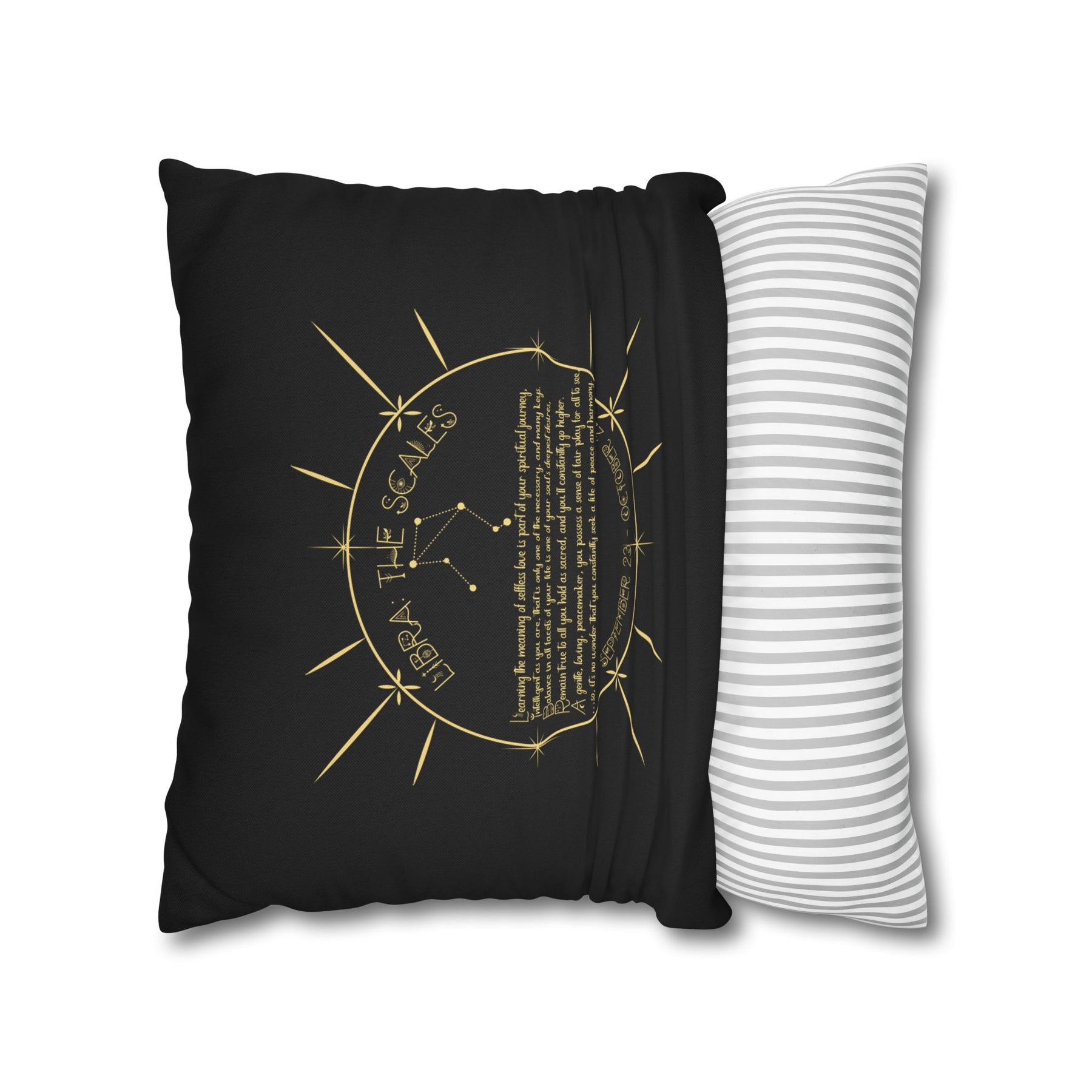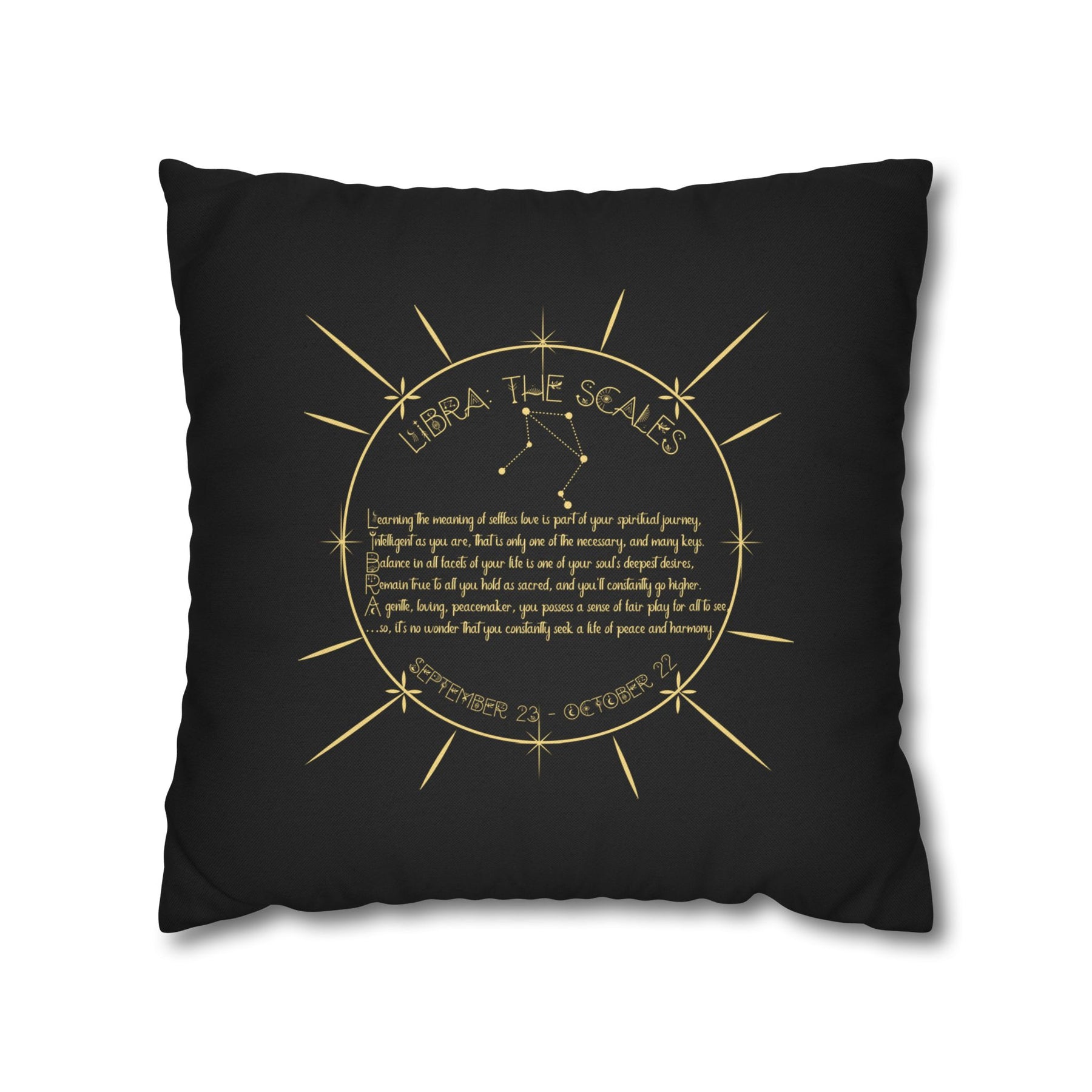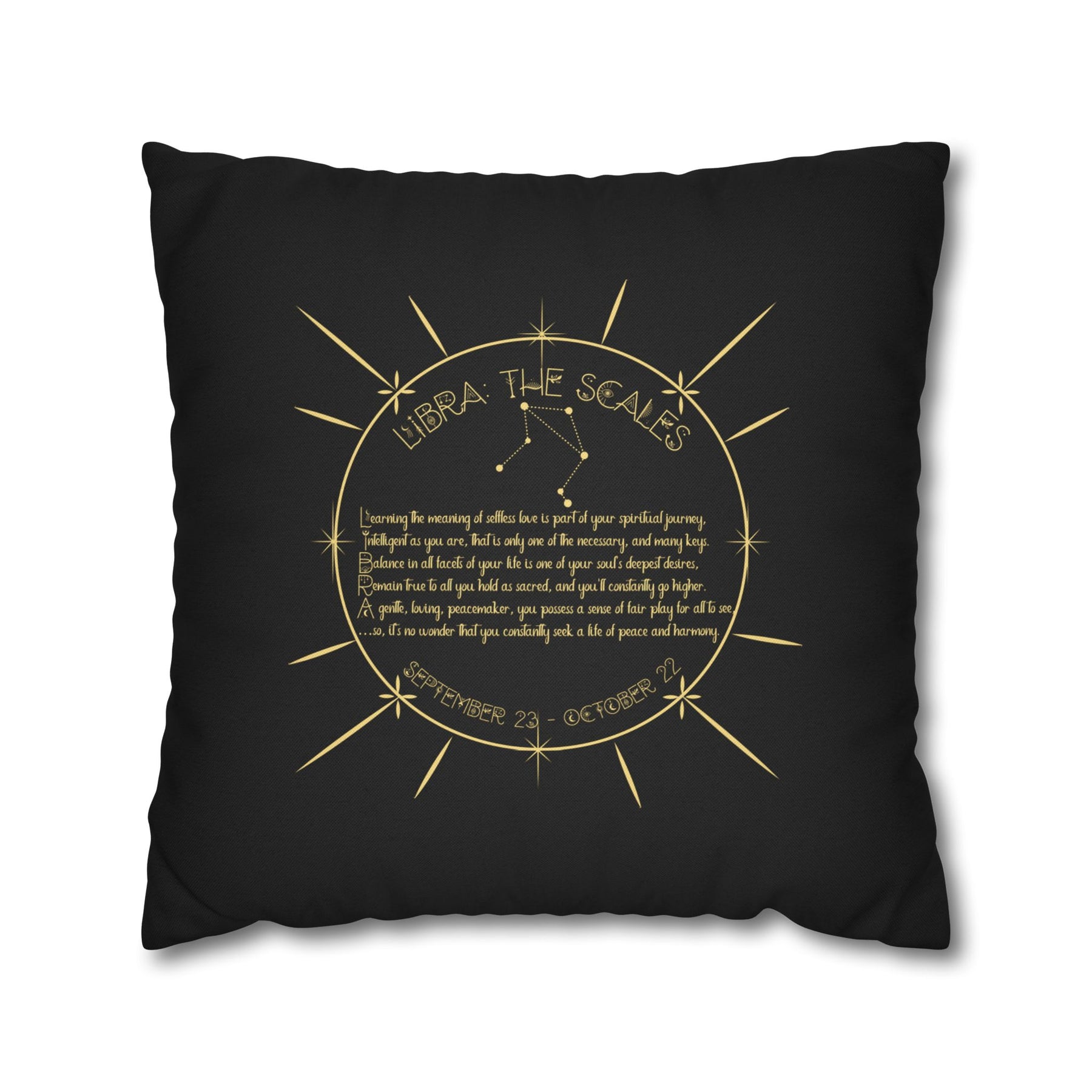 Discover the Written in the Stars pillow collection. One side features an acrostic poem that spells out Libra, highlighting its traits and spiritual goal. The other side shows a creative take on the Libra astrological symbol. This pillow stands out and adds a special touch to any room. Show off your astrological sign with pride. It is an excellent choice for astrology fans or anyone seeking a personal touch in their home. These pillows also make thoughtful gifts for birthdays, holidays, or special moments. 100% spun polyester. Hidden beige plastic zipper with metal head. Pillow insert not included. Care instructions: Remove the pillow cover. Pre-treat stains with a soft cloth or bristle brush soaked in warm, soapy water. Machine wash, normal cycle. Do not bleach or tumble dry. Iron, steam, or dry on low heat only. Do not dry-clean—fluff to reshape.