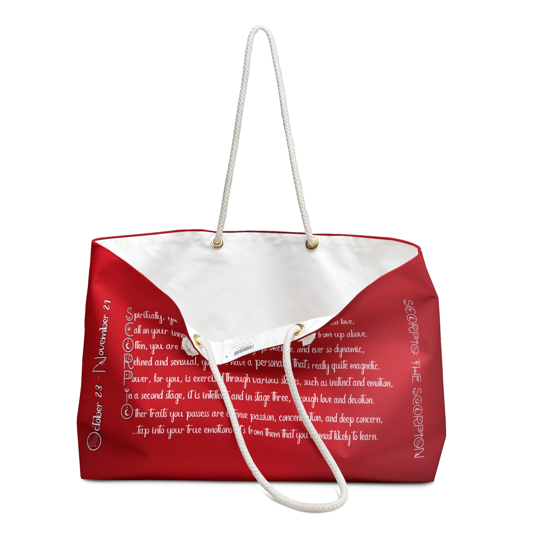 Take your essentials with you in style with our Written in the Stars Weekender Bag Collection. This roomy tote features an acrostic poem that spells out Scorpio. This bag is more than just practical—it makes a statement and celebrates both words and astrology. It’s great for weekends, the gym, or daily use, especially if you love literary art and all things cosmic. It also makes thoughtful gifts for bridesmaids, birthdays, holidays, or just for yourself. With lots of space for your things, this bag is sure to become a favorite. Give someone special a gift they can use for years. One size: 24" x13"