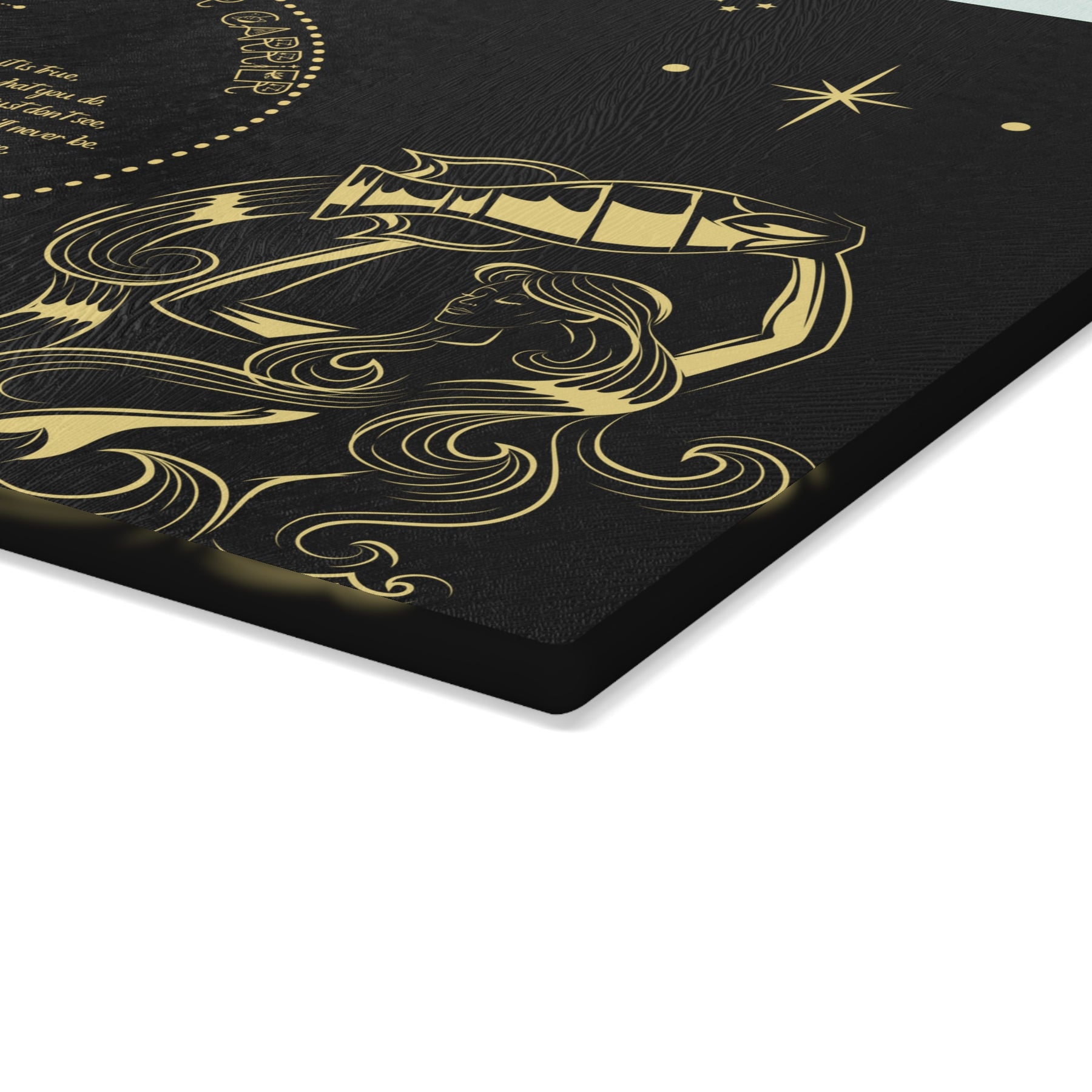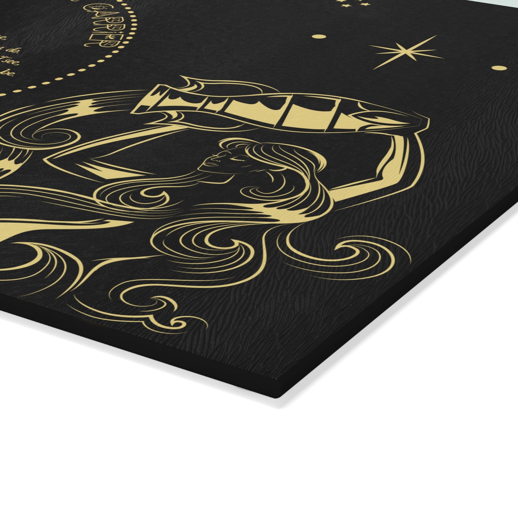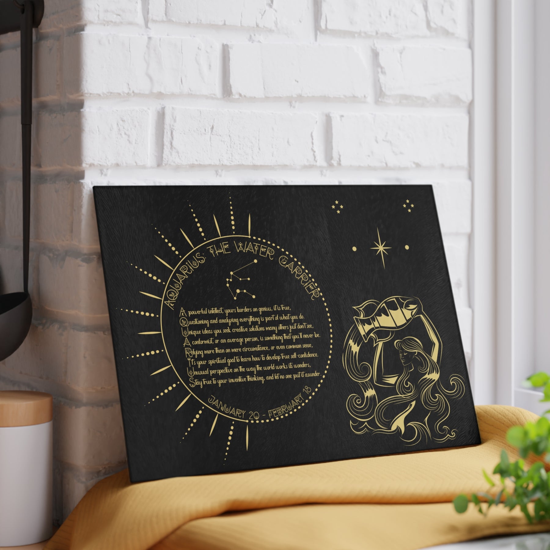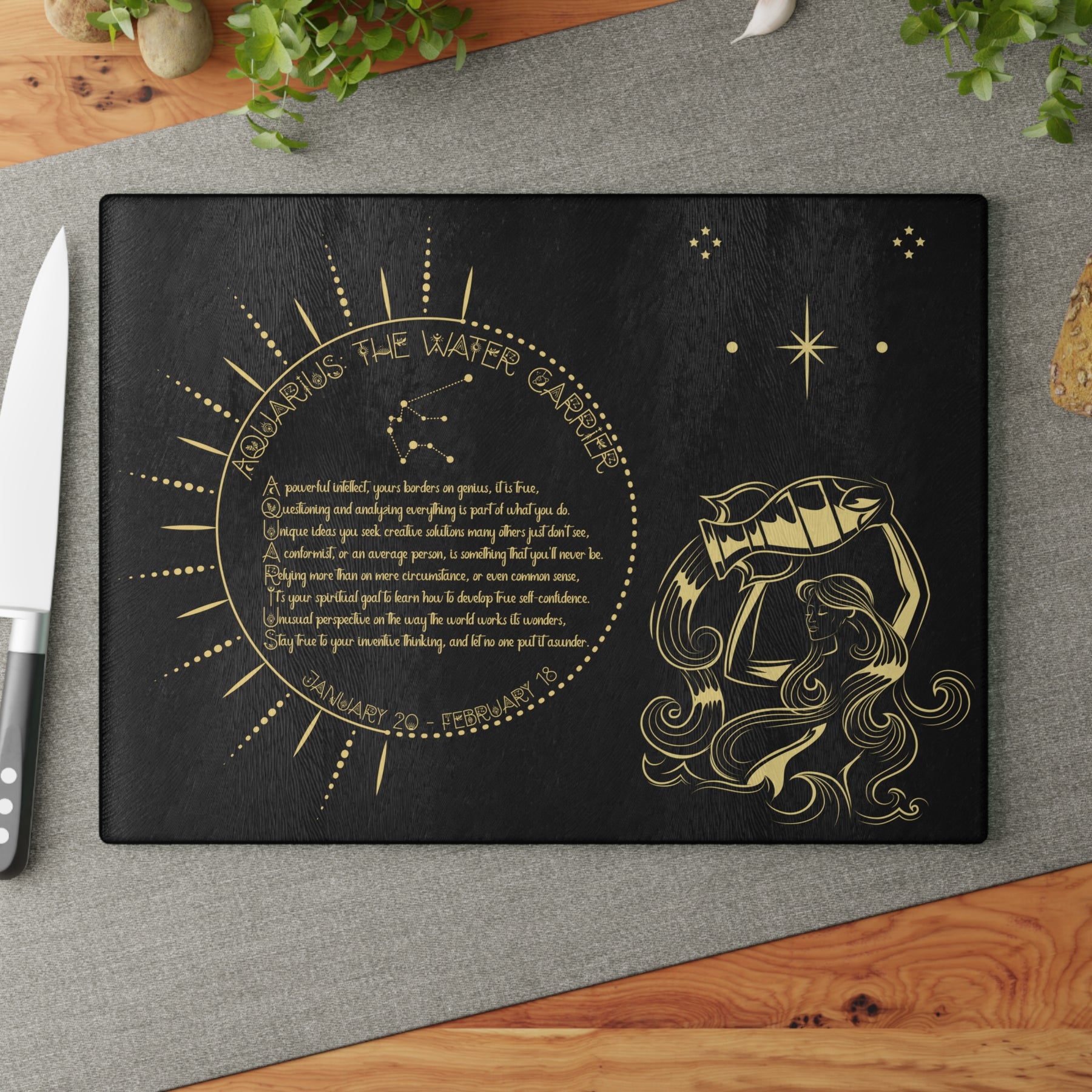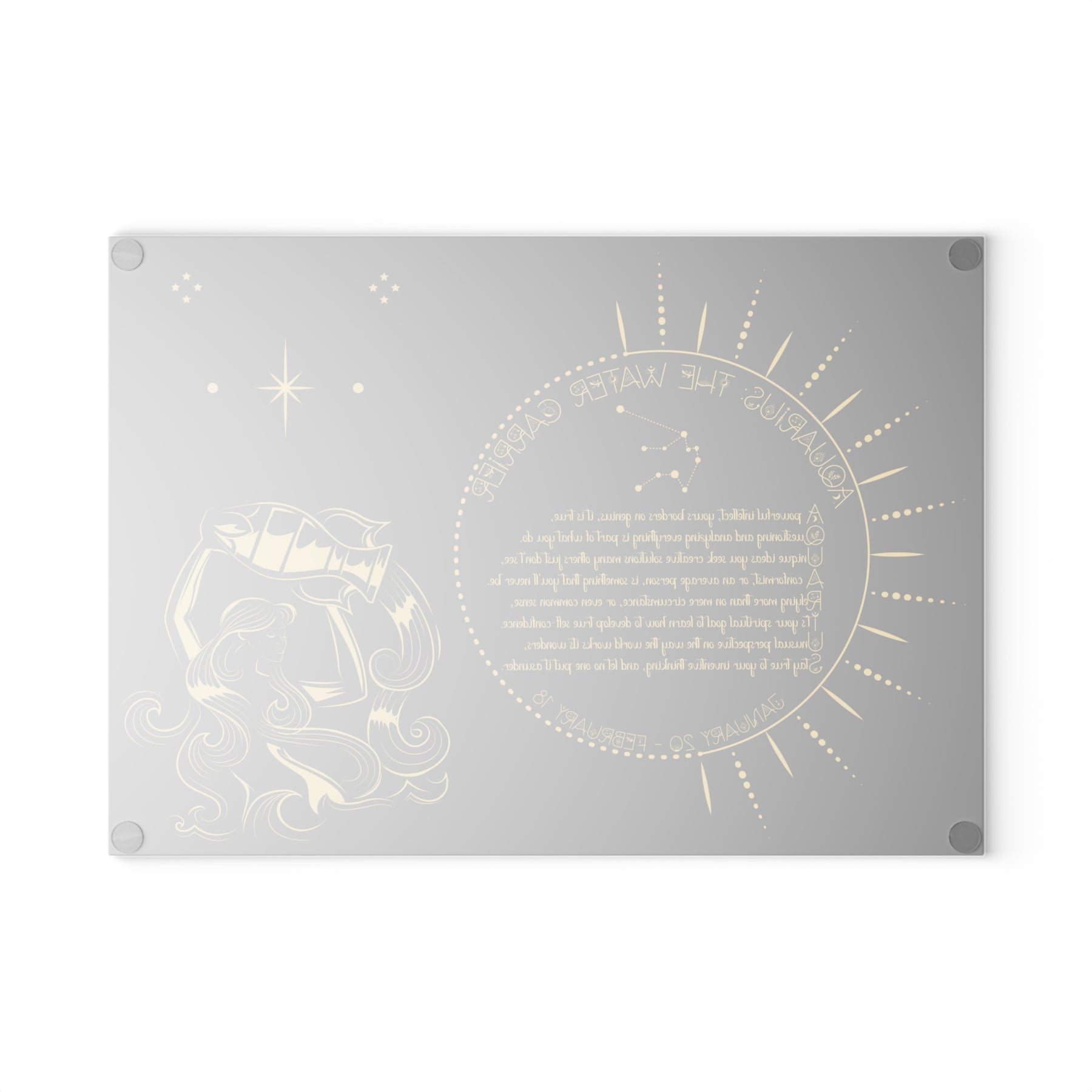 Add some personality to your kitchen with a custom glass cutting board from our Written in the Stars collection. The board features a poem spelling out Aquarius, accompanied by a Aquarius the WaterCarrier graphic and Celestial Font. The poem embodies the spiritual goal and traits associated with your sign. Made from durable tempered glass, it stands up to years of meal prep. The textured surface is perfect for chopping, slicing, and dicing. Four rubber feet keep it steady on your counter. Choose from two sizes: 8" x 11" or 11" x 15". For best results, hand wash only.
