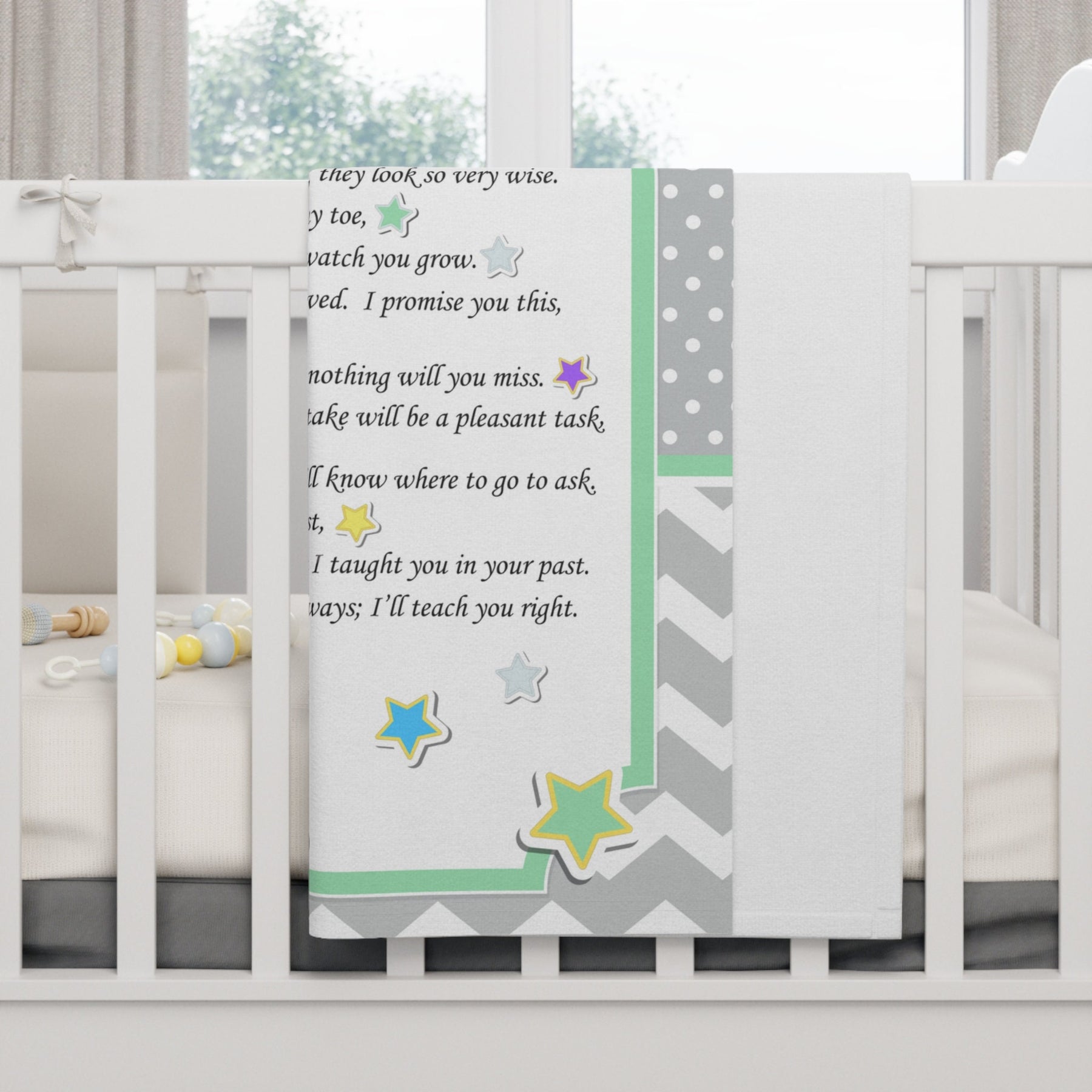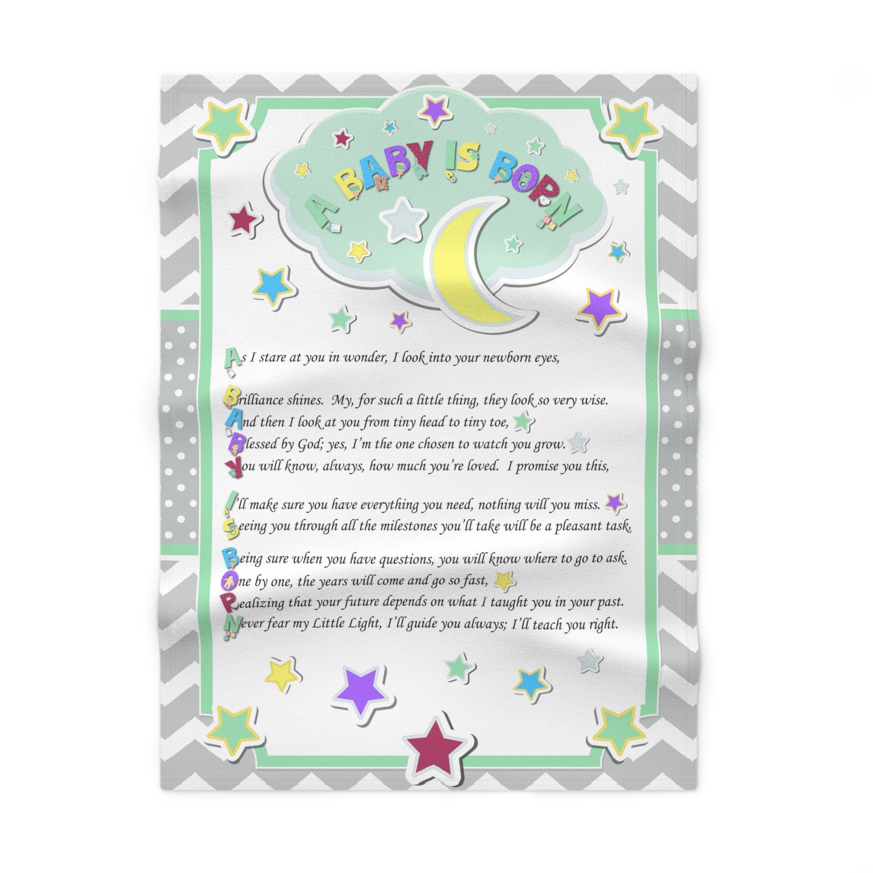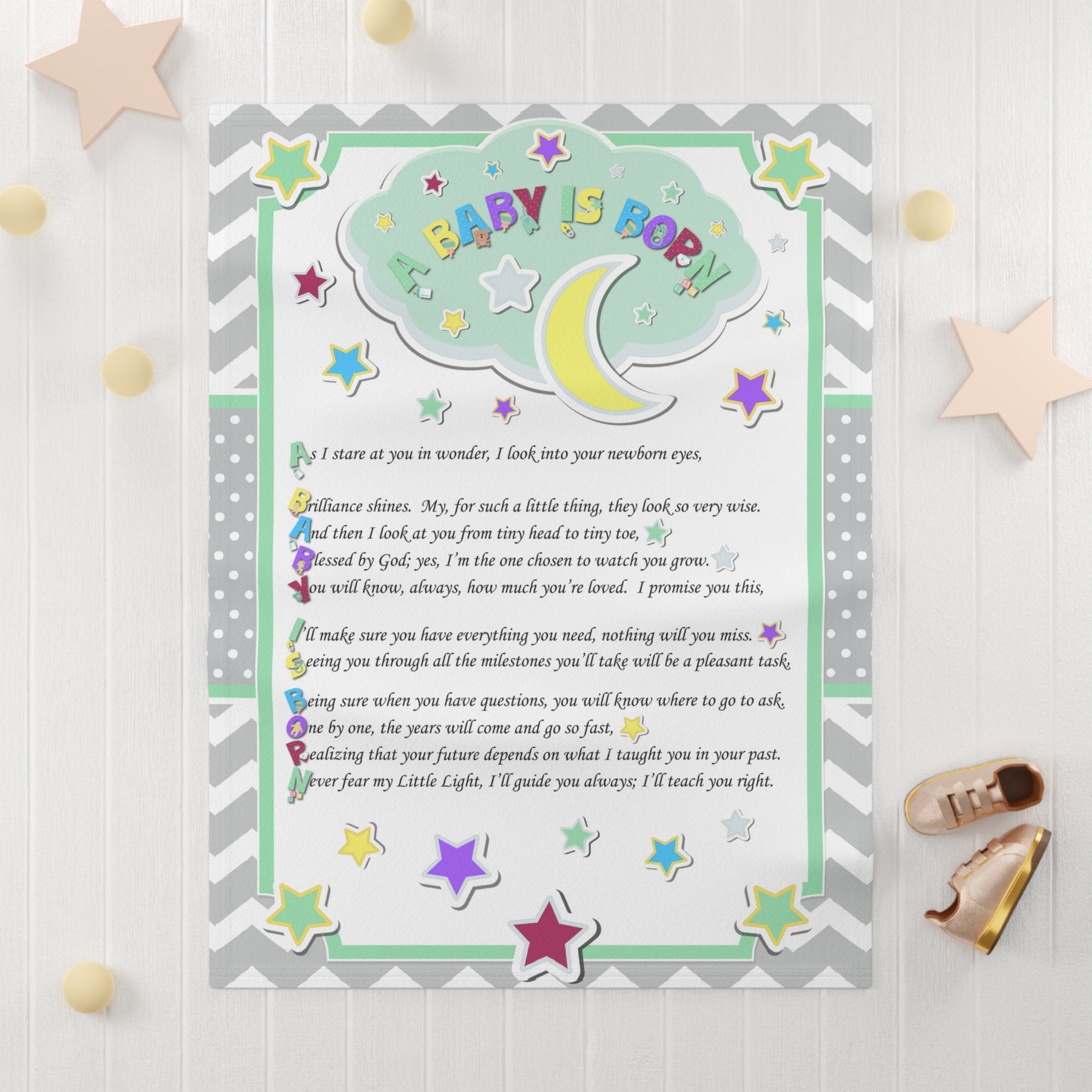 Snuggle up your baby in comfort and adoration with our Baby Steps Blanket Collection. Showcasing an acrostic poem that reads "A Baby is Born" and sporting the moon and stars, this sweet and cushy coverlet is ideal for a little one's room or as a one-of-a-kind baby shower present. Toast your newest addition to the family with Moments in Rhyme's delightful blanket. Delicate, snuggly and vivid, it's the perfect wrap for children's nurseries. What makes it so special, you ask? The precious font! Too cute to resist! Sure to become a forever keepsake!