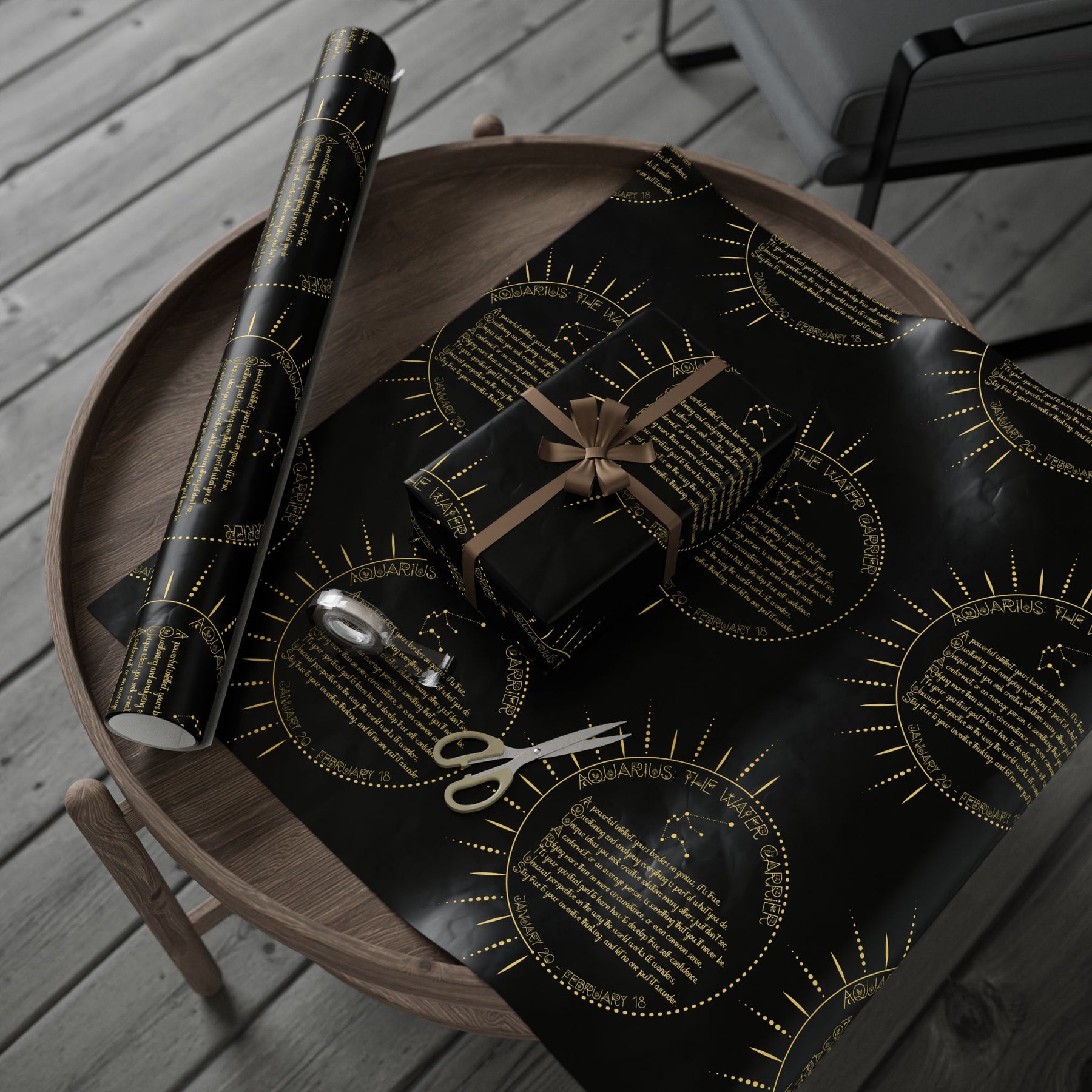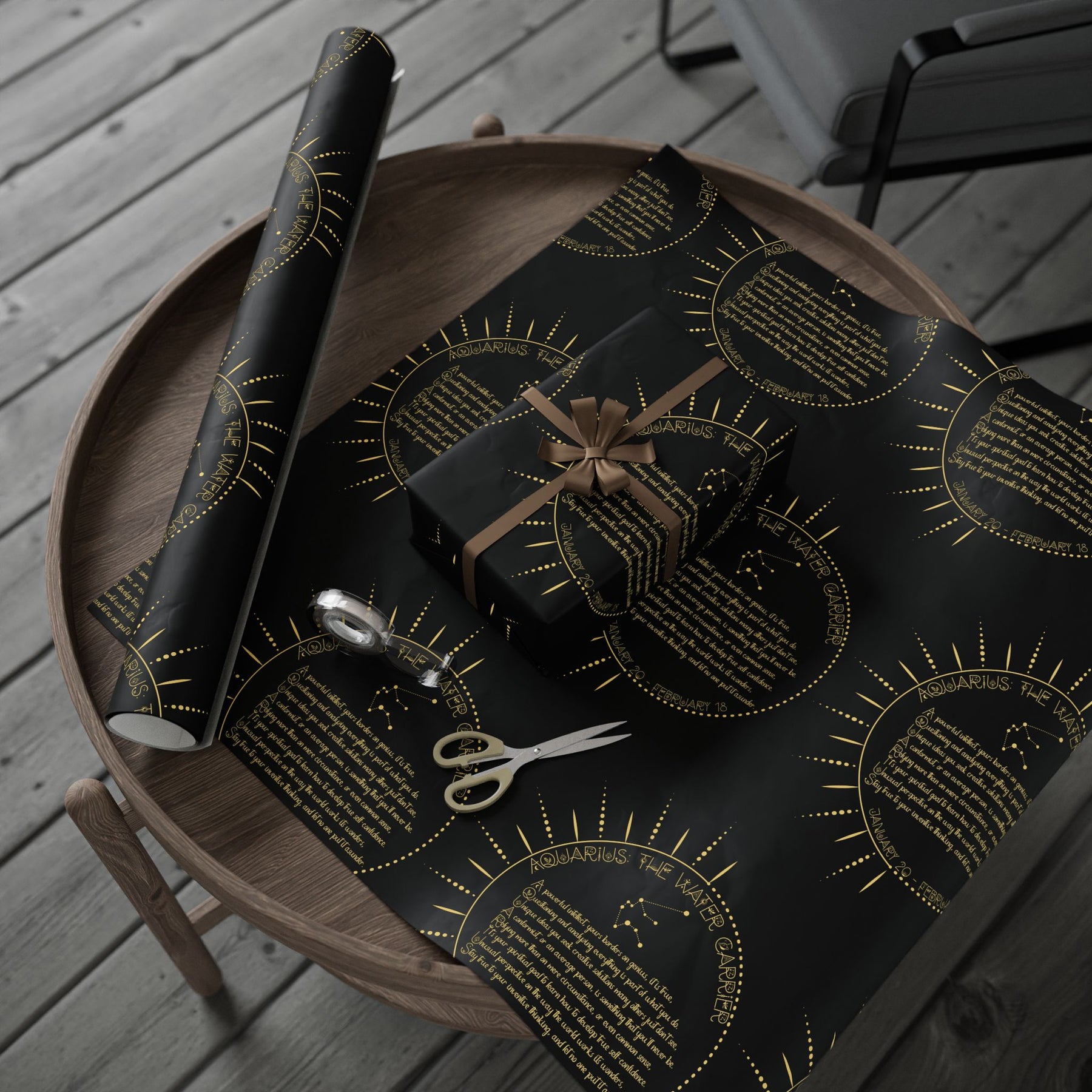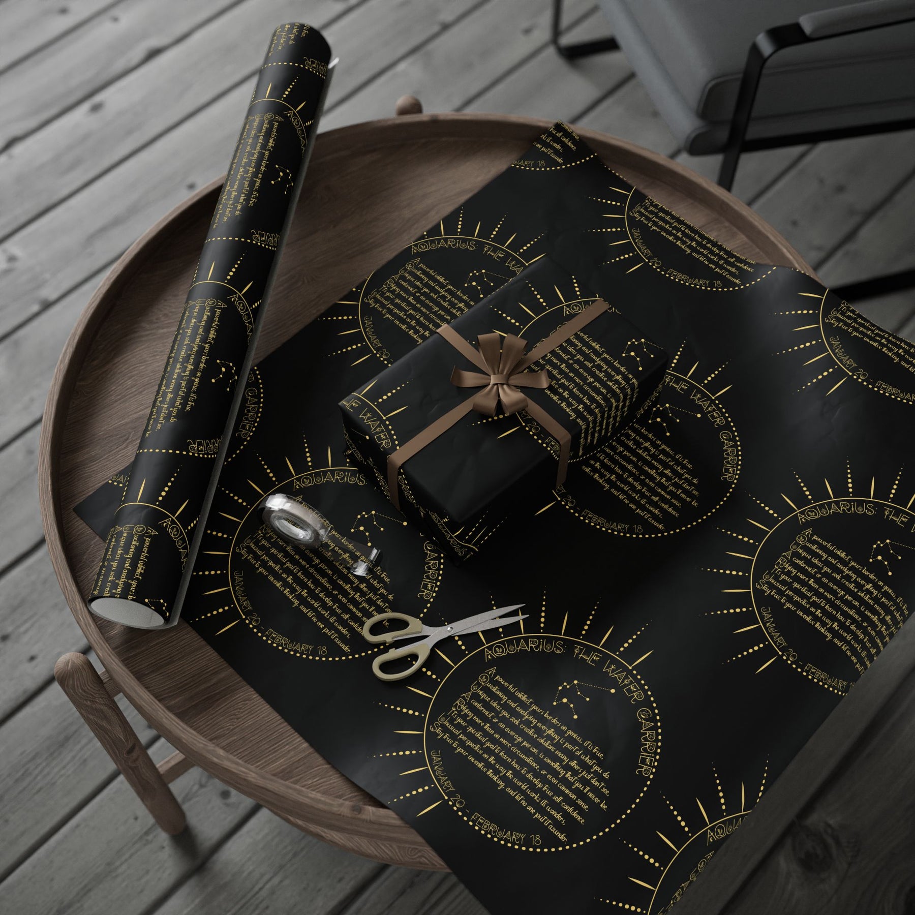 Elevate your gift-giving experience with Written in the Stars' beautiful wrapping paper. A unique acrostic poem spells out Aquarius, including the traits and spiritual goals of the sign. This product adds a touch of elegance and joy to any occasion. Perfect for birthdays or holidays, it brings a festive vibe that enhances the excitement of unwrapping. Ideal for those who appreciate aesthetic details in their celebrations, this wrapping paper is perfect for art lovers and anyone seeking to make a thoughtful impression. The glossy or matte finish adds to the allure, making each gift stand out. Whether you're wrapping a small token or a large present, this wrapping paper will surely make a lasting impression. Available in three versatile sizes: 30" × 36", 30" × 72", and 30" × 180". Includes white spaces at the top and bottom edges for a clean finish.