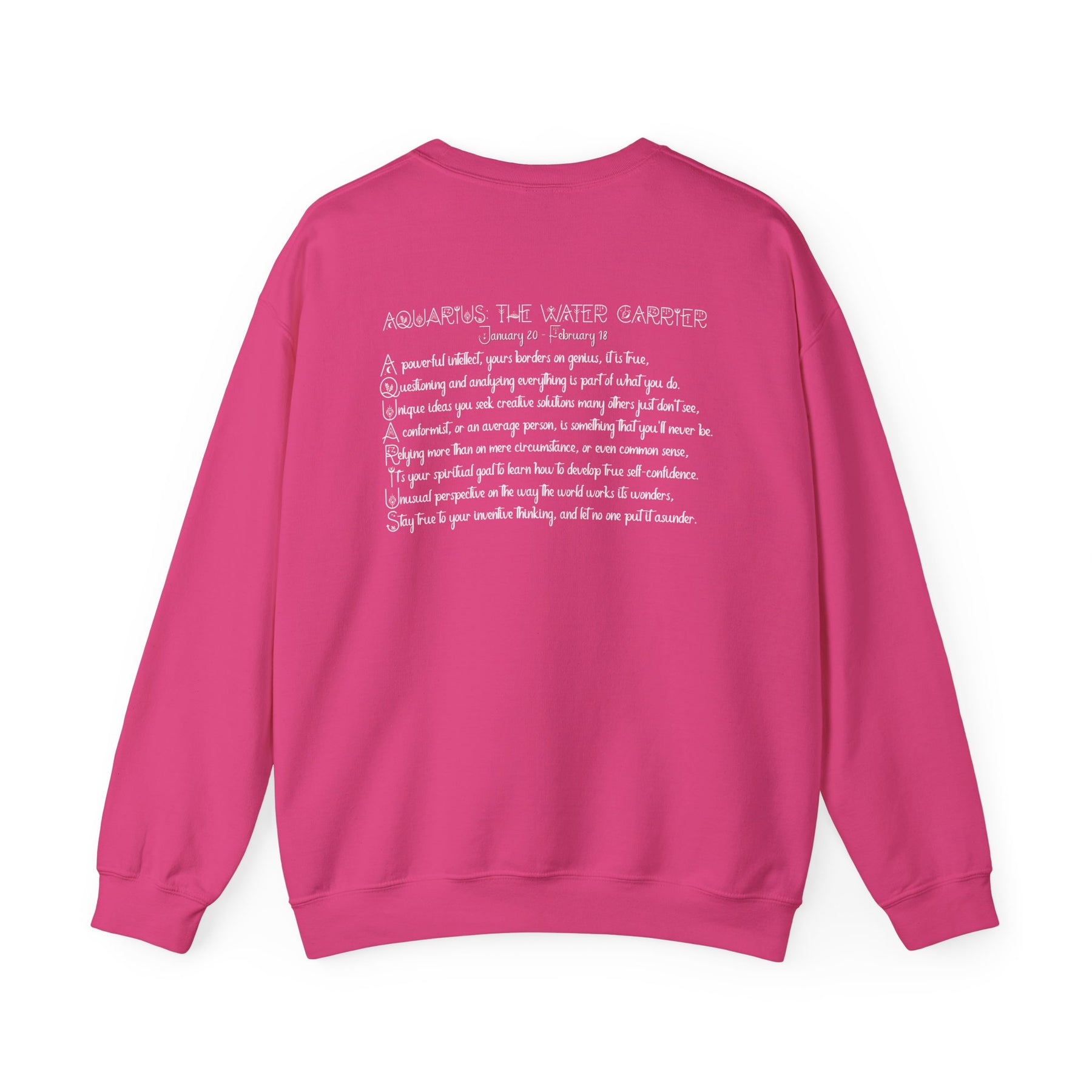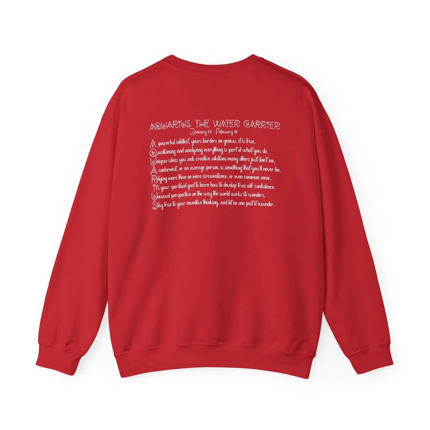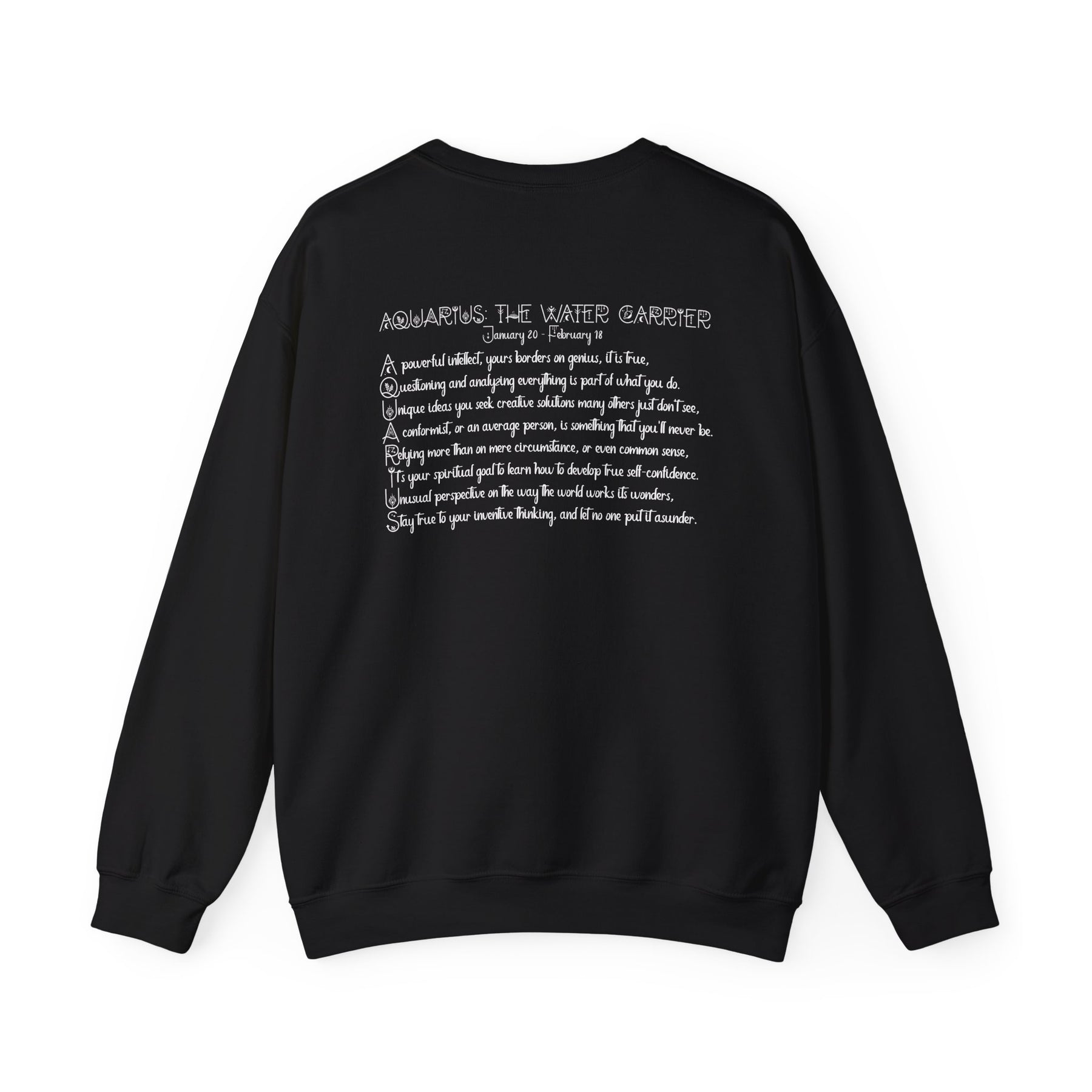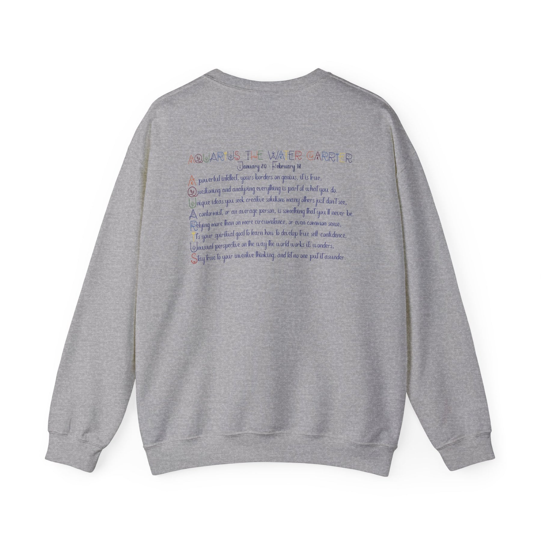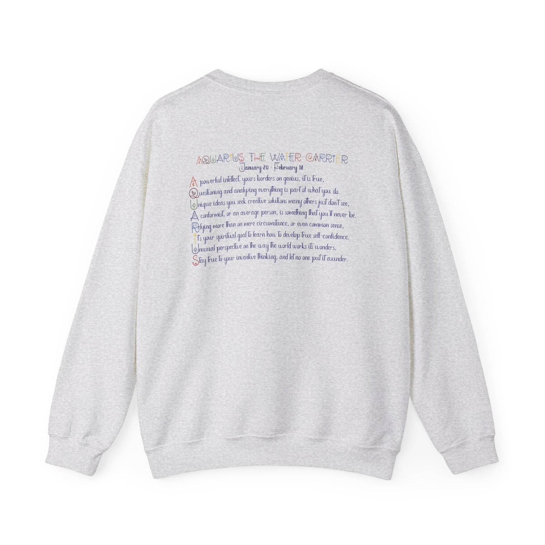 Our Written in the Stars acrostic poem sweatshirt spells out Aquarius and is a fun way for astrology fans to proudly display their sign. Your horoscope sign appears on the front, while the back features an acrostic poem inspired by Gemini's traits and spiritual goals. This sweatshirt is comfortable, durable, and adds a playful astrological touch to your day. It's an excellent staple for your wardrobe and sure to spark conversations with fellow astrology lovers. Plus, the Celestial font really stands out!