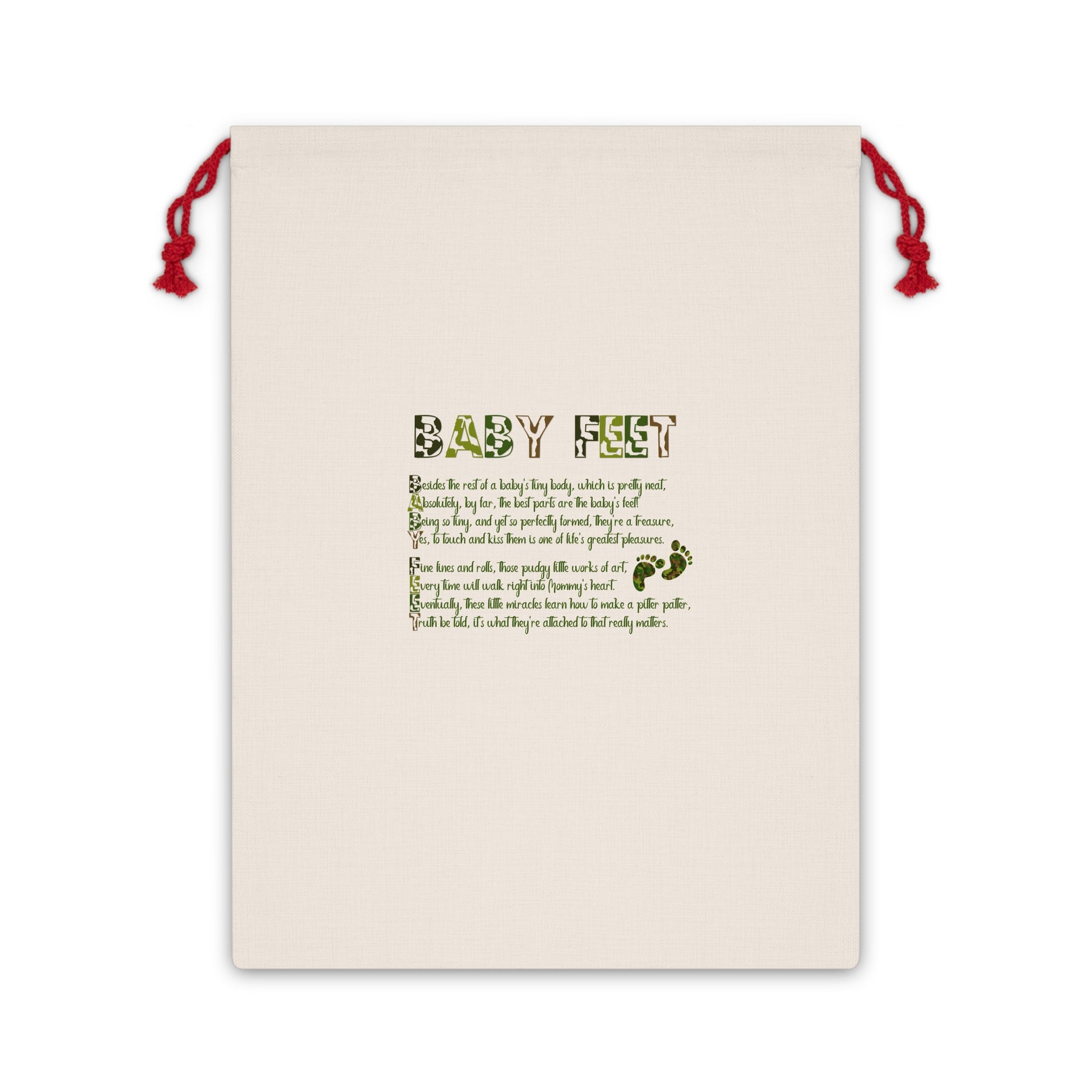 Moments in Rhyme introduces our Baby Feet, a stylish gift bag from Baby Steps, featuring an adorable camo baby foot design that adds a unique touch to any baby shower. Its vintage look evokes nostalgia while keeping presents secure. This bag will be an eye-catcher and a conversation starter. The spacious interior allows for multiple gifts, making it a versatile choice. With a secure drawstring closure, it is both functional and chic. Designed for those who value creativity and thoughtfulness in gift-giving. Made from 95% polyester and 5% cotton. Spot clean only. Do not bleach.