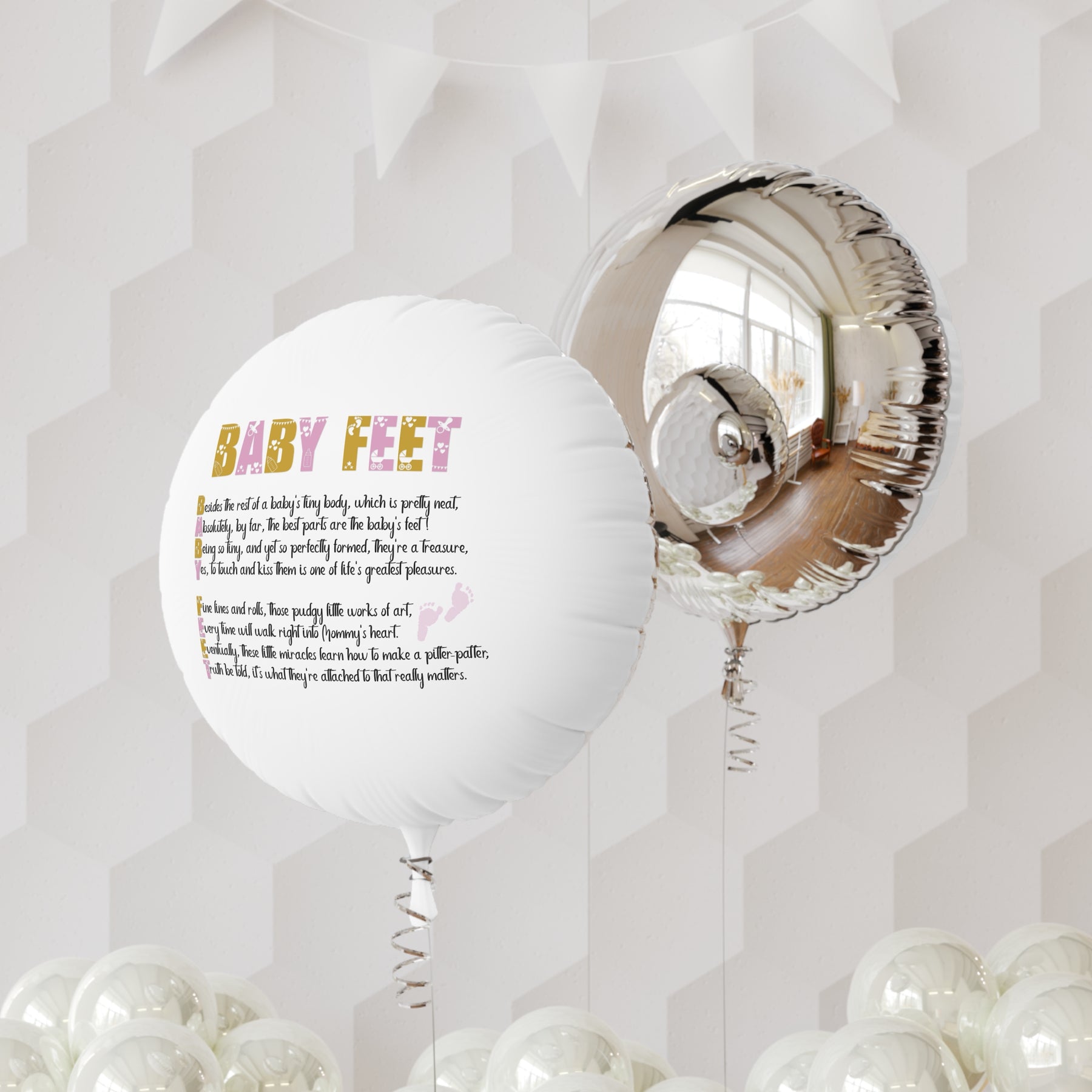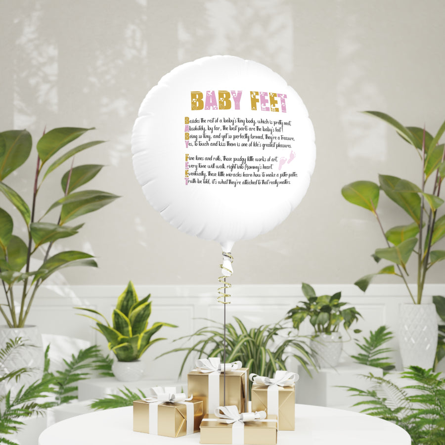 Baby Steps round Mylar helium balloons are perfect for baby showers, featuring an adorable design that matches other party supplies. this one spells out Baby Feet with a darling acrostic poem. Bring a cute and festive atmosphere to your celebration with these balloons. Ideal for those hosting baby showers and other special events where balloons are a must-have decoration. To personalize this balloon, enter the baby's first name at checkout. A $5.00 personalization fee will be added to your cart at checkout.