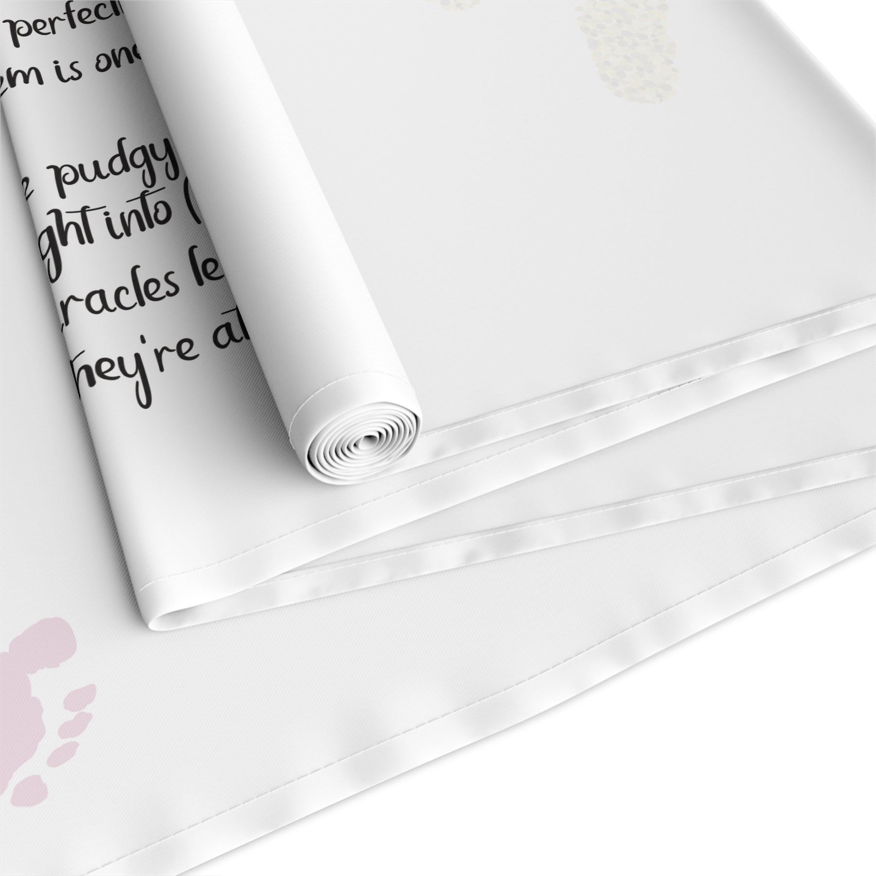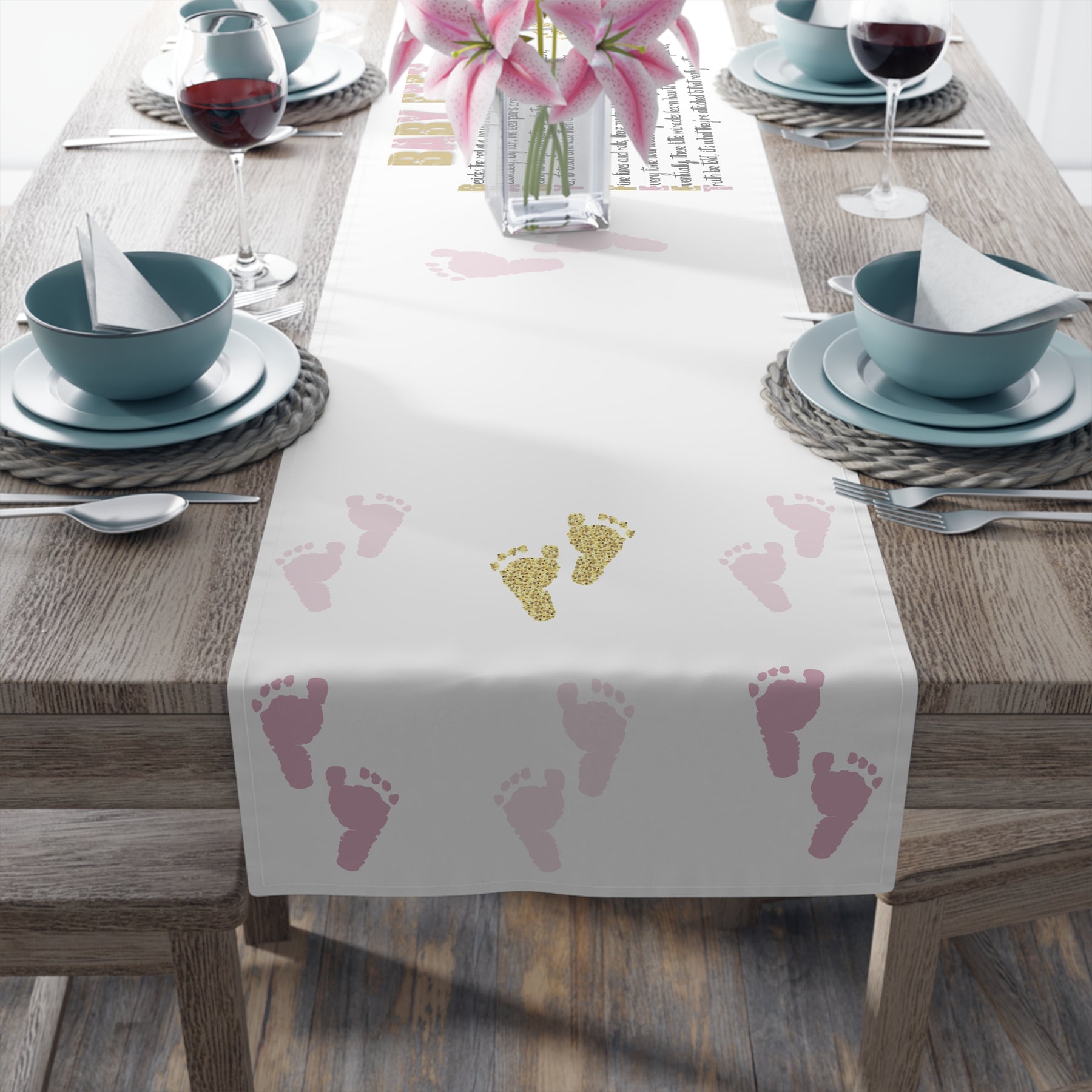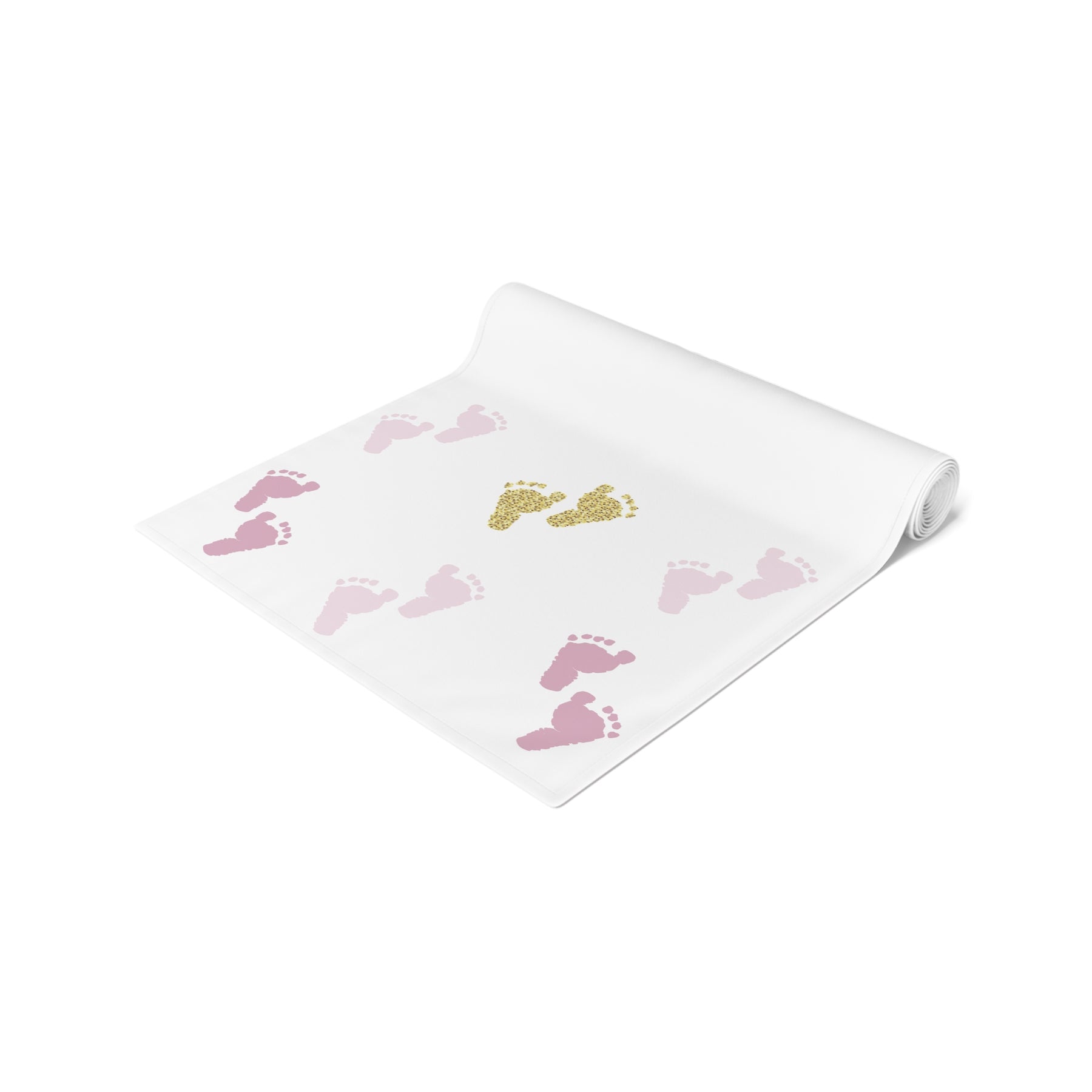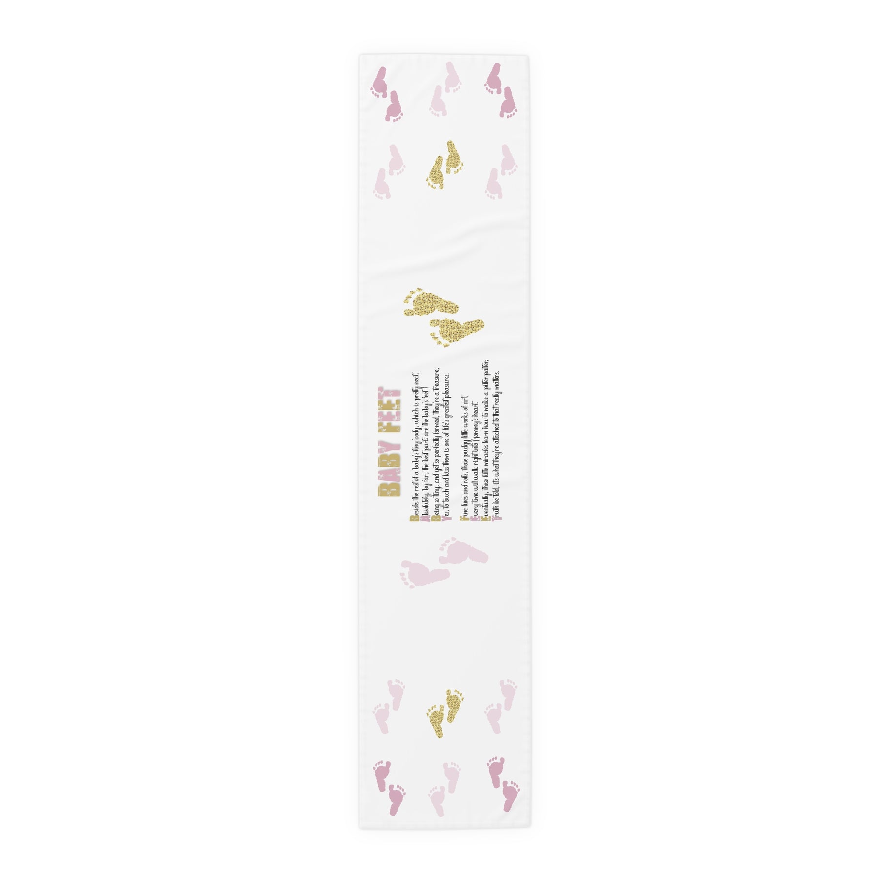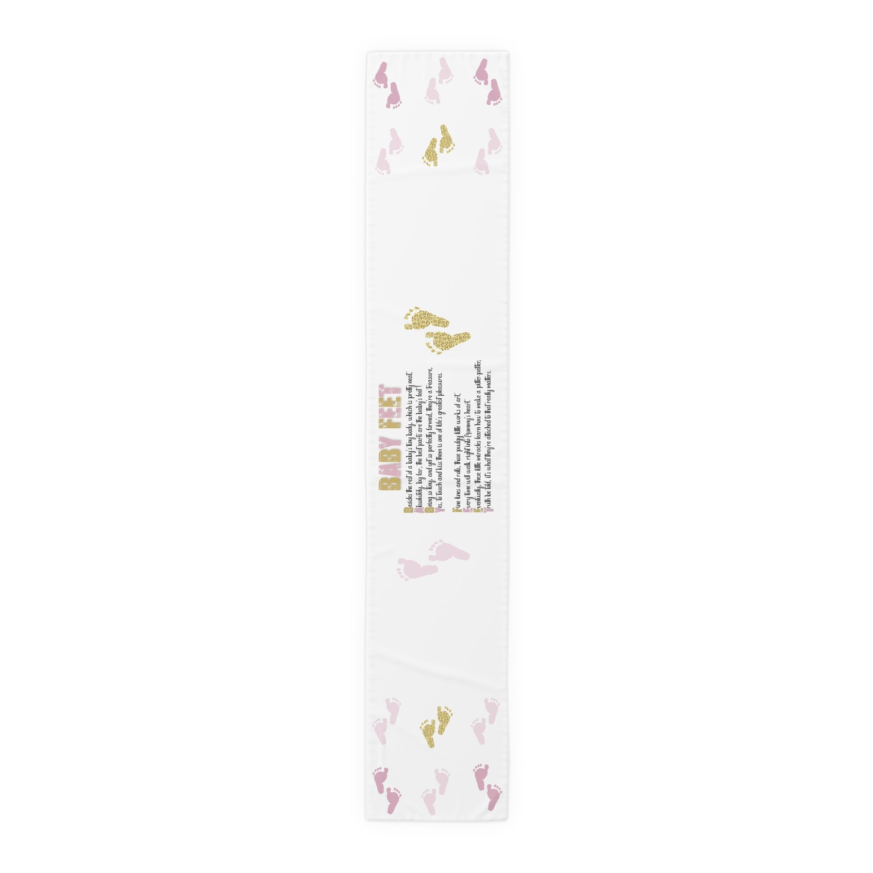 Elevate any baby shower decor with our "Baby Steps" stylish table runner, with an acrostic poem spelling out "Baby Feet", and a precious pink and gold design and font. It's available in either cotton twill or polyester. Perfect for adding a pop to the table setting, this runner is ideal for creating a fun atmosphere at any baby shower.