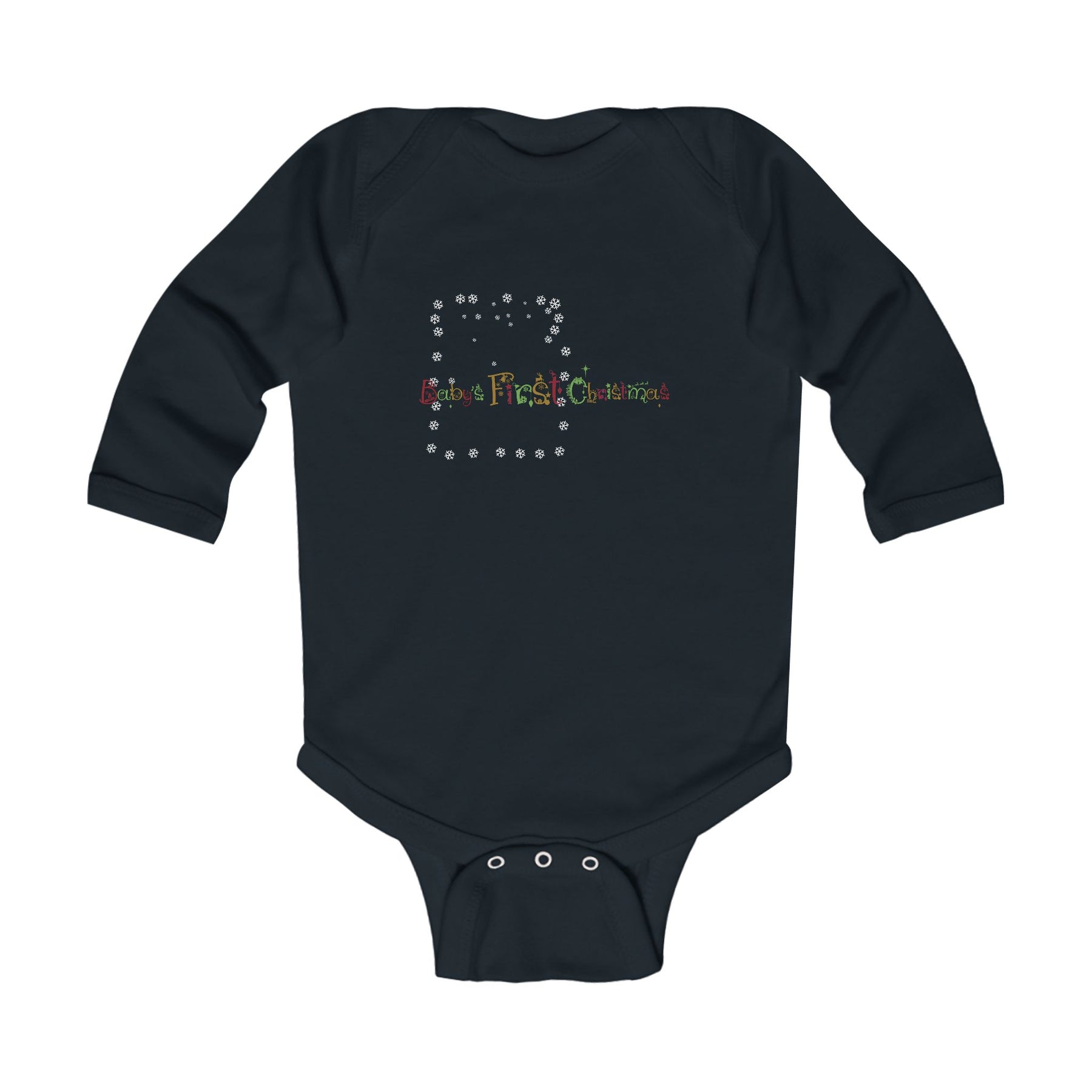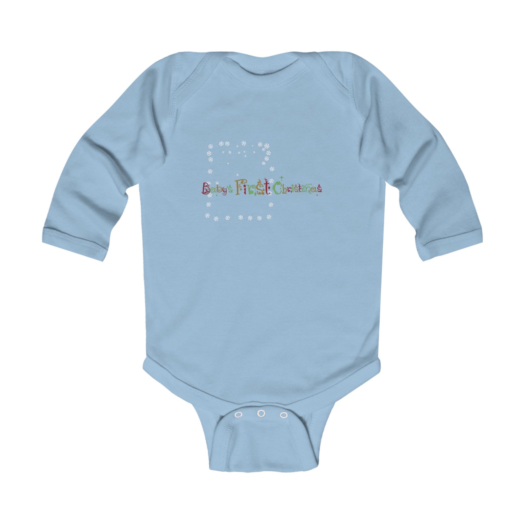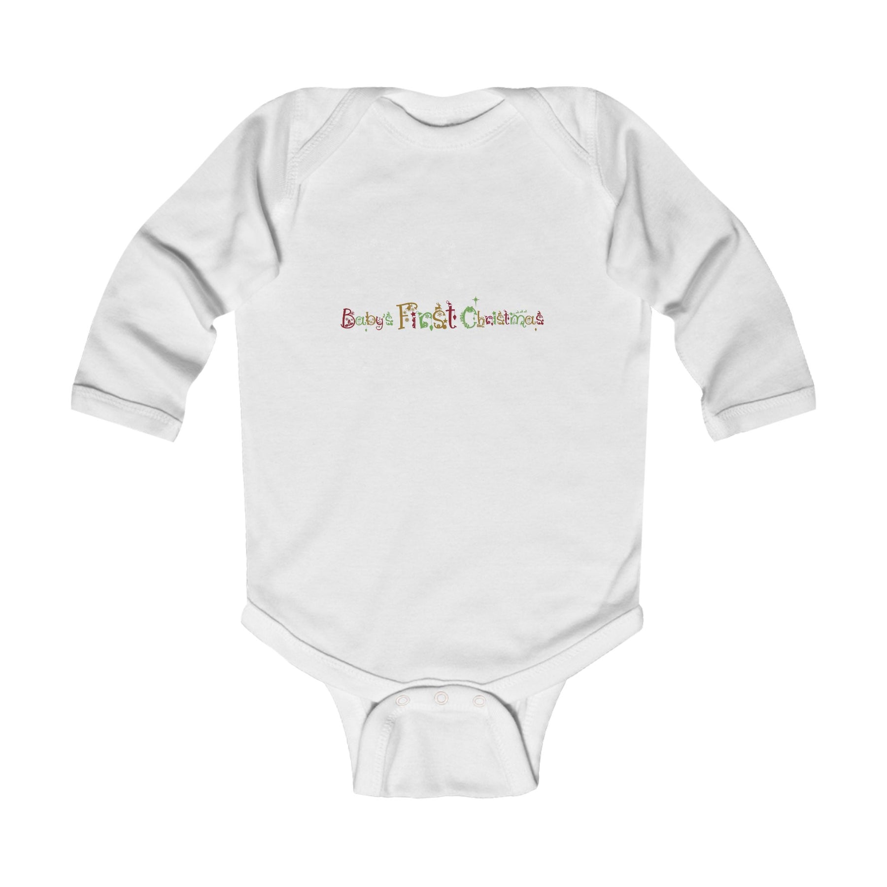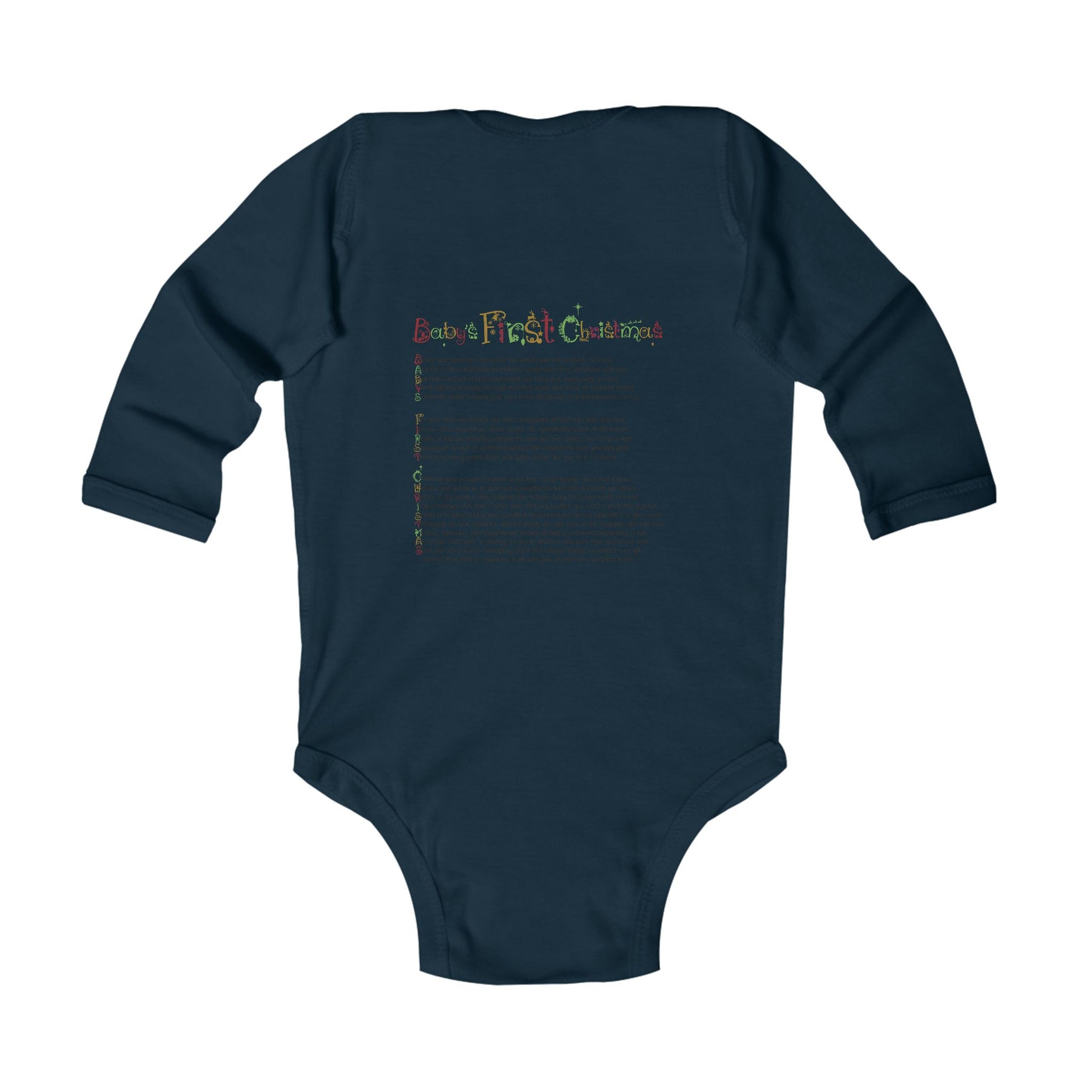 "Baby Steps" infant long-sleeve bodysuit brings comfort and style to your little one’s wardrobe. This one has an acrostic poem that spells out "Baby's First Christmas". Crafted from soft, breathable cotton, this garment allows for unrestricted movement, making it perfect for playful babies. The classic fit and light fabric make it an essential piece for newborns and toddlers. Ideal for family holiday gatherings. This bodysuit is a wonderful gift for baby showers. Its charming design adds a festive touch, making it a delightful choice for parents who value both comfort and aesthetics. Celebrate every moment with this lovely addition to your baby's attire! To personalize it, enter the baby's first name upon checkout.