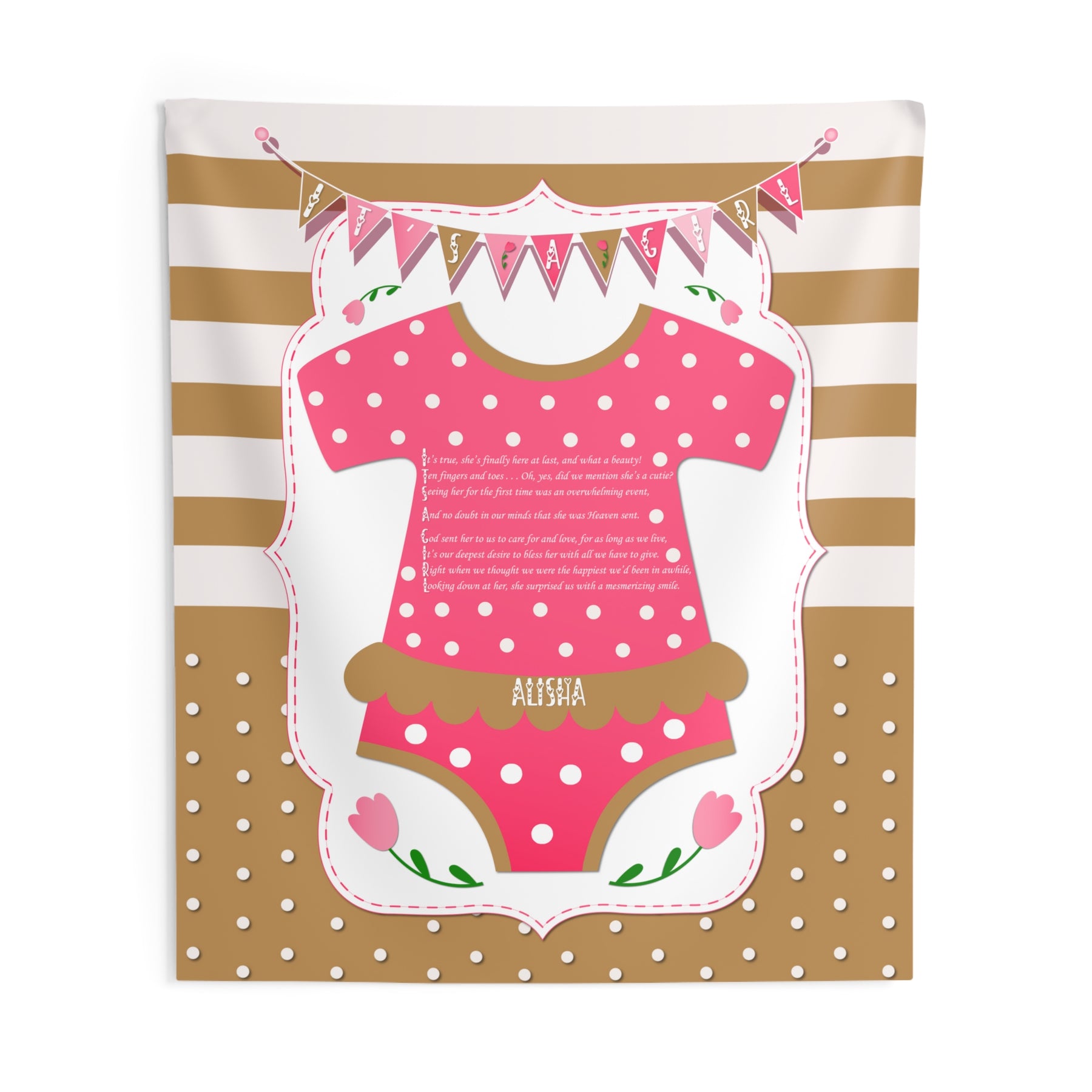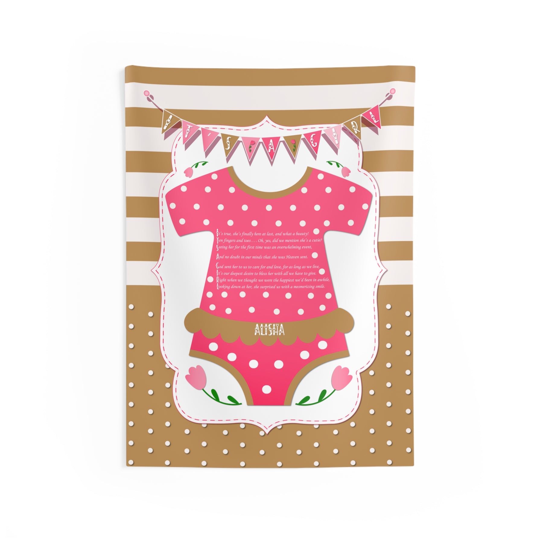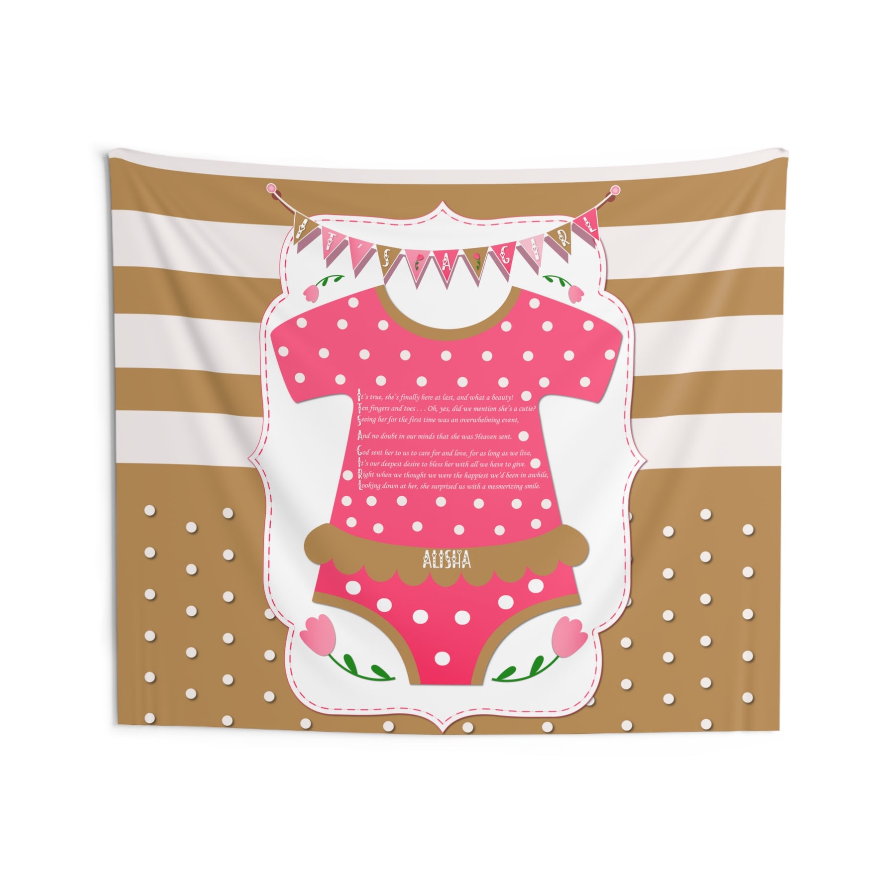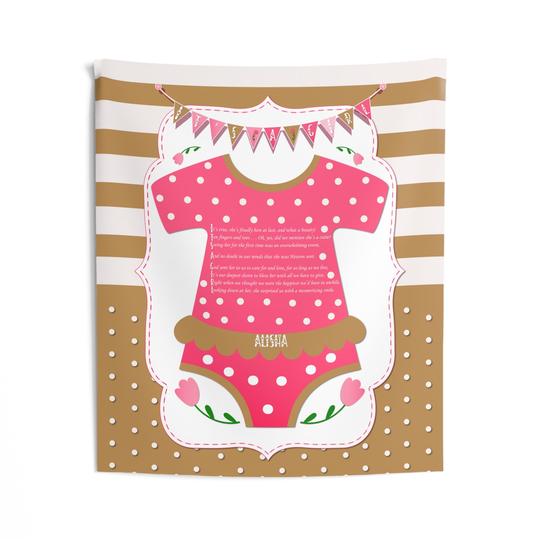 Transform the atmosphere of any baby shower with our "It's a Girl" indoor wall tapestry/backdrop. This darling design features an adorable baby body suit design with polka dots, and an acrostic poem spelling out "It's a Girl, and a heartfelt message to welcome a new baby. Advanced printing techniques ensure every detail is perfect, no matter how intricate the design. With a variety of sizes to choose from, you can create the perfect look for your special occasion. Just tell us the precious baby girl's first name, and we'll take it from there.