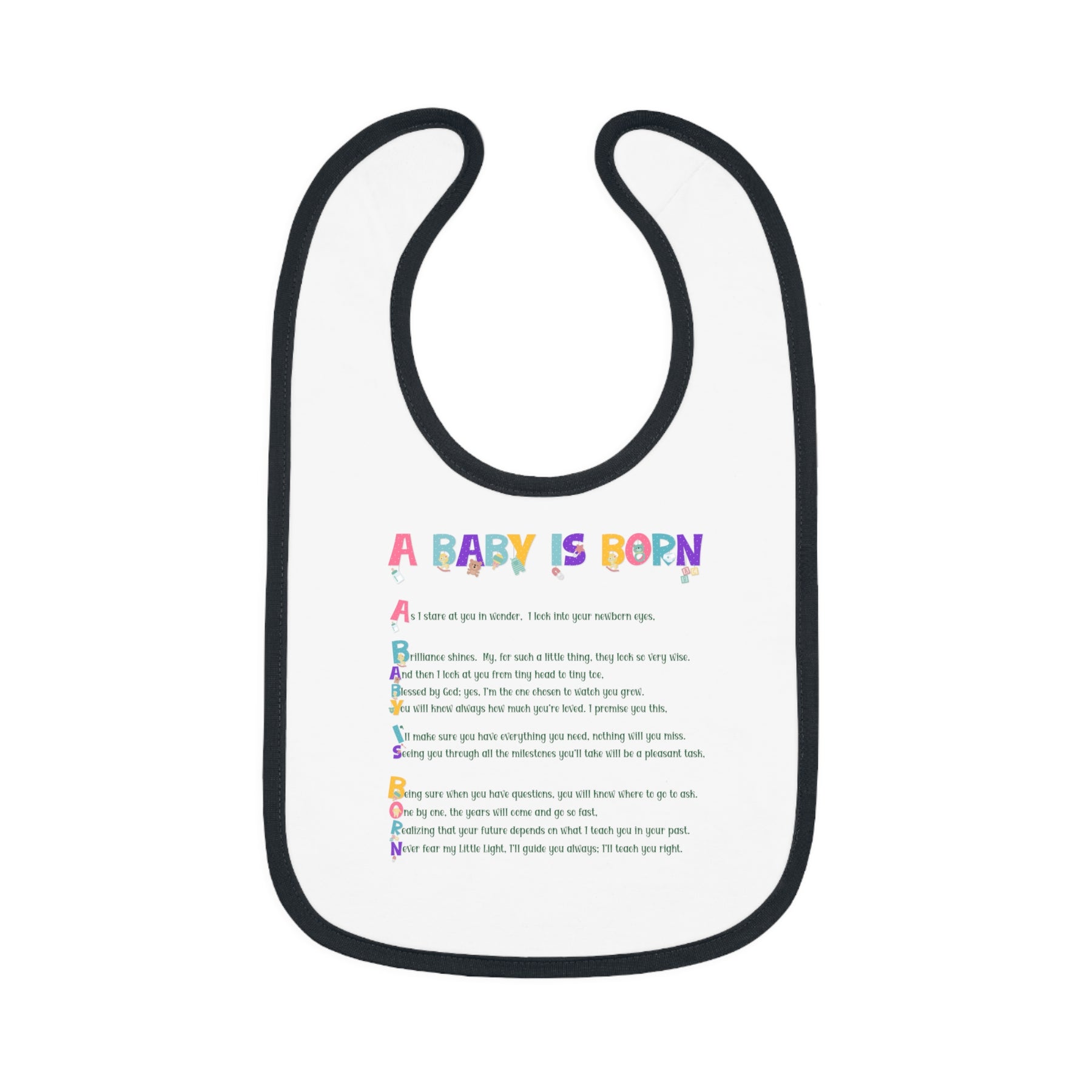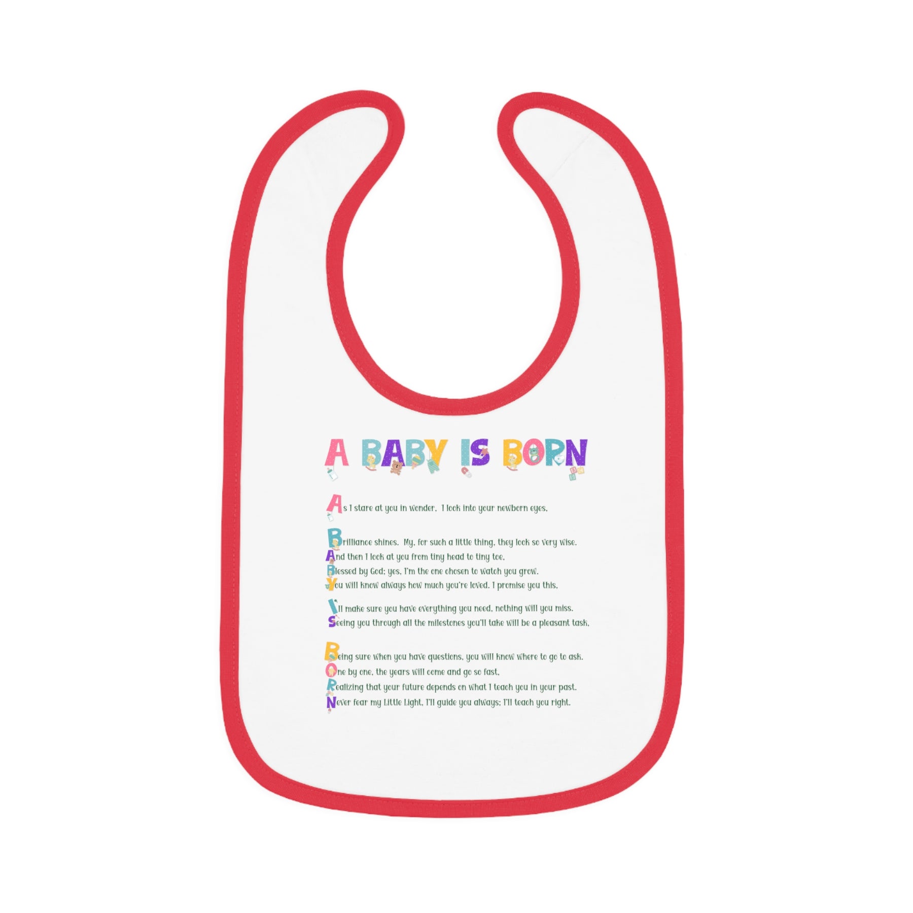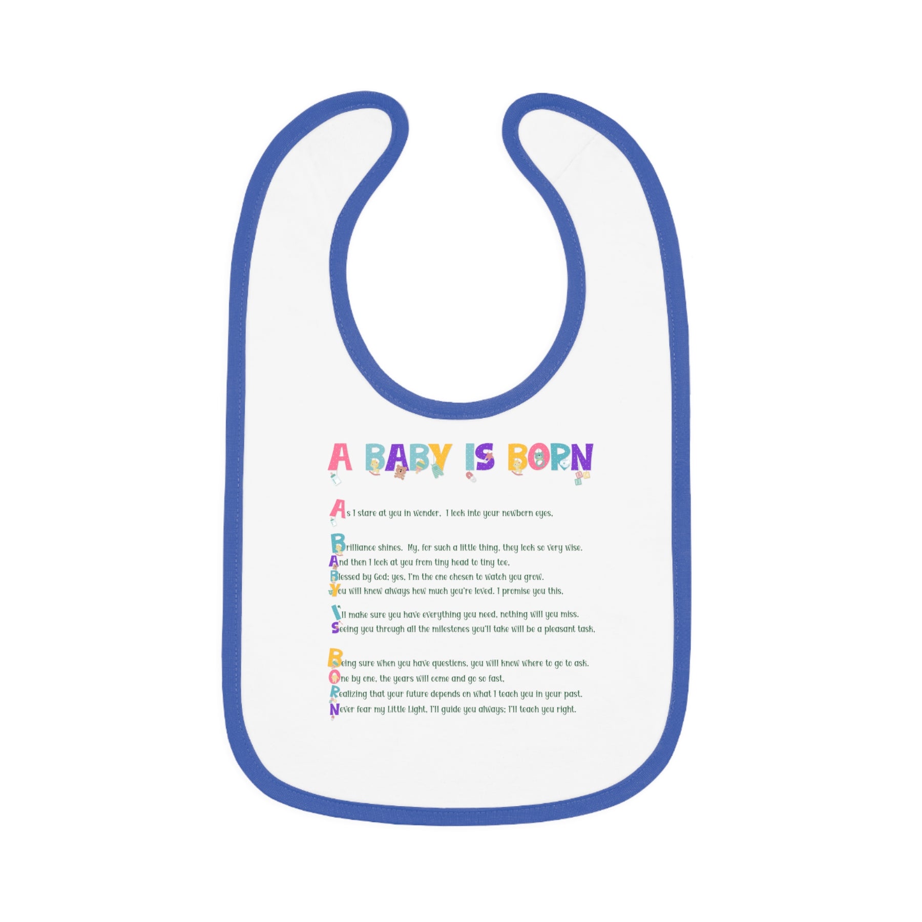 Mealtimes just became more fun with our "Baby Steps" baby bib collection. This one has an acrostic poem that spells out, "A Baby is Born". Featuring a 100% Ring-spun Cotton fabric for delicate softness, an original Velcro® closure for a secure fit during meals, they are as adorable as they are comfy. Plus, the contrast self-fabric binding makes for a seamless look. These make a fantastic, unique baby shower gift!