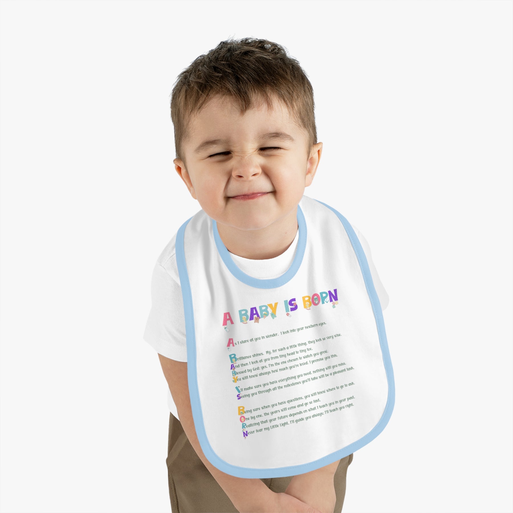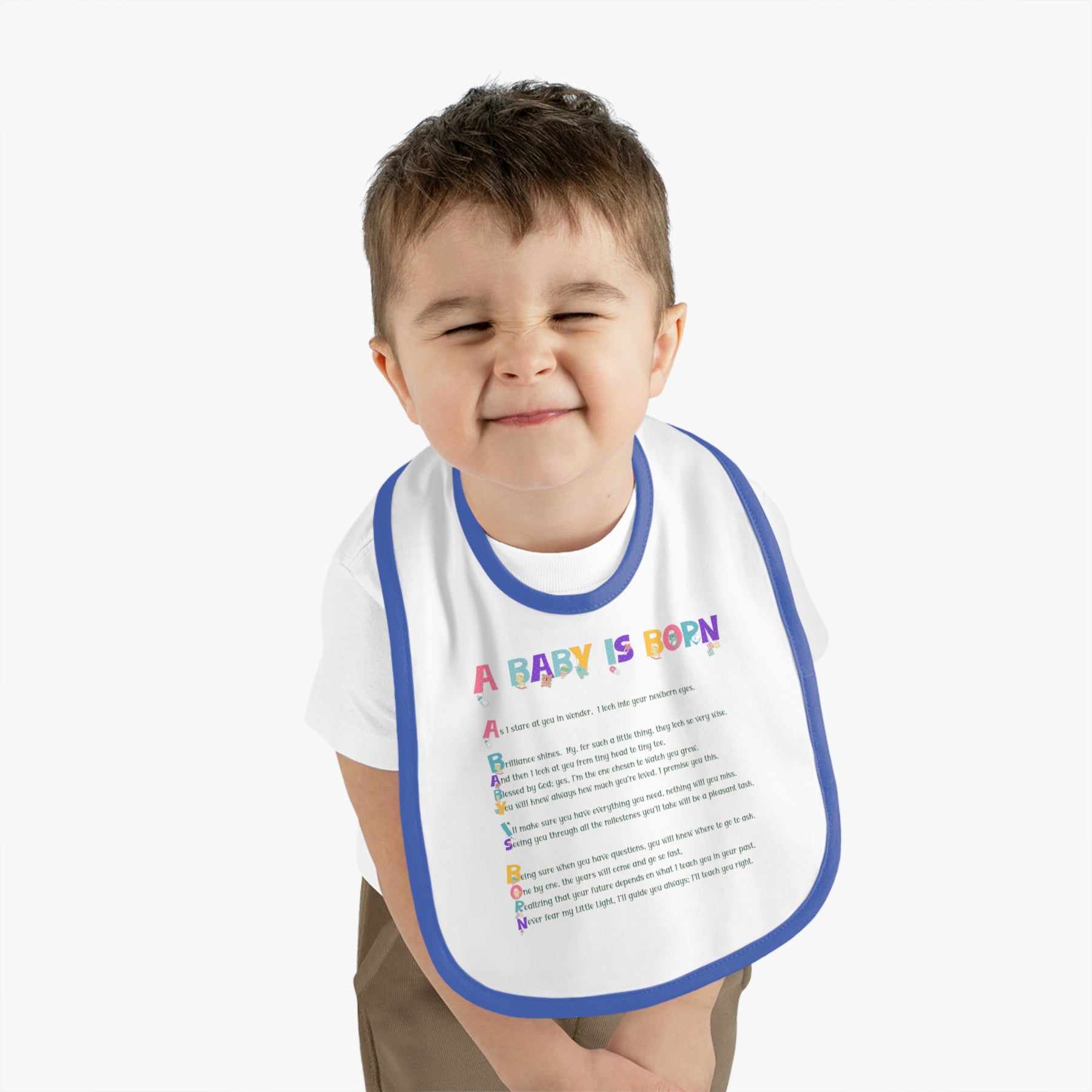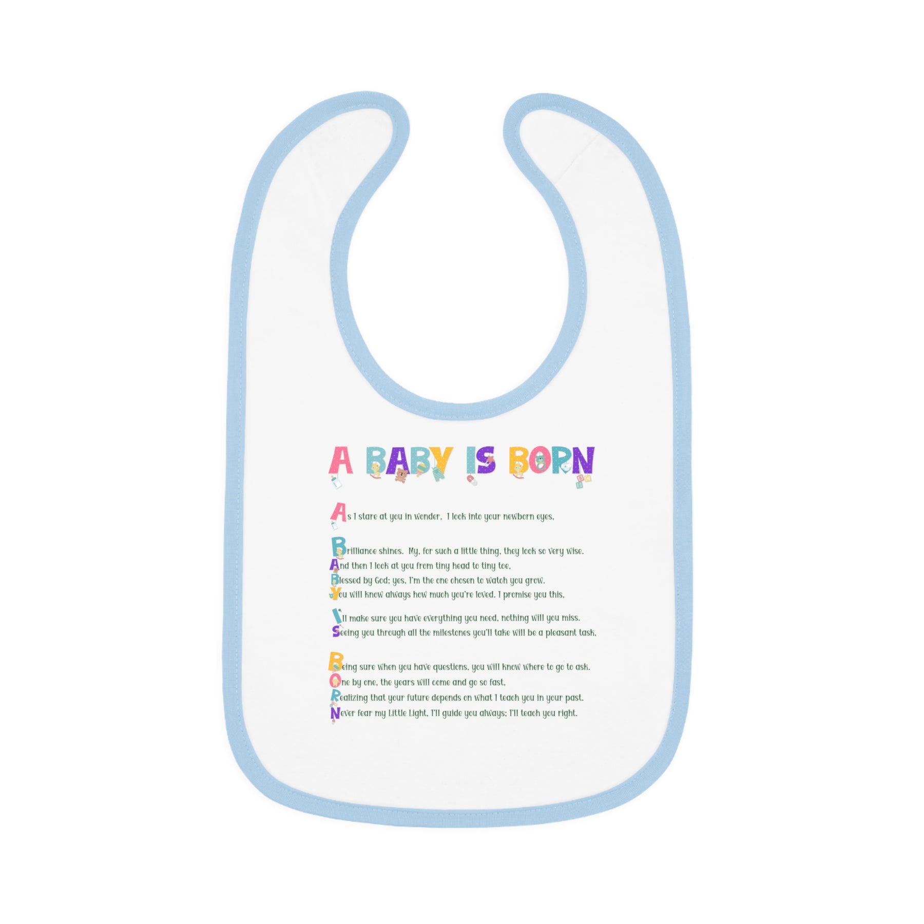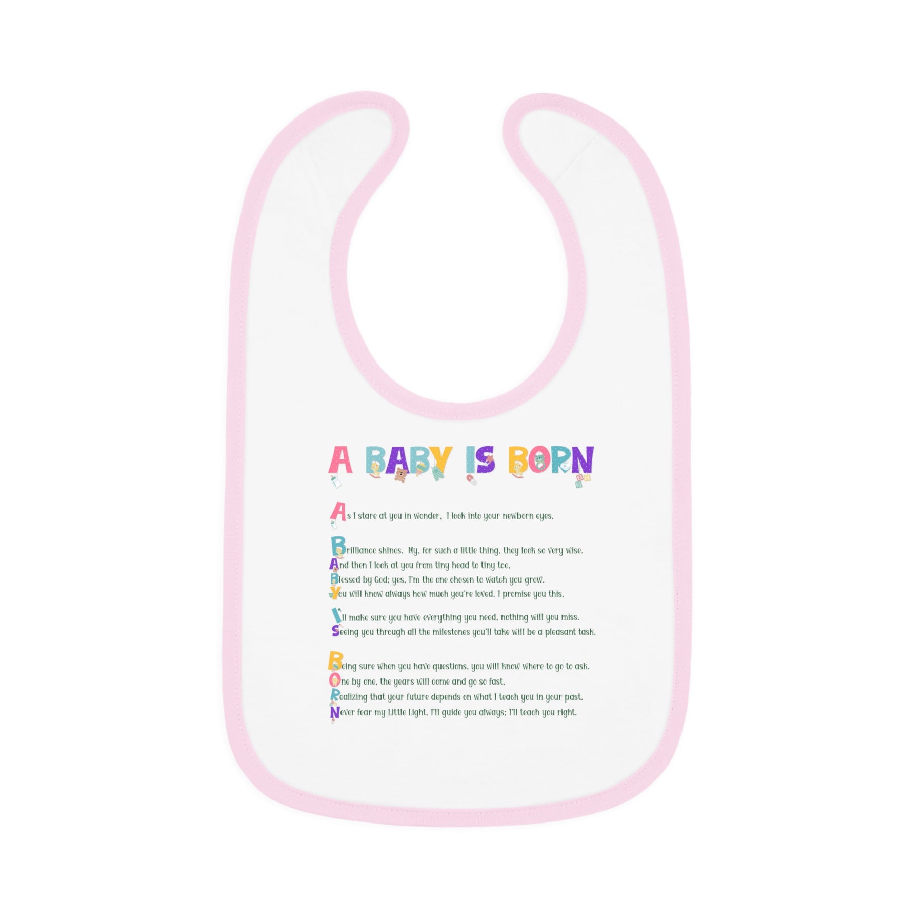 Mealtimes just became more fun with our "Baby Steps" baby bib collection. This one has an acrostic poem that spells out, "A Baby is Born". Featuring a 100% Ring-spun Cotton fabric for delicate softness, an original Velcro® closure for a secure fit during meals, they are as adorable as they are comfy. Plus, the contrast self-fabric binding makes for a seamless look. These make a fantastic, unique baby shower gift!