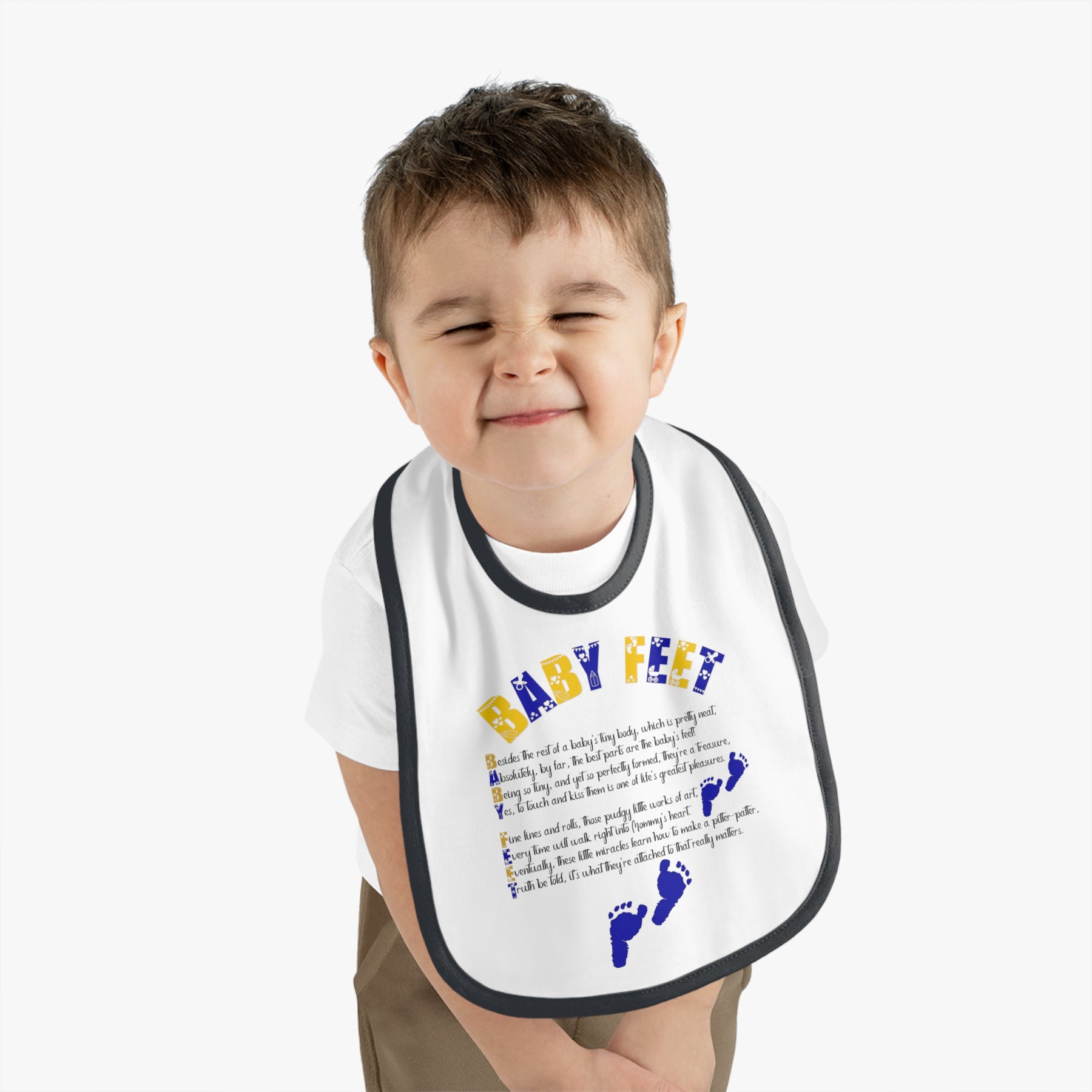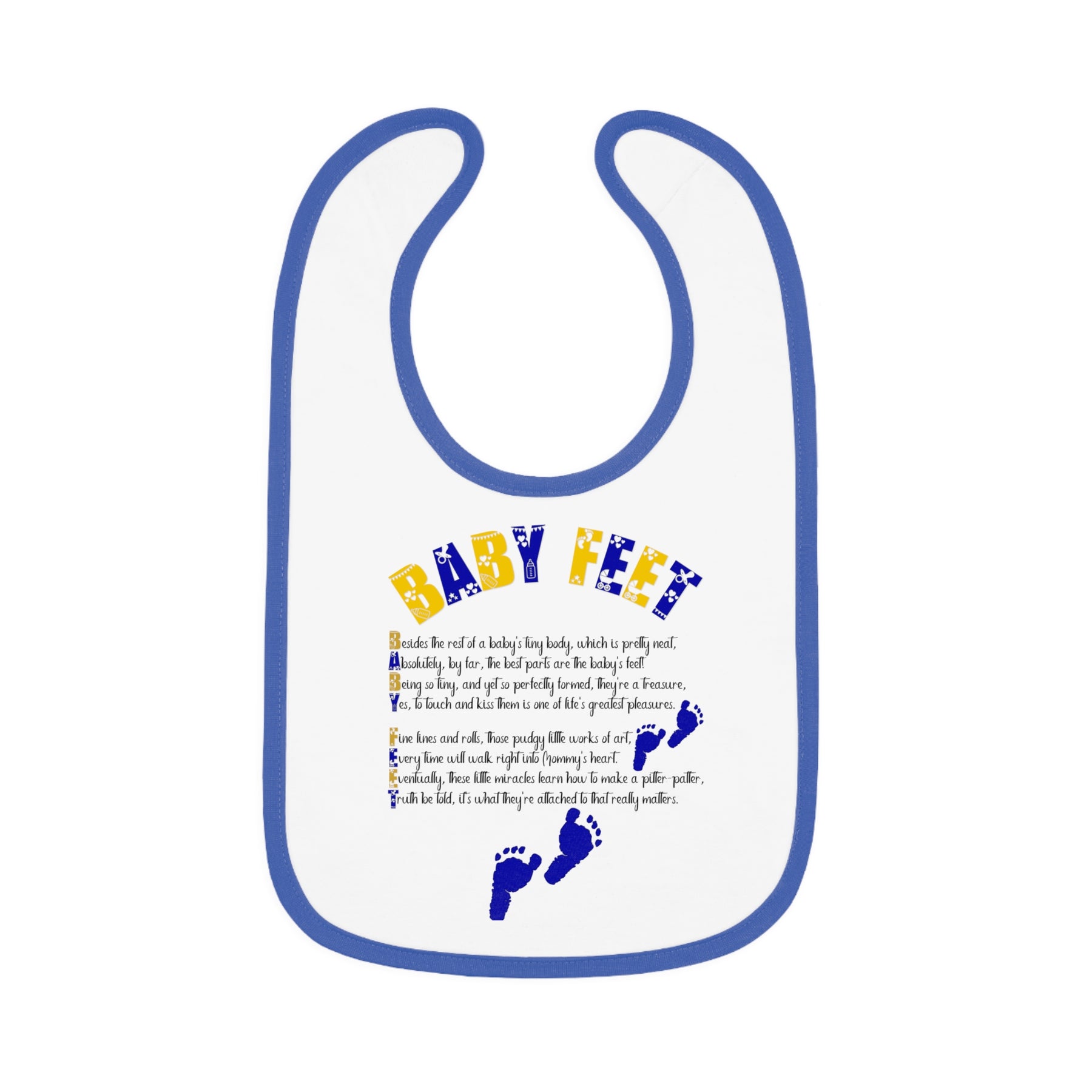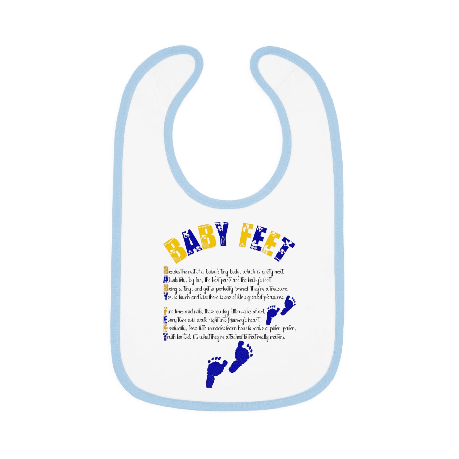 Mealtimes just became more fun with our "Baby Steps" baby bib collection. This one has an acrostic poem that spells out, "Baby Feet". Featuring a 100% Ring-spun Cotton fabric for delicate softness, an original Velcro® closure for a secure fit during meals, they are as adorable as they are comfy. Plus, the contrast self-fabric binding makes for a seamless look. These make a fantastic baby shower gift.
