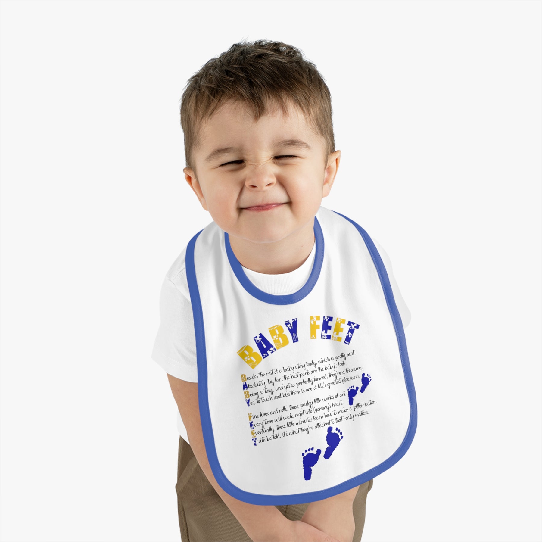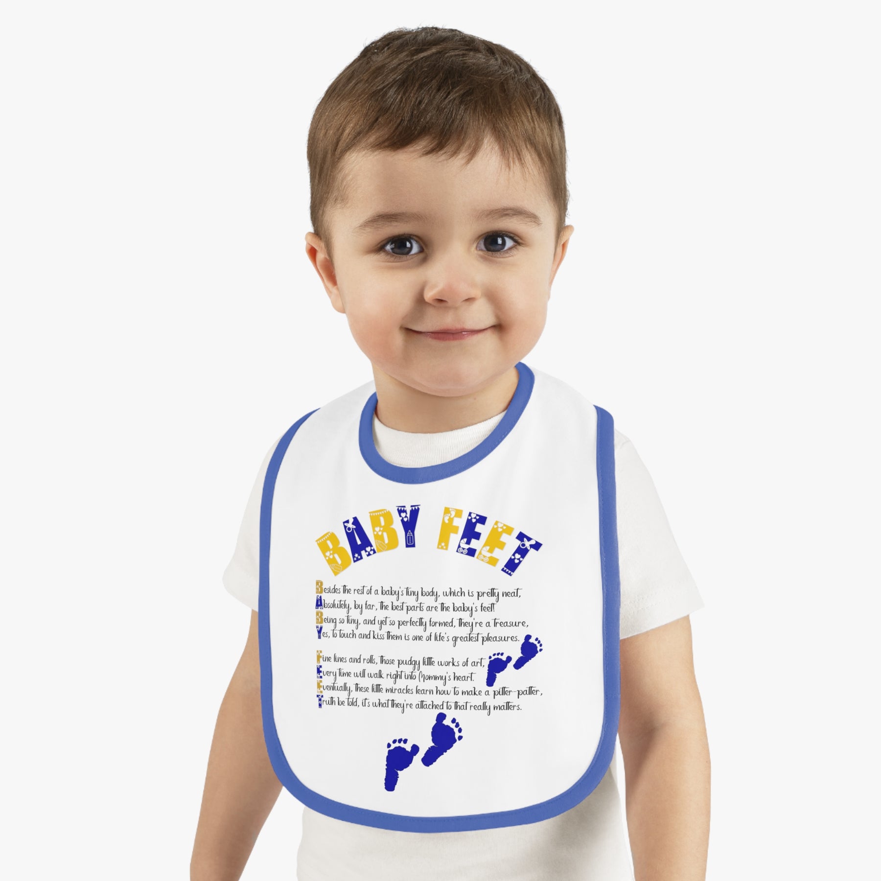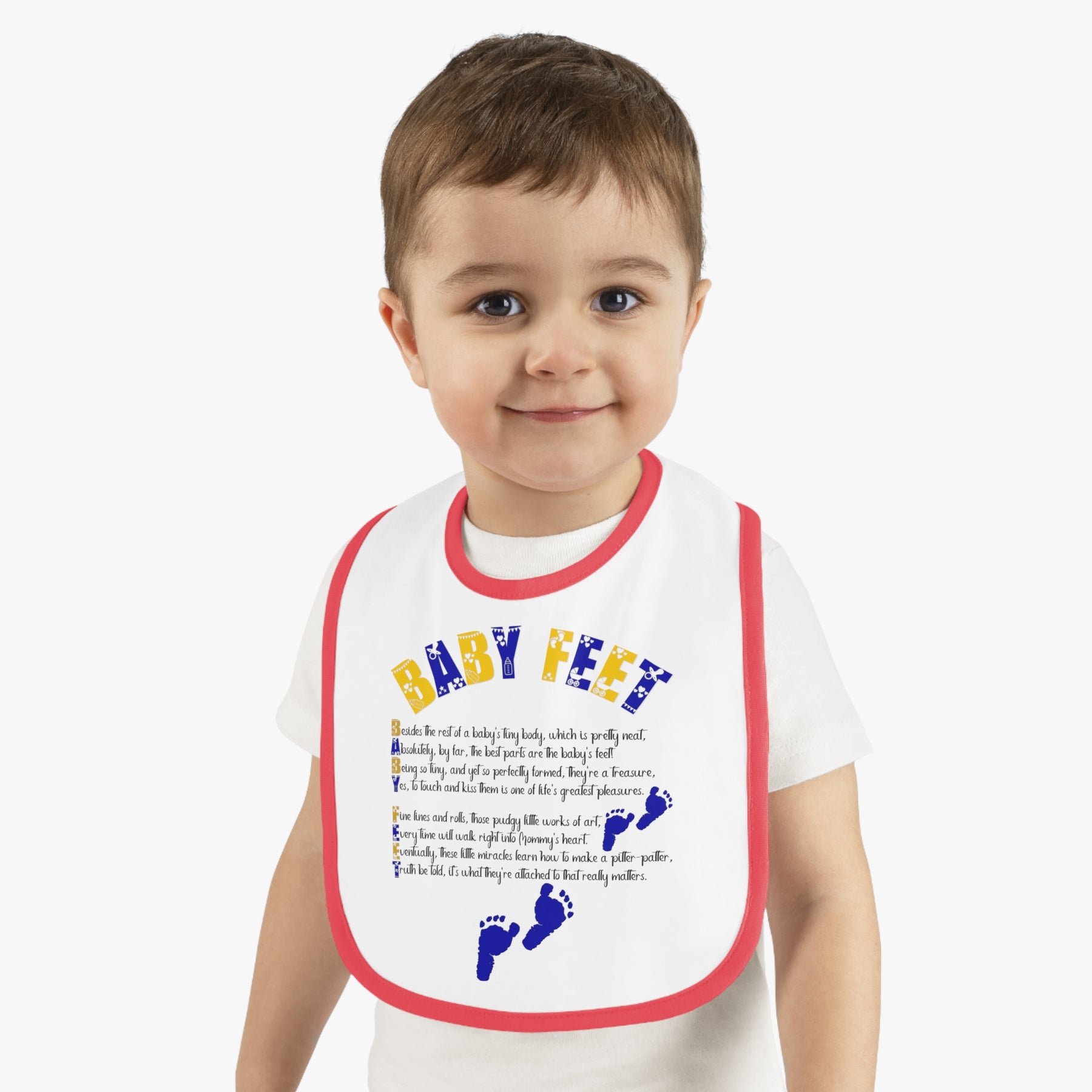 Mealtimes just became more fun with our "Baby Steps" baby bib collection. This one has an acrostic poem that spells out, "Baby Feet". Featuring a 100% Ring-spun Cotton fabric for delicate softness, an original Velcro® closure for a secure fit during meals, they are as adorable as they are comfy. Plus, the contrast self-fabric binding makes for a seamless look. These make a fantastic baby shower gift.