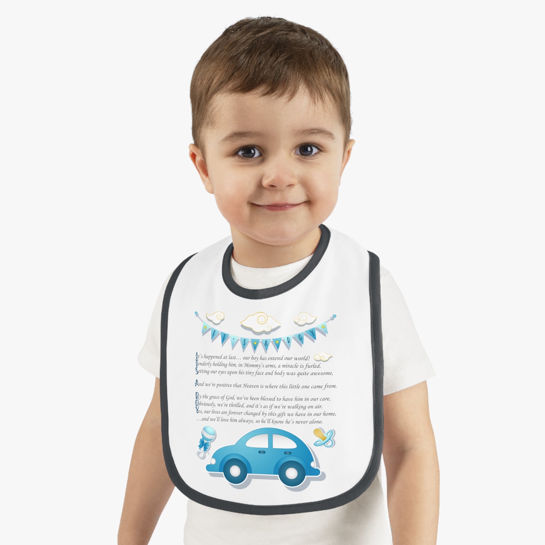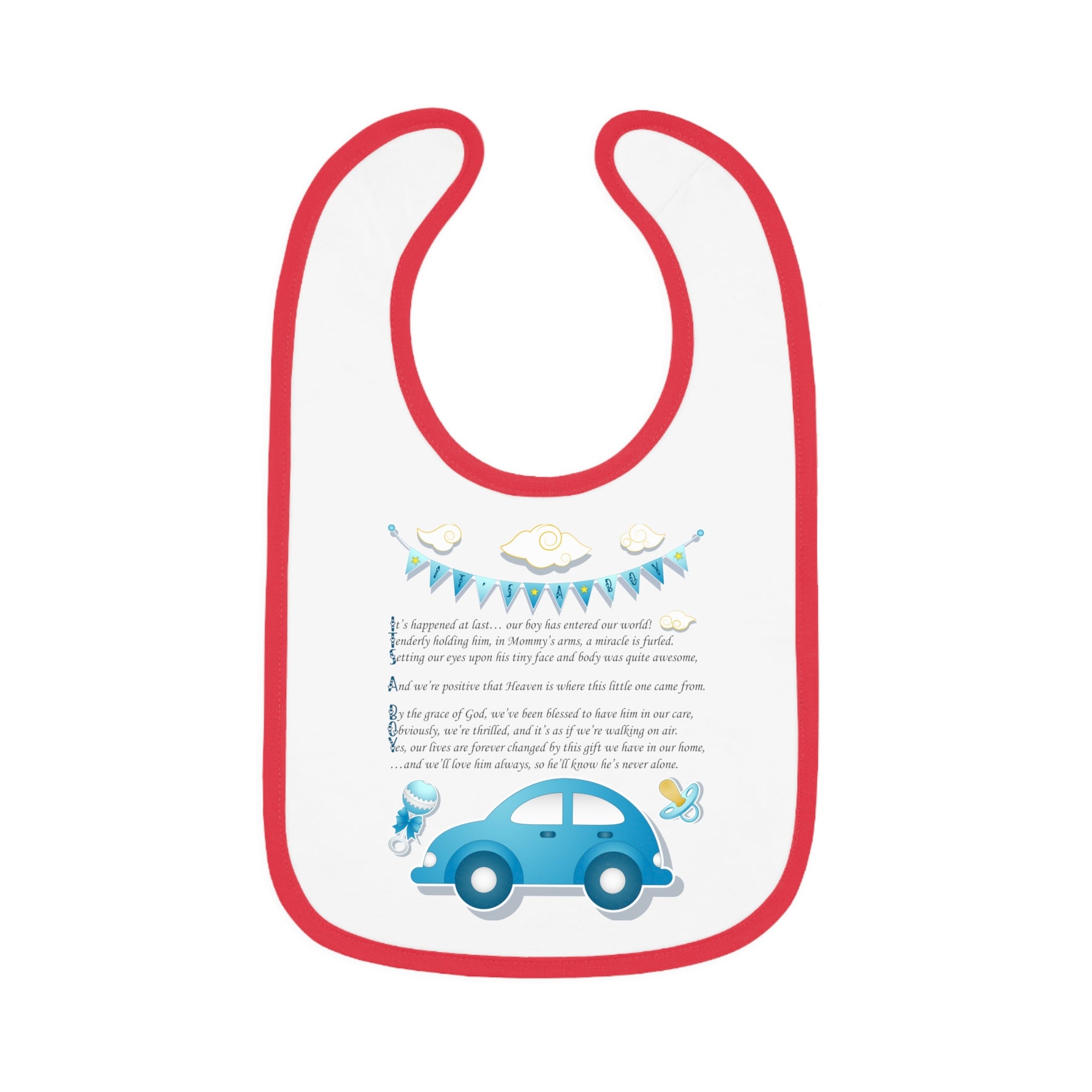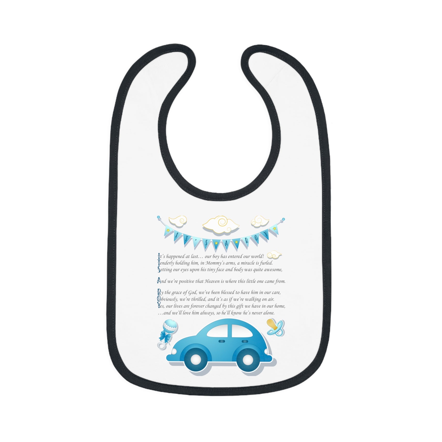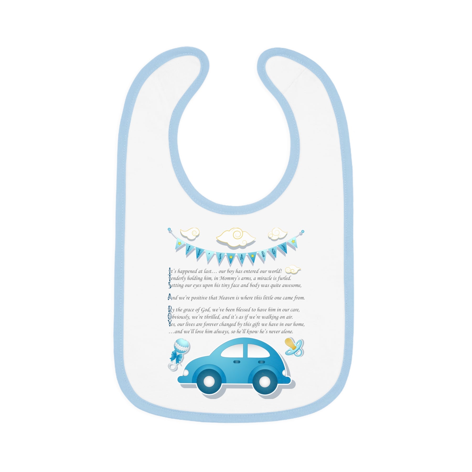 Mealtimes just became more fun with our "Baby Steps" baby bib collection. This one has an acrostic poem that spells out, "It's a Boy". Featuring a 100% Ring-spun Cotton fabric for delicate softness, an original Velcro® closure for a secure fit during meals, they are as adorable as they are comfy. Plus, the contrast self-fabric binding makes for a seamless look. These make a fantastic, unique baby shower gift!