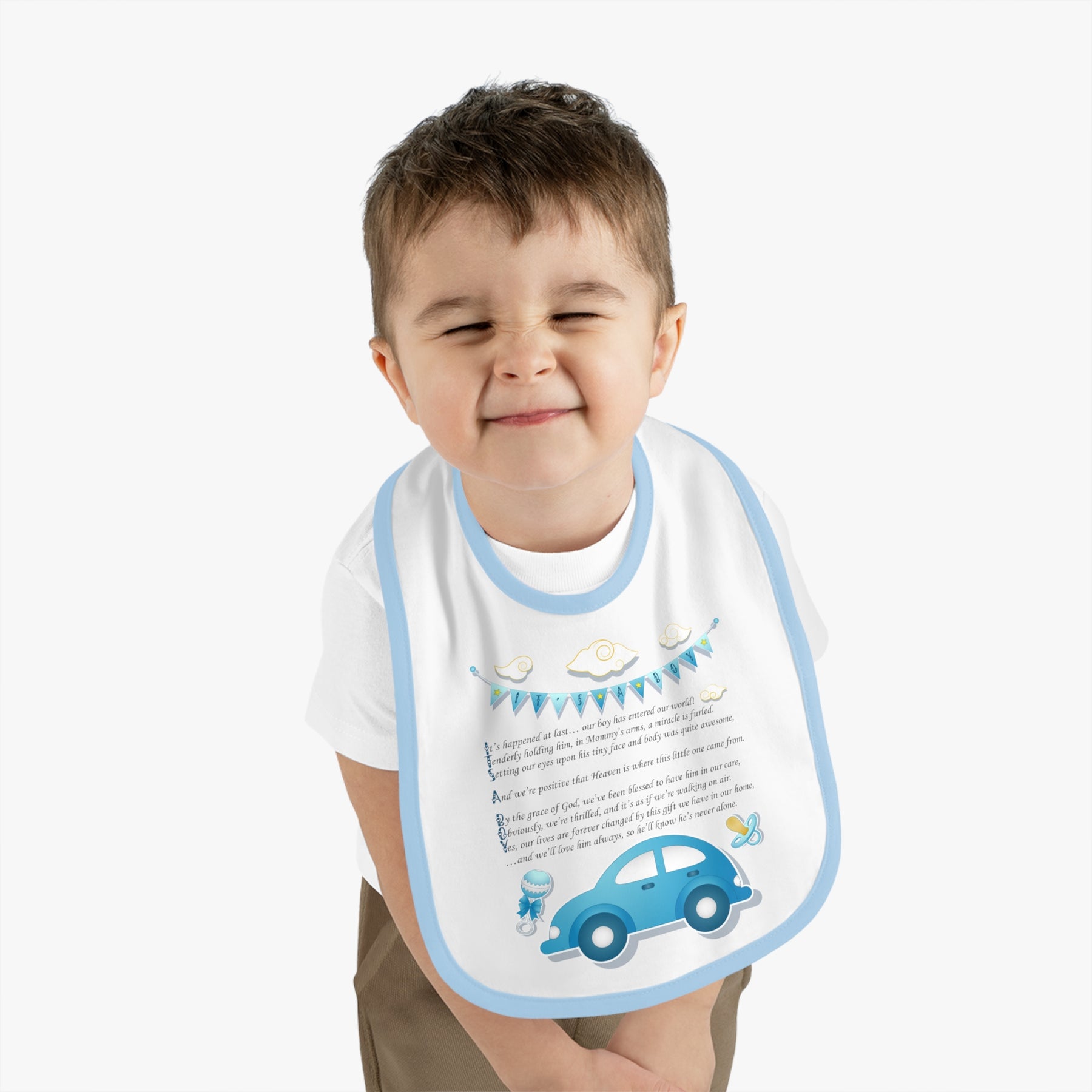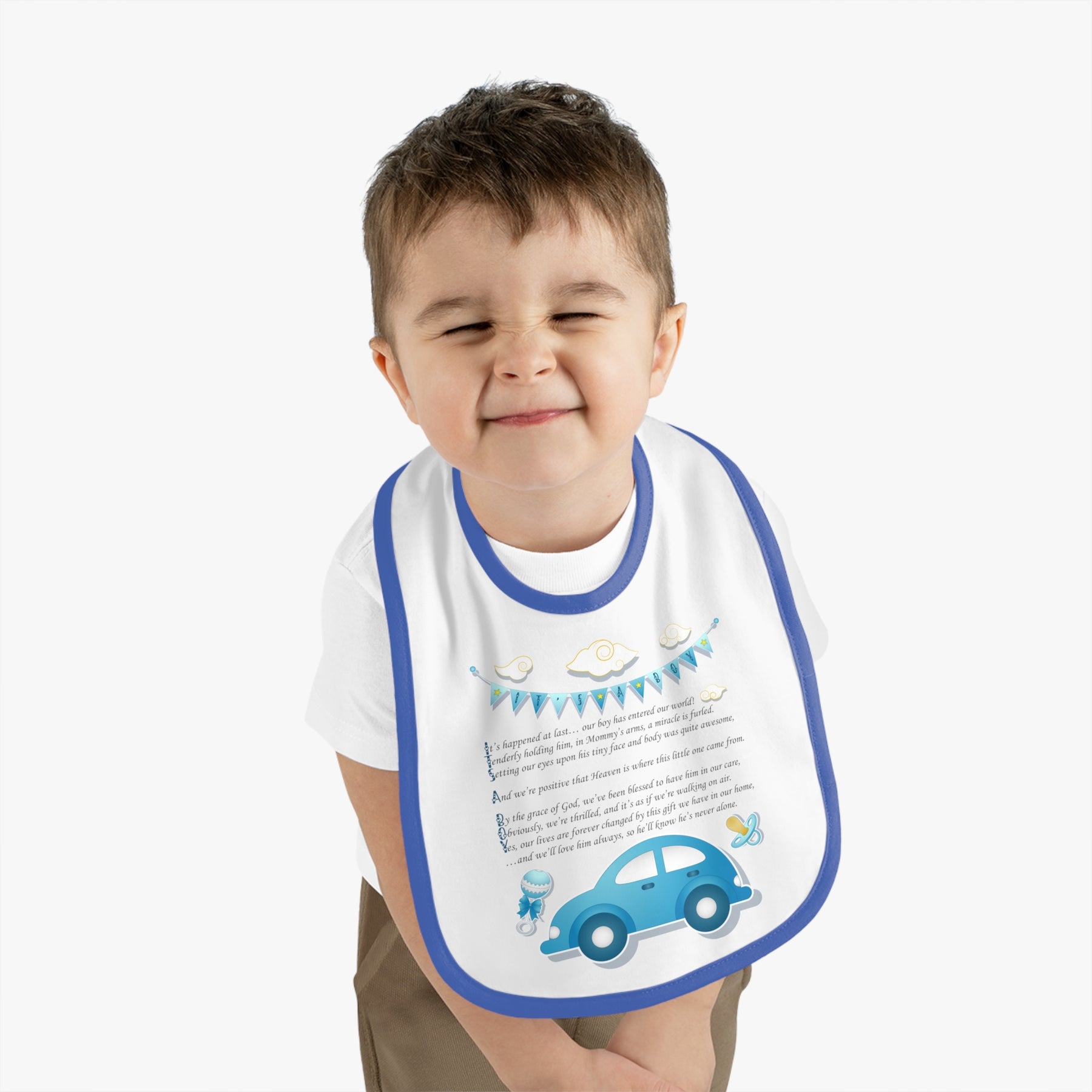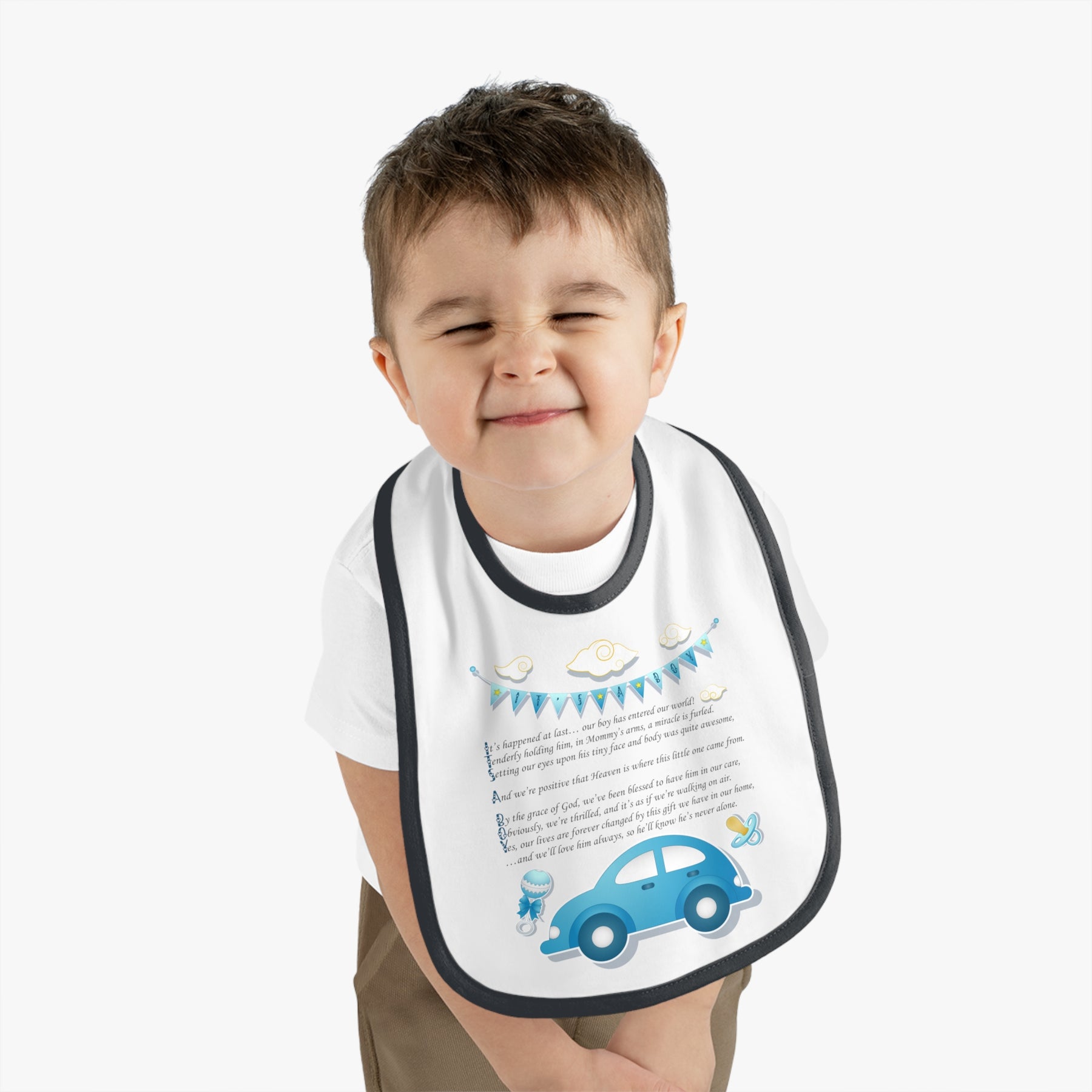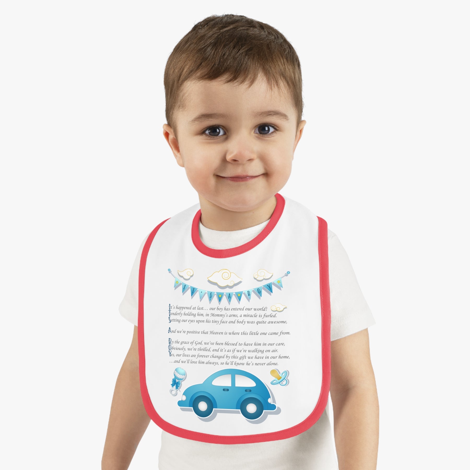 Mealtimes just became more fun with our "Baby Steps" baby bib collection. This one has an acrostic poem that spells out, "It's a Boy". Featuring a 100% Ring-spun Cotton fabric for delicate softness, an original Velcro® closure for a secure fit during meals, they are as adorable as they are comfy. Plus, the contrast self-fabric binding makes for a seamless look. These make a fantastic, unique baby shower gift!