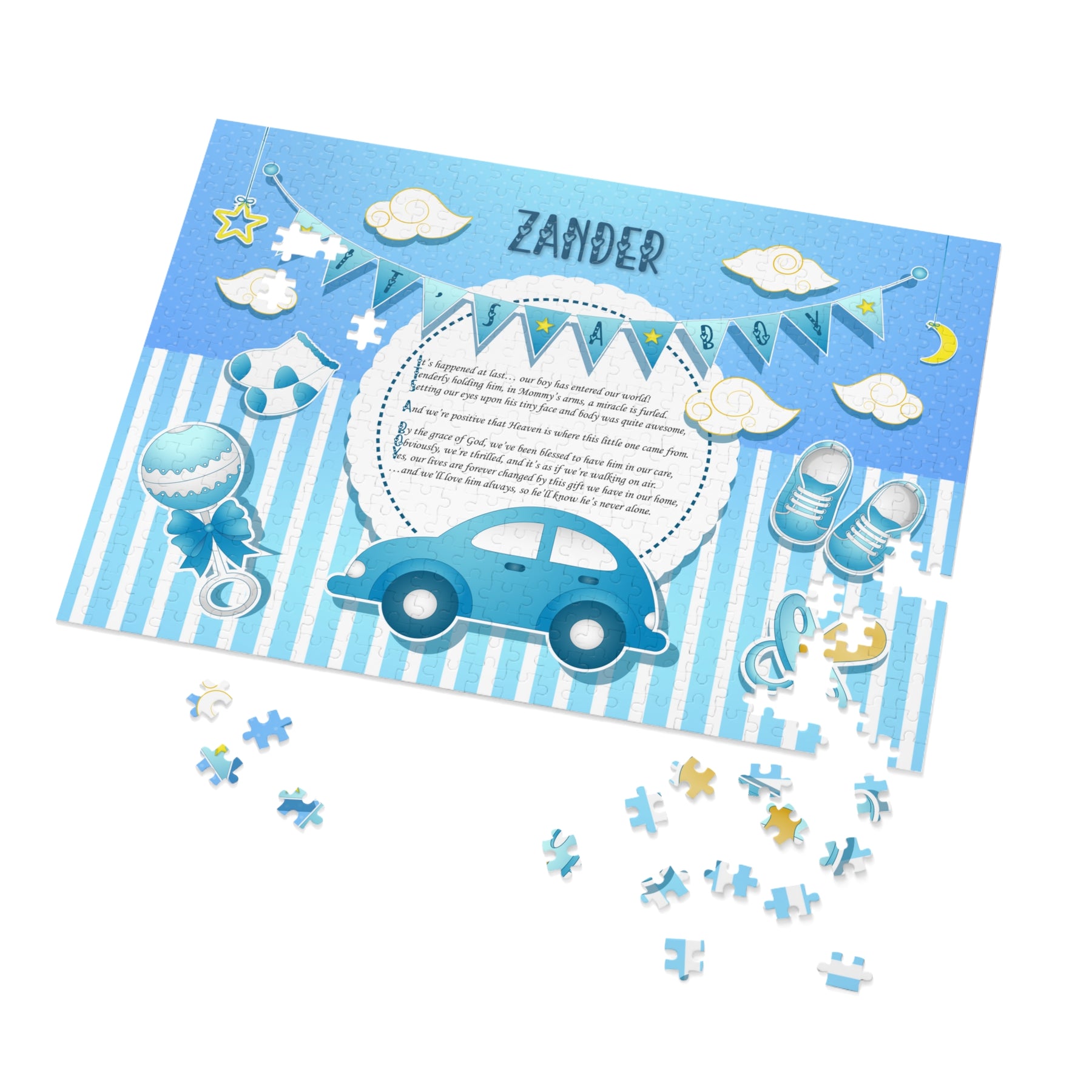 Check out our It's Just a Phrase, It's a Boy Acrostic Poem Puzzle from Moments in Rhyme. This is a fun activity your guests can enjoy during your baby shower, and it’s sure to be a hit. It also makes a thoughtful keepsake or a gift for another new mom. The puzzle is made from sturdy board with a glossy finish and comes in a gift-ready tin box that shows off the design. You can choose from several sizes. Just enter the baby's first name at checkout. We'll take it from there.