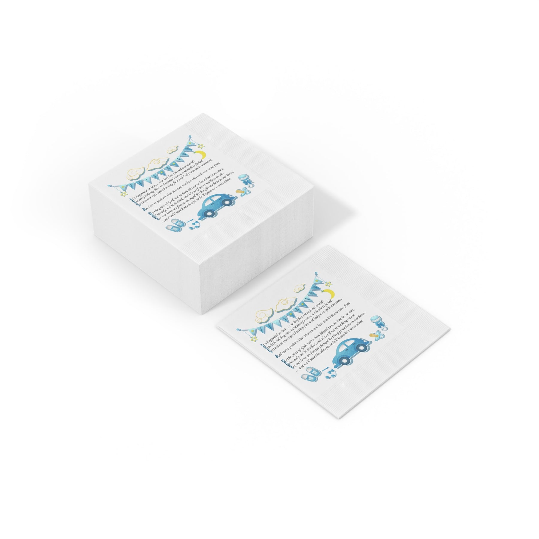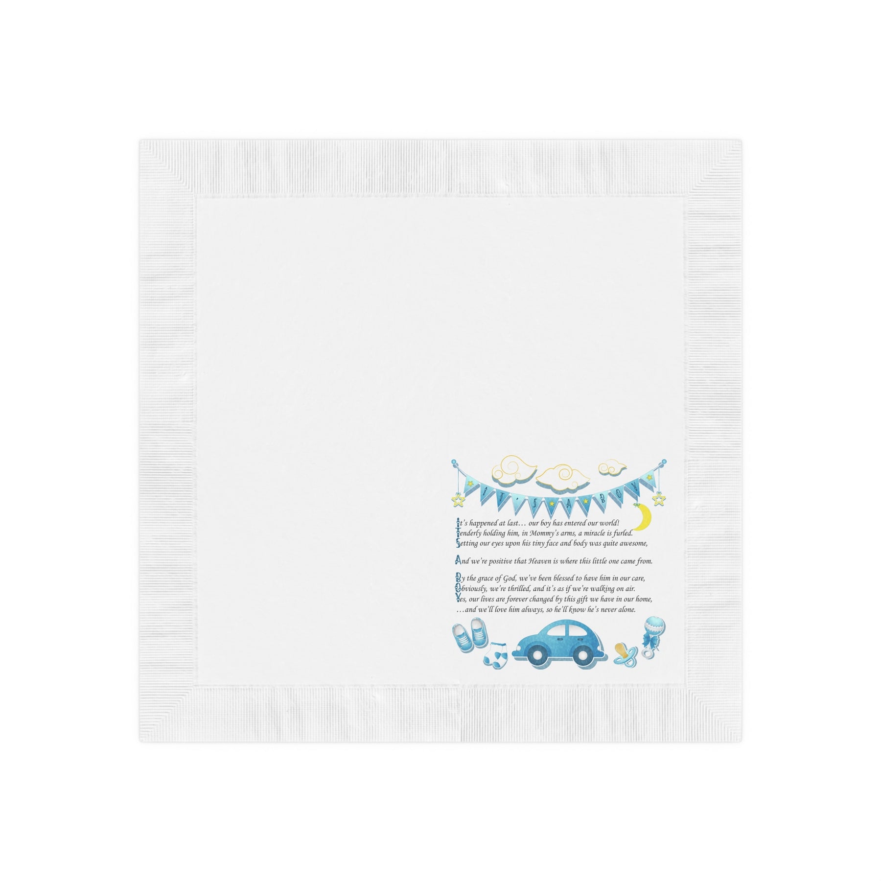 Moments in Rhyme's "Baby Steps" Collection features these soft, three-ply white coined napkins spelling out "It's a Boy" with a heartfelt, sweet acrostic poem. With a smooth texture and coined edge borders, these napkins are perfect for any baby shower. Add the "It's a Boy" selection of matching products, including balloons, a table runner, a puzzle, and a backdrop.