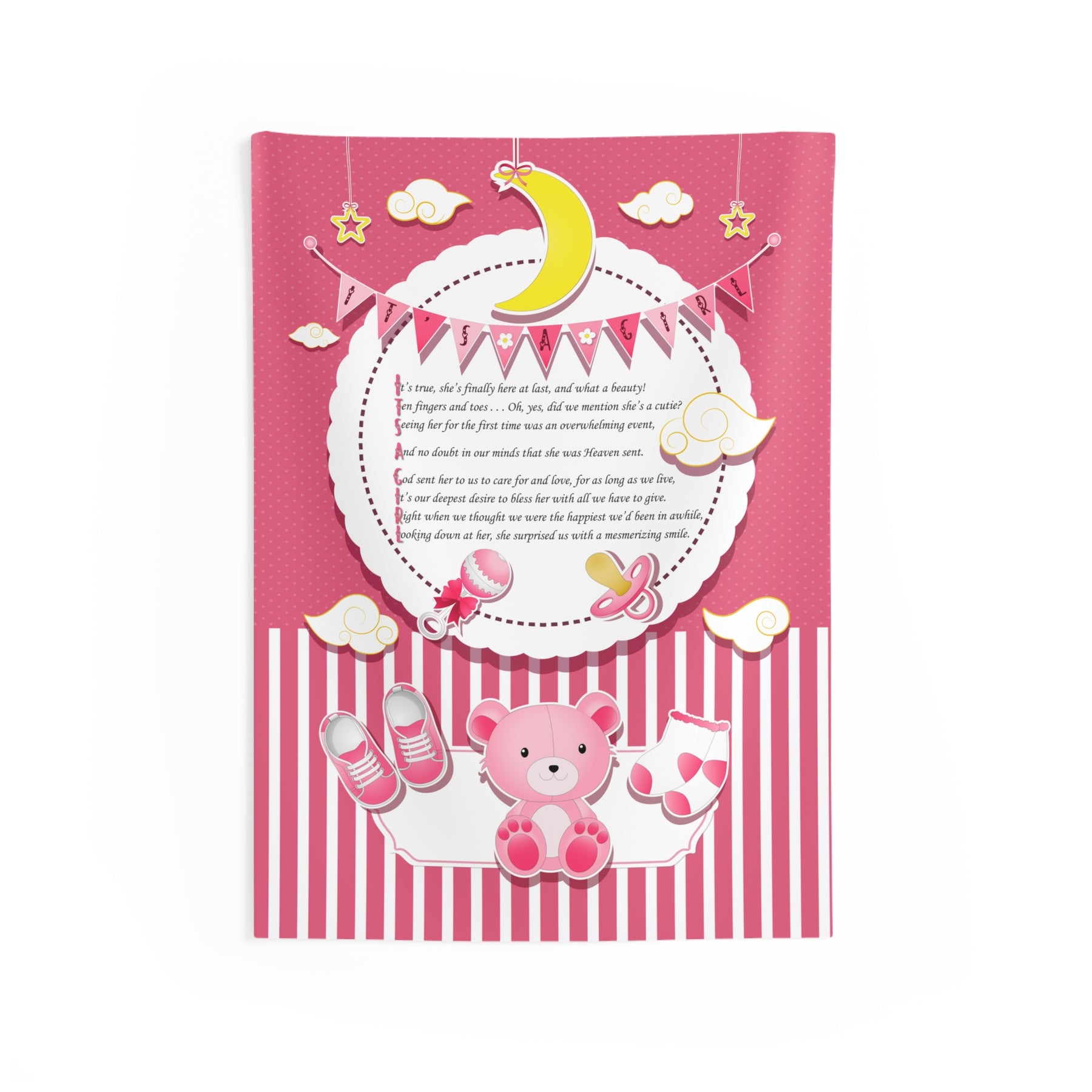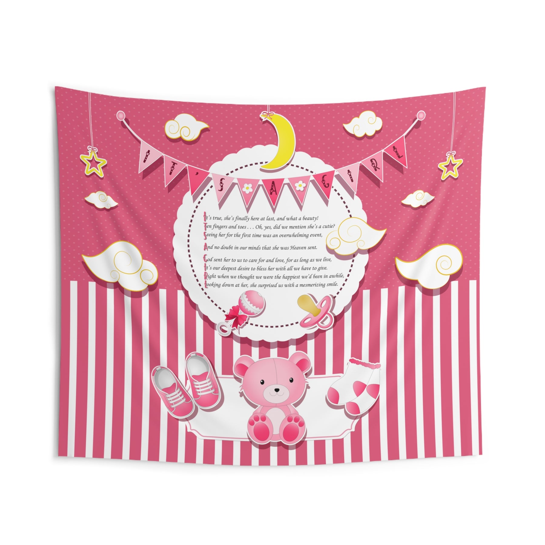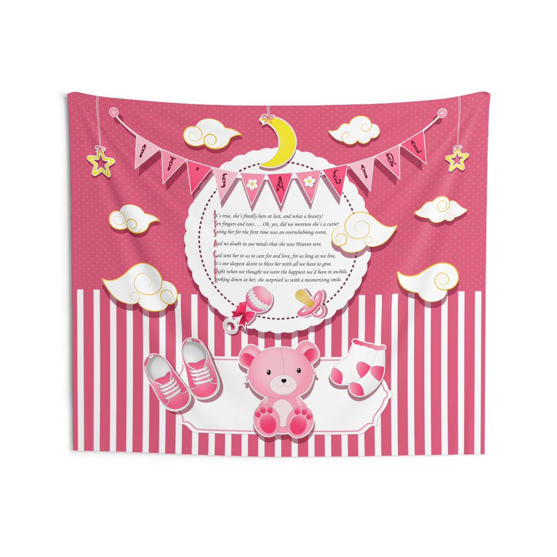 Transform the atmosphere of any baby shower with our "It's a Girl" indoor wall tapestry/backdrop. This darling design features pink and white stripes, an acrostic poem spelling out "It's a Girl, and a heartfelt message to welcome a new baby boy. Advanced printing techniques ensure every detail is perfect, no matter how intricate the design. With a variety of sizes to choose from, you can create the perfect look for your special occasion.