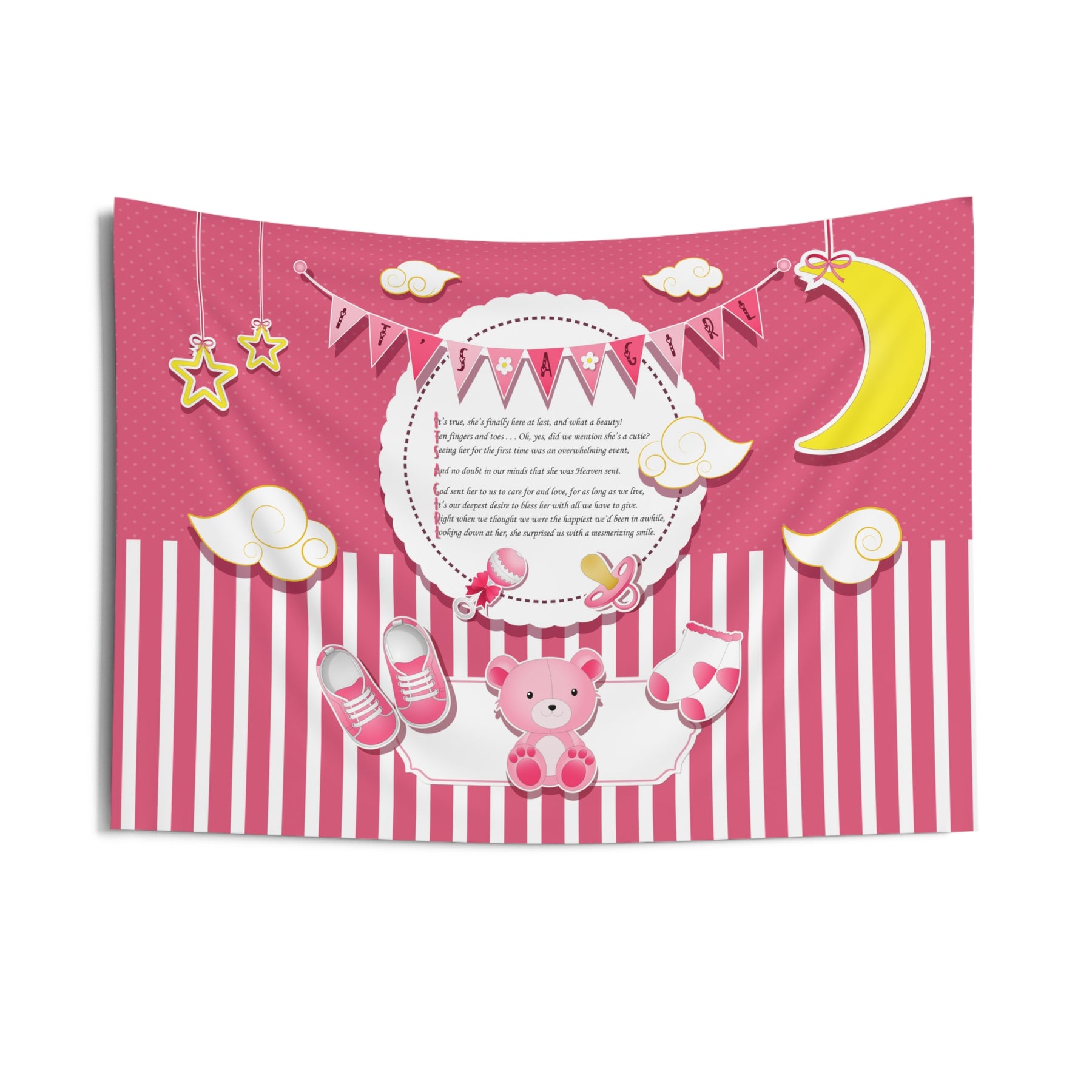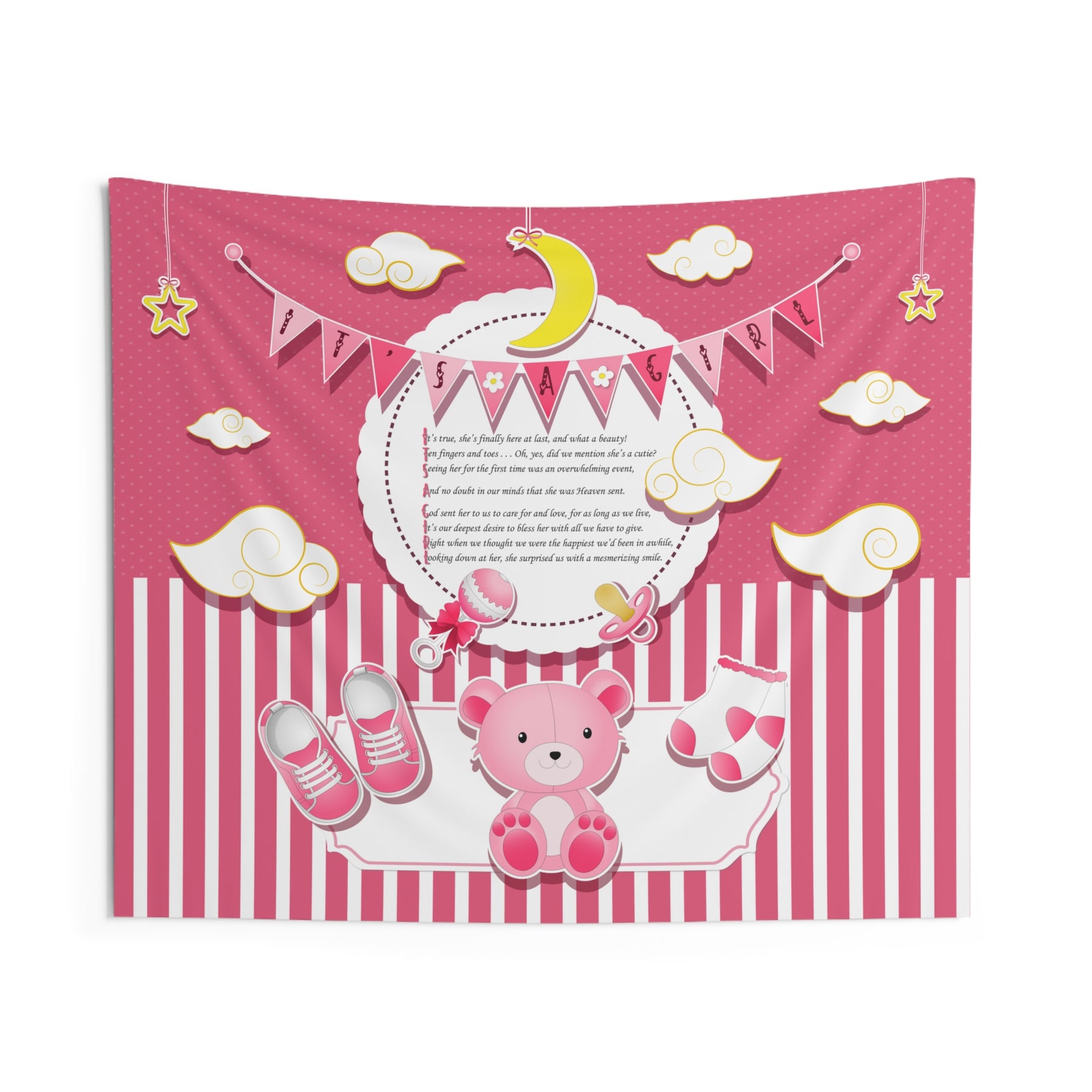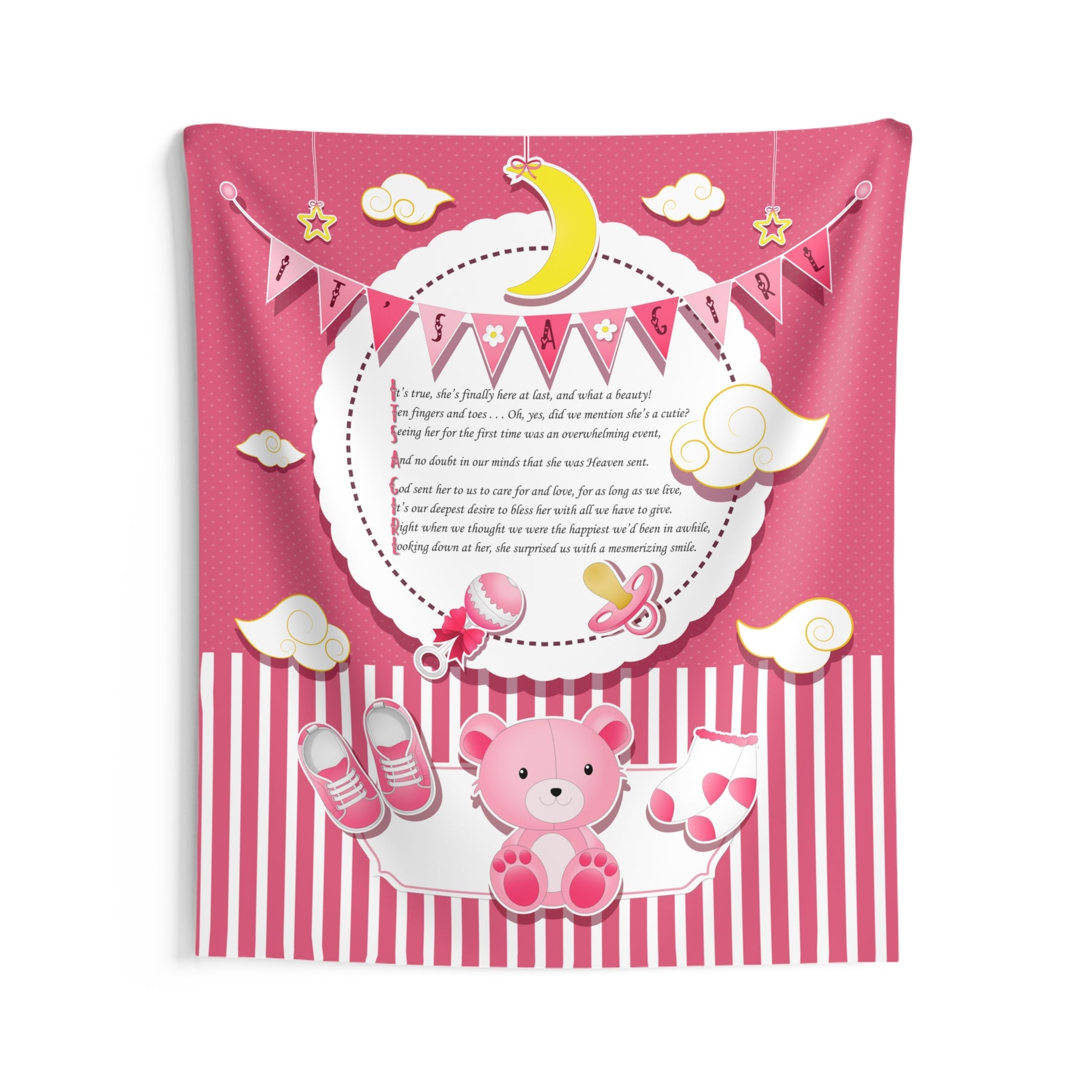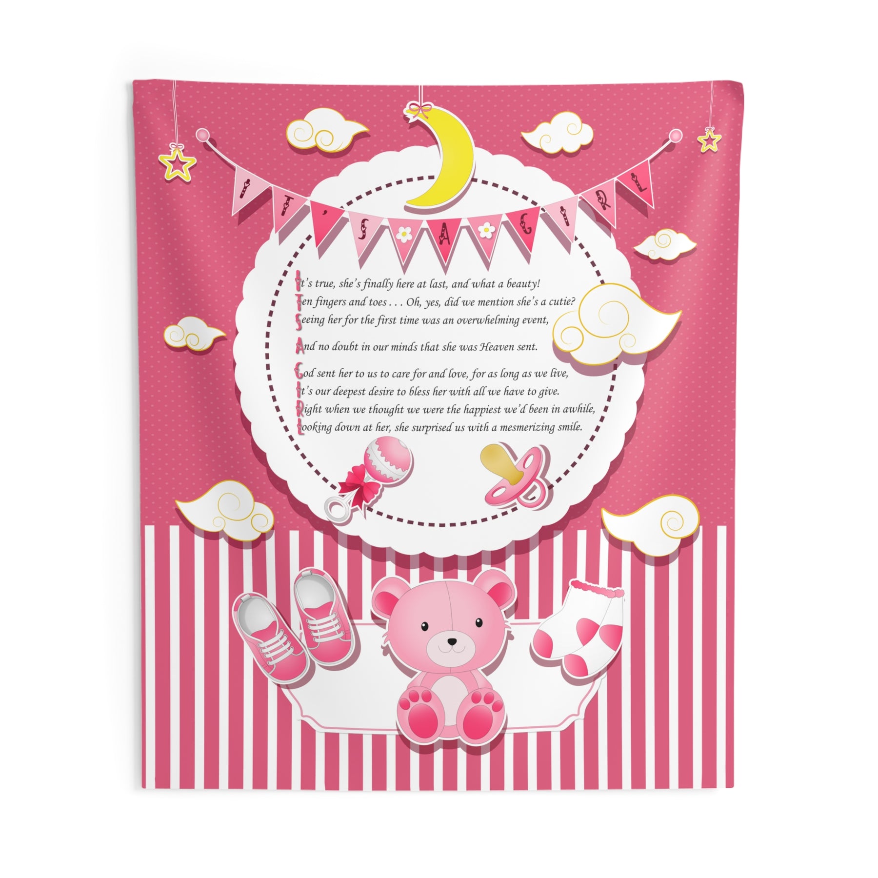 Transform the atmosphere of any baby shower with our "It's a Girl" indoor wall tapestry/backdrop. This darling design features pink and white stripes, an acrostic poem spelling out "It's a Girl, and a heartfelt message to welcome a new baby boy. Advanced printing techniques ensure every detail is perfect, no matter how intricate the design. With a variety of sizes to choose from, you can create the perfect look for your special occasion.