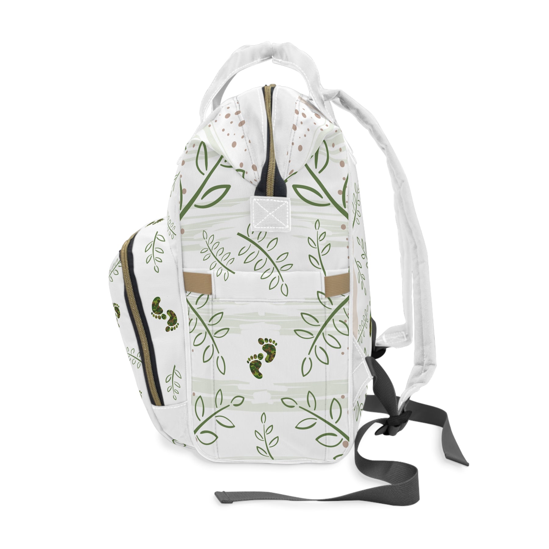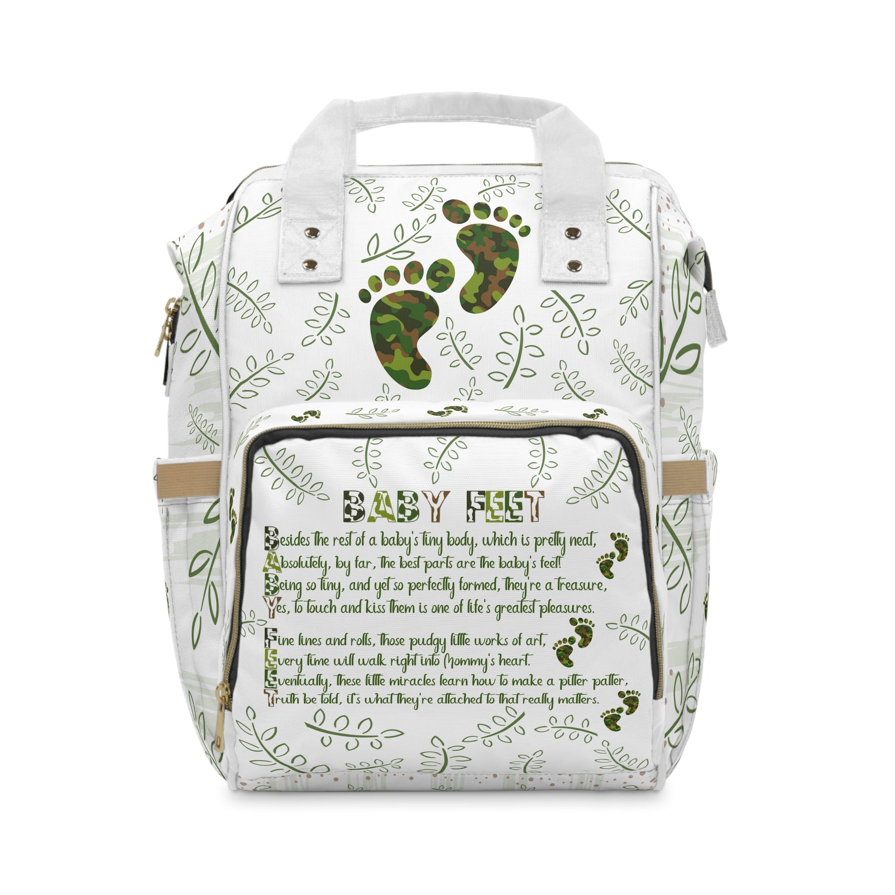 Looking for a bag that fits all your baby’s essentials? The Baby Steps acrostic poem, Baby Feet diaper backpack from Moments in Rhyme, is spacious, sturdy, and ready for busy days. The adorable camo baby feet and font add to the charm of this diaper backpack. It’s great for errands or outings with toddlers, with room for bottles, wipes, and diapers. Made from lightweight, high-quality nylon, it is designed to withstand wear and tear. The open layout includes a main zippered pocket, three elastic pockets, and a net pocket for easy access. Adjustable shoulder straps, a padded back, and a cream interior lining add comfort and style. The bag measures 15.0 by 10.8 by 6.7 inches.