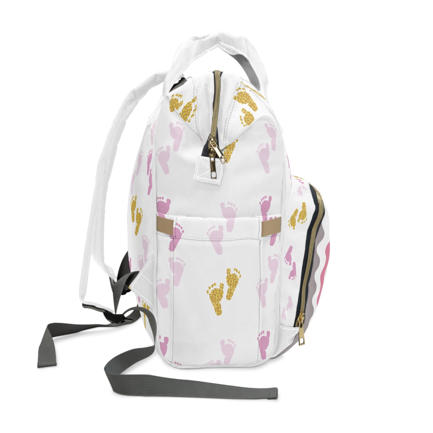Looking for a bag that fits all your baby’s essentials? The Baby Steps acrostic poem, Baby Feet diaper backpack from Moments in Rhyme, is spacious, sturdy, and ready for busy days. Adorable gold and pink baby feet add to the charm of this diaper backpack. It’s great for errands or outings with toddlers, with room for bottles, wipes, and diapers. Made from lightweight, high-quality nylon, it is designed to withstand wear and tear. The open layout includes a main zippered pocket, three elastic pockets, and a net pocket for easy access. Adjustable shoulder straps, a padded back, and a cream interior lining add comfort and style. The bag measures 15.0 by 10.8 by 6.7 inches.