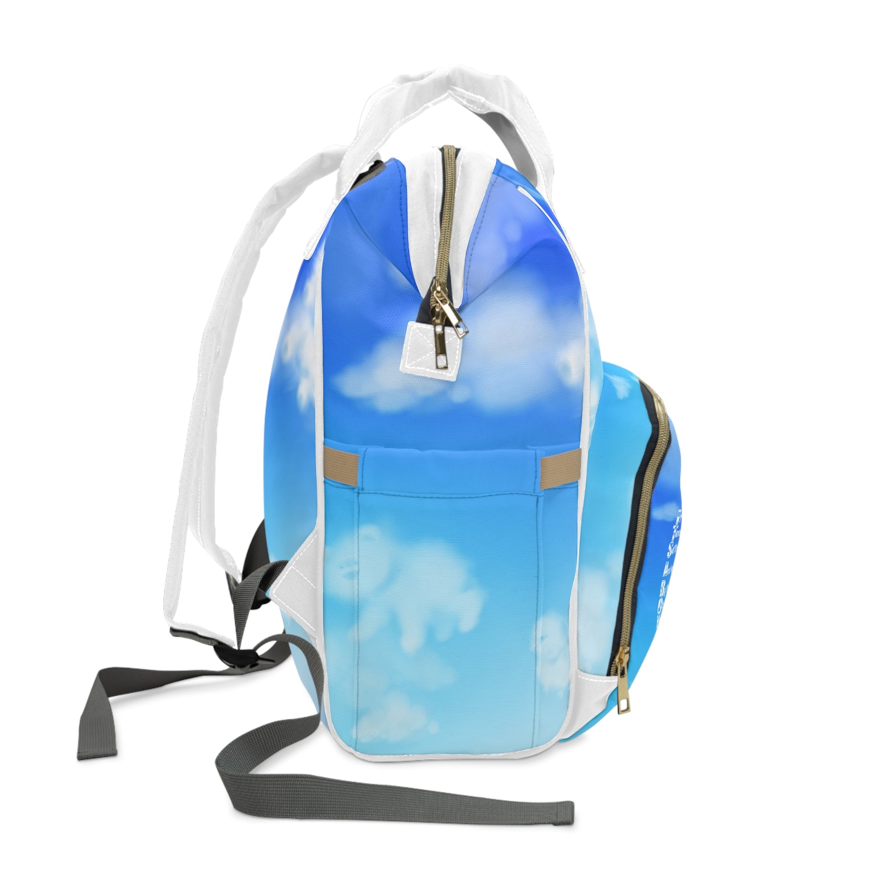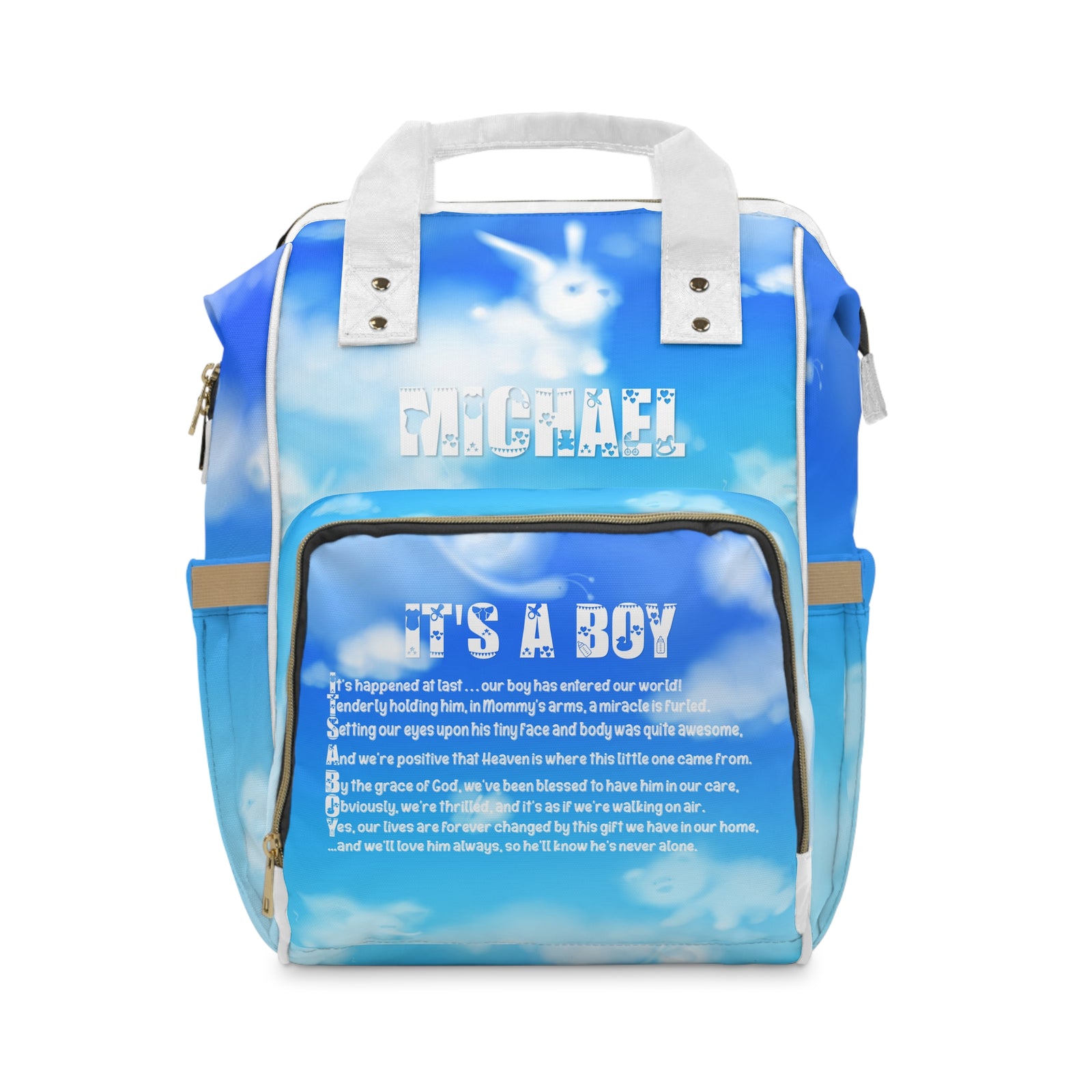 Looking for a bag that fits all your baby’s essentials? The Baby Steps acrostic poem, It's a Boy diaper backpack from Moments in Rhyme, is spacious, sturdy, and ready for busy days. The adorable cloud animals and font add to the charm of this diaper backpack. It’s great for errands or outings with toddlers, with room for bottles, wipes, and diapers. Made from lightweight, high-quality nylon, it is designed to withstand wear and tear. The open layout includes a main zippered pocket, three elastic pockets, and a net pocket for easy access. Adjustable shoulder straps, a padded back, and a cream interior lining add comfort and style. The bag measures 15.0 by 10.8 by 6.7 inches. To personalize, just let us know the baby's first name you'd like on this product, and we’ll take care of the rest.