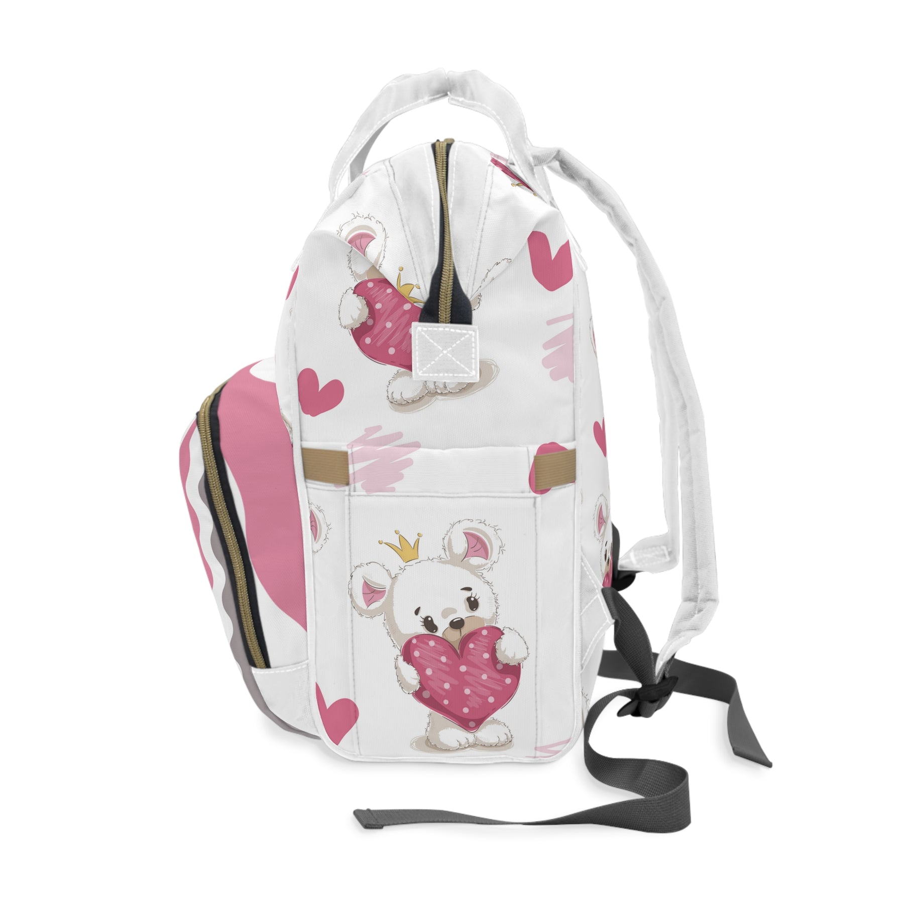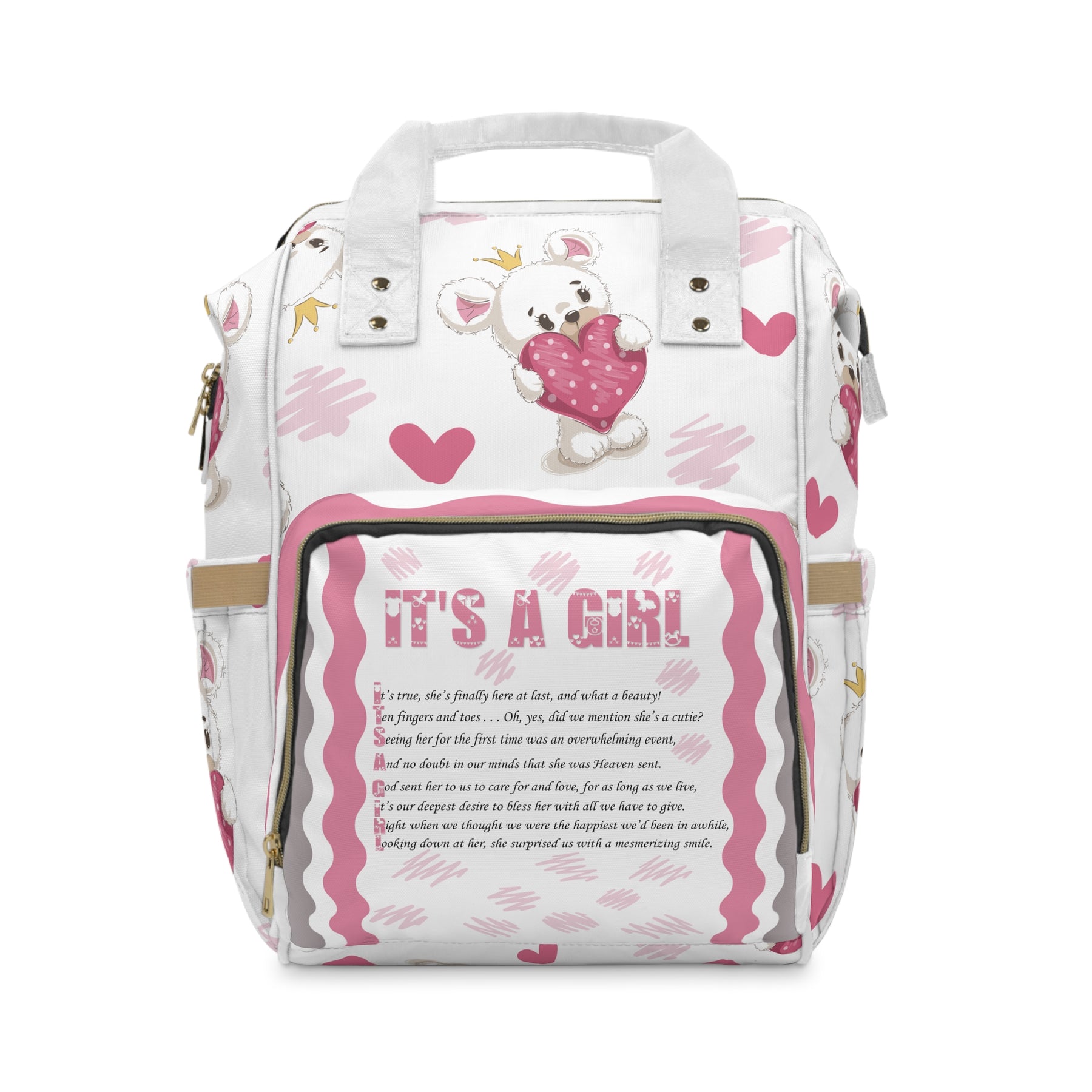 Looking for a bag that fits all your baby’s essentials? The Baby Steps acrostic poem, It's a Girl diaper backpack from Moments in Rhyme, is spacious, sturdy, and ready for busy days. The adorable Teddy Bear and Heart design, along with the font, add to the charm of this diaper backpack. It’s great for errands or outings with toddlers, with room for bottles, wipes, and diapers. Made from lightweight, high-quality nylon, it is designed to withstand wear and tear. The open layout includes a main zippered pocket, three elastic pockets, and a net pocket for easy access. Adjustable shoulder straps, a padded back, and a cream interior lining add comfort and style. The bag measures 15.0 by 10.8 by 6.7 inches. 6.7 inches.