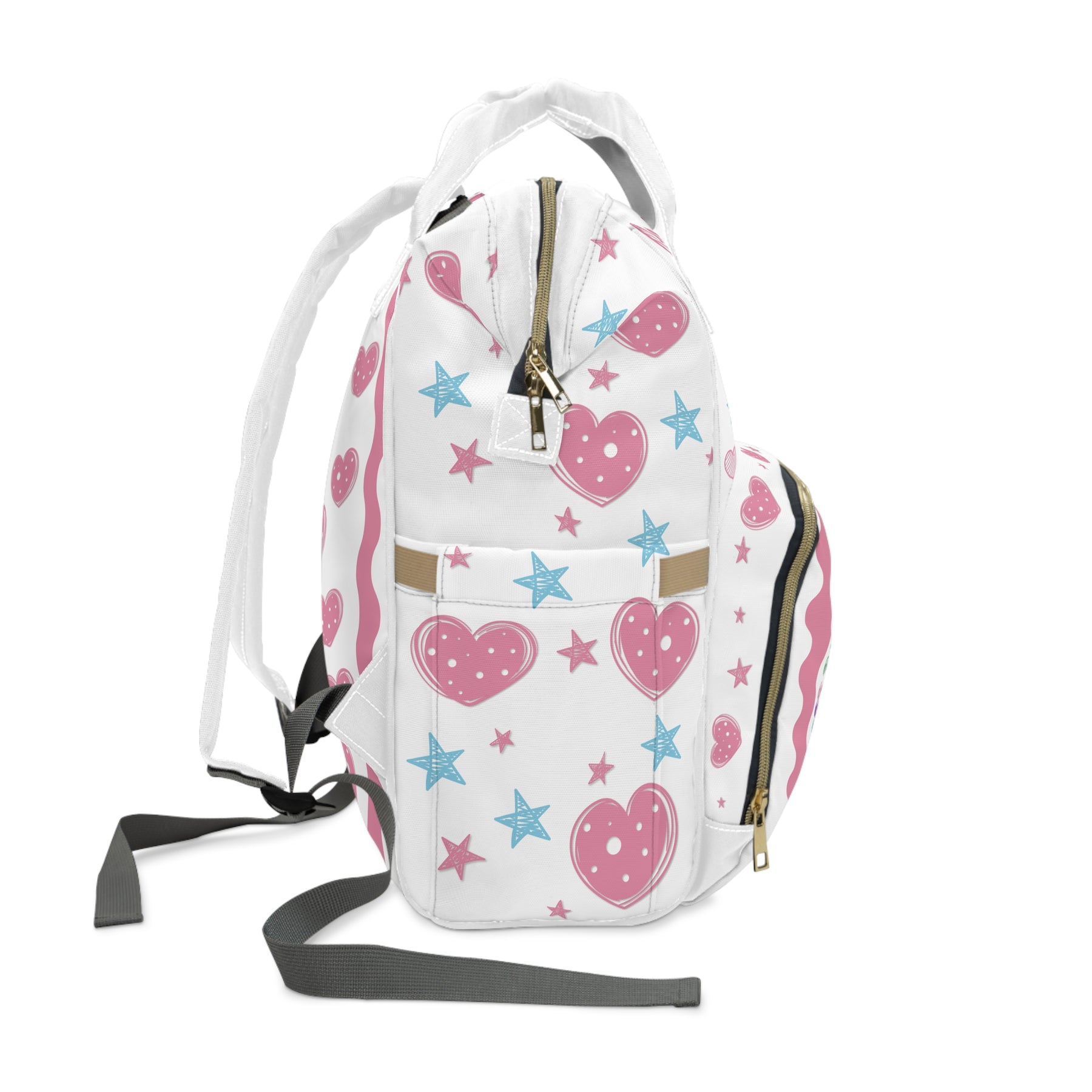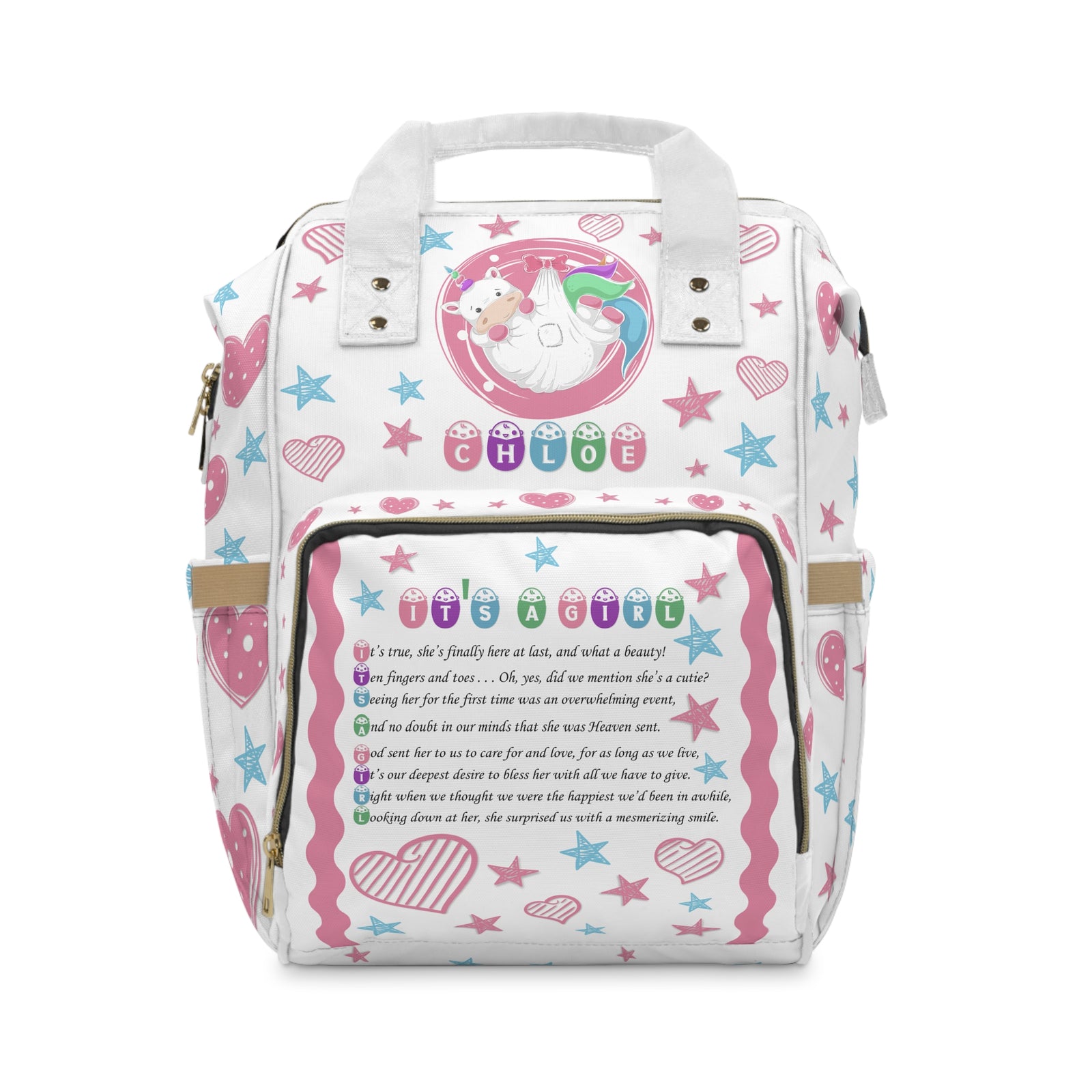 Looking for a bag that fits all your baby’s essentials? The Baby Steps acrostic poem, It's a Girl diaper backpack from Moments in Rhyme, is spacious, sturdy, and ready for busy days. The adorable Baby Unicorn design and font add to the charm of this diaper backpack. It’s great for errands or outings with toddlers, with room for bottles, wipes, and diapers. Made from lightweight, high-quality nylon, it is designed to withstand wear and tear. The open layout includes a main zippered pocket, three elastic pockets, and a net pocket for easy access. Adjustable shoulder straps, a padded back, and a cream interior lining add comfort and style. The bag measures 15.0 by 10.8 by 6.7 inches. To personalize, just let us know the baby's first name you'd like on this product, and we’ll take care of the rest.