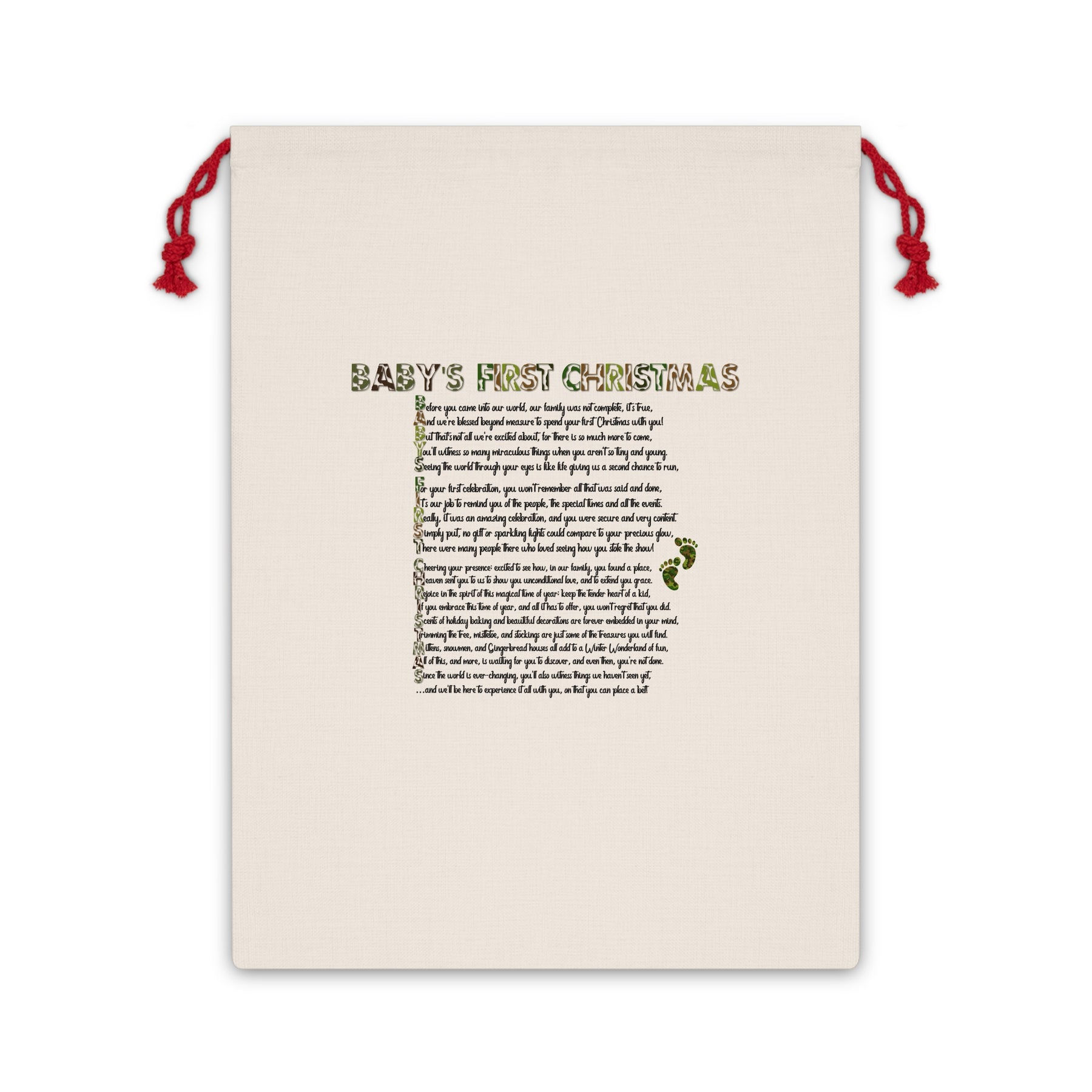 Moments in Rhyme introduces Baby Steps, Baby's First Christmas, a stylish gift bag featuring an adorable camo baby foot design that adds a unique touch to any baby shower. Its vintage look evokes nostalgia while keeping presents secure. This bag will be an eye-catcher and a conversation starter. The spacious interior allows for multiple gifts, making it a versatile choice. With a secure drawstring closure, it is both functional and chic. Designed for those who value creativity and thoughtfulness in gift-giving. This will become a lifetime keepsake. Made from 95% polyester and 5% cotton. Spot clean only. Do not bleach.