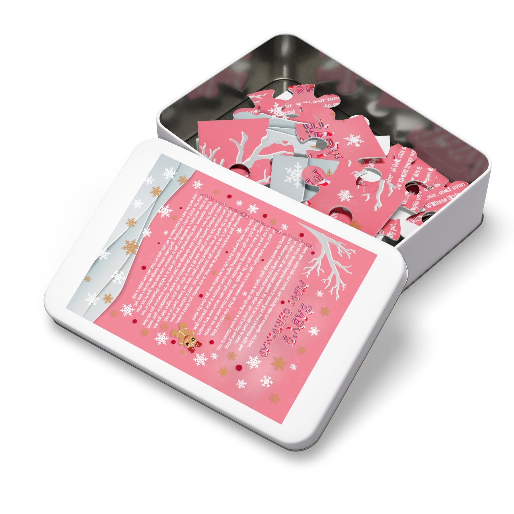 Celebrate the holidays with our Baby Steps jigsaw puzzle, featuring an acrostic poem that spells out Baby's First Christmas in a super-cute Santa hat font. Designed as a lifetime keepsake, this puzzle will encourage your child to play with it each holiday season and remind them of how special they are. The heartfelt poem shares the story of their first Christmas and how much they added to the world, even though they do not remember that time. It makes a thoughtful gift for newborns and is sure to be treasured for years to come. Perfect for anyone marking a baby's first Christmas. Made from sturdy puzzle board with a glossy finish, it comes in a gift-ready tin box that highlights the design. Several sizes are available.